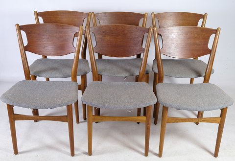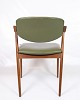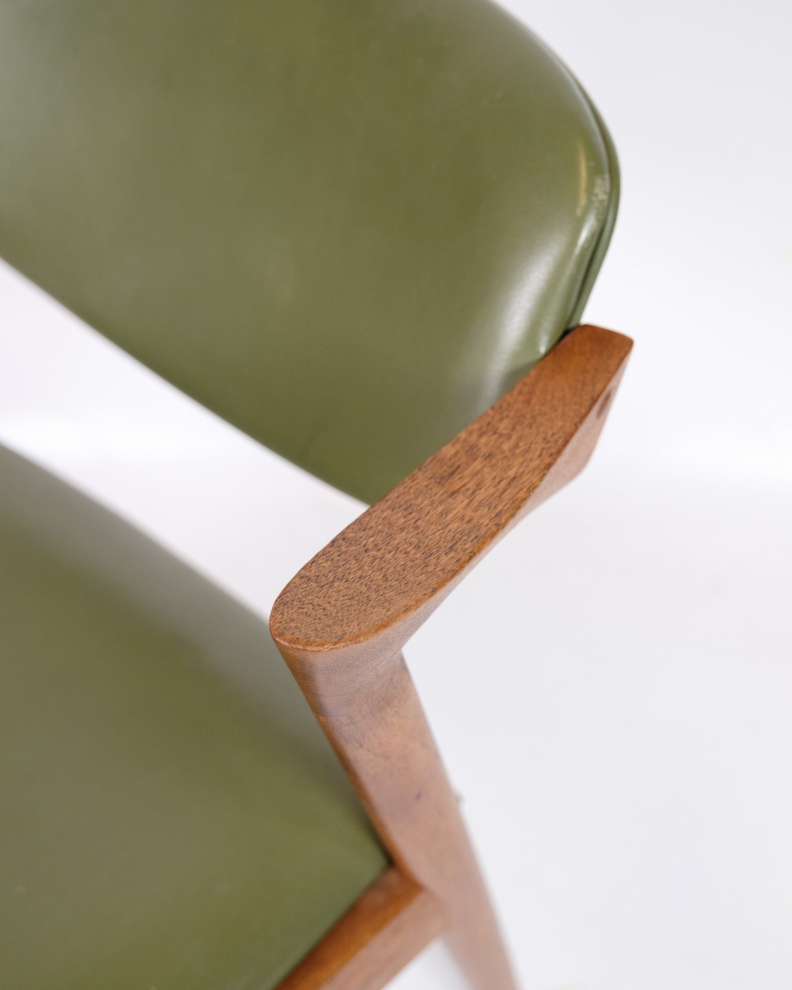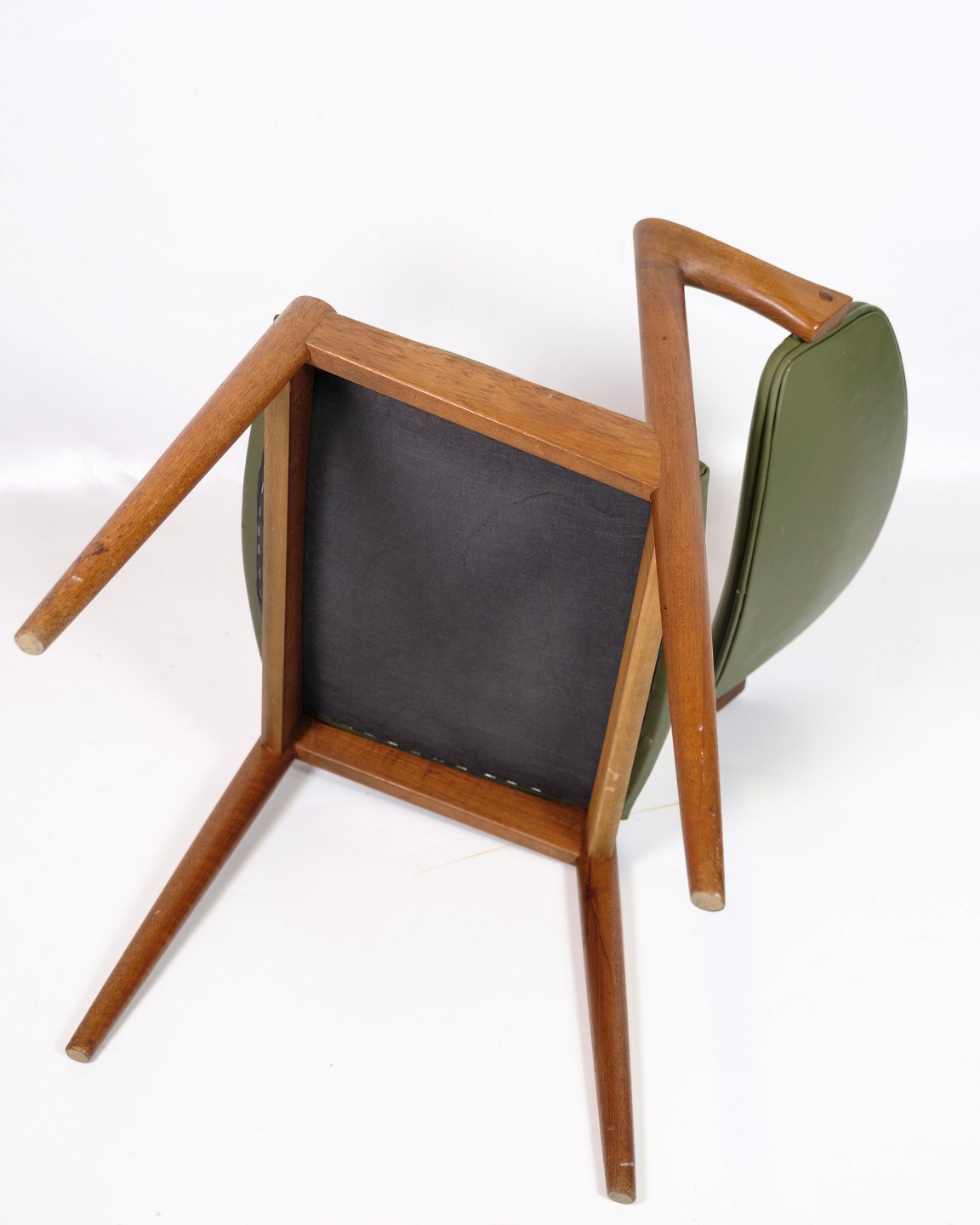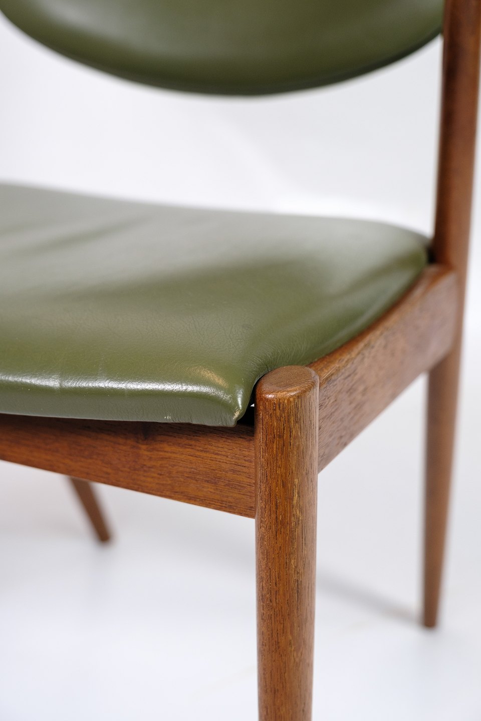 Set of 6 dining chairs, model 42, designed by Kai Kristiansen and produced by Schou Andersen in the 1960s. The chairs are made of teak, which gives them a warm and natural look, and they are upholstered in green leather. Model 42 is known for its ergonomic design with slanted backrests, which provide a comfortable sitting experience and good support.