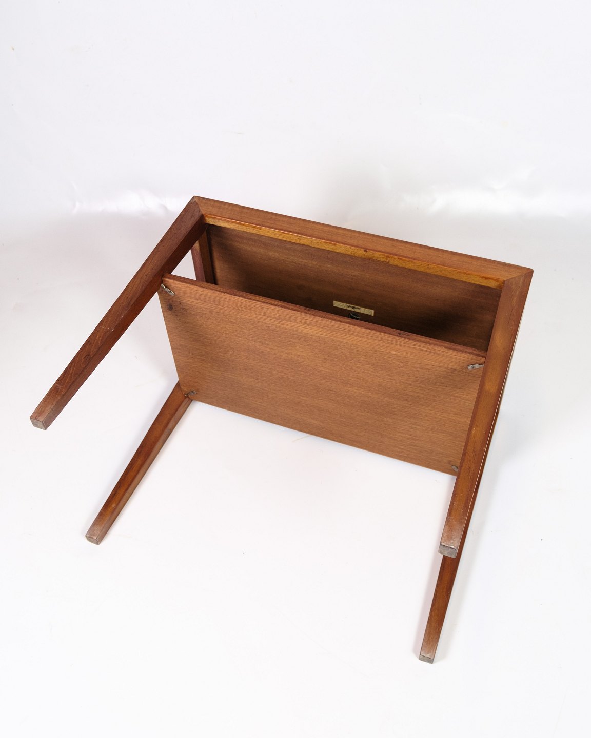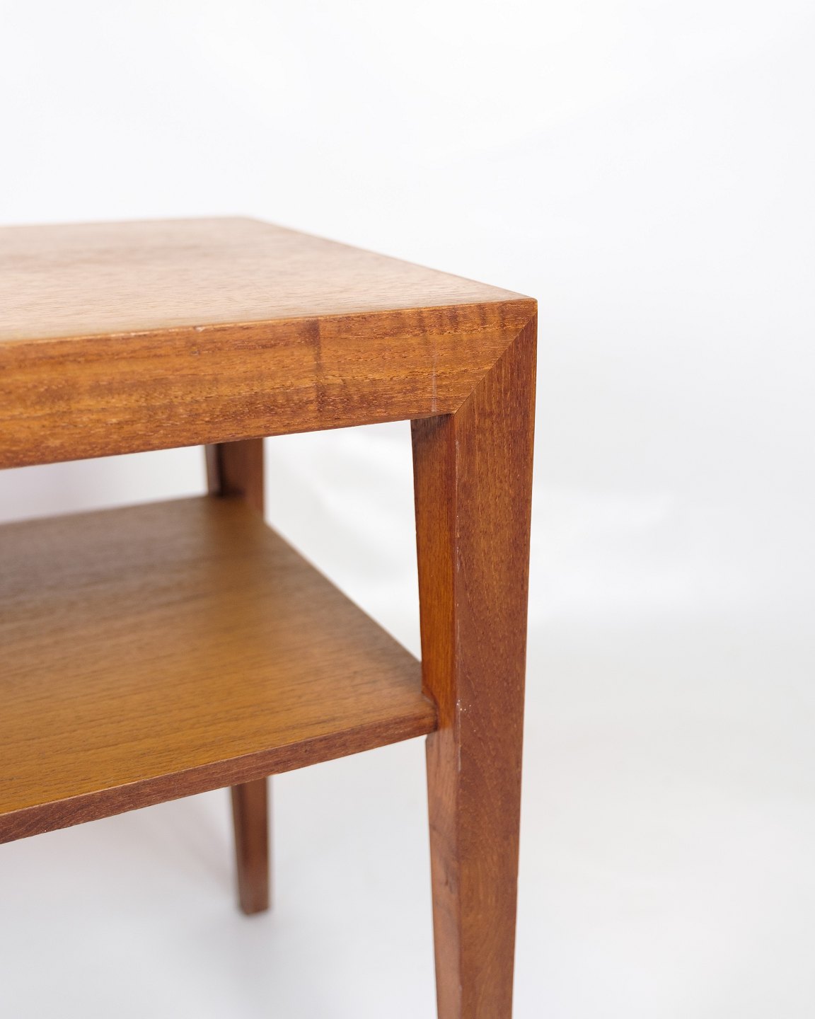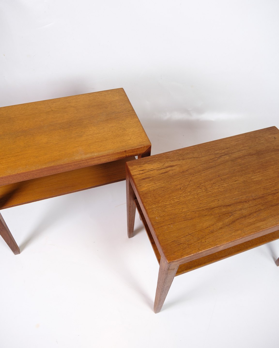 SoldSet of 2 teak side tables with shelf, designed by Severin Hansen and produced by Haslev Møbelfabrik in the 1960s. The tables have the characteristic and precise joinery that Hansen is known for, including the beautiful, slanted leg joints that elegantly meet the table top. The extra shelf provides practical storage space and makes the tables usable both as side tables and small coffee tables.