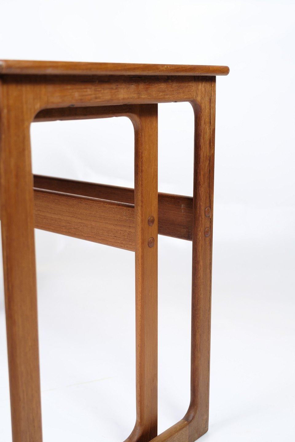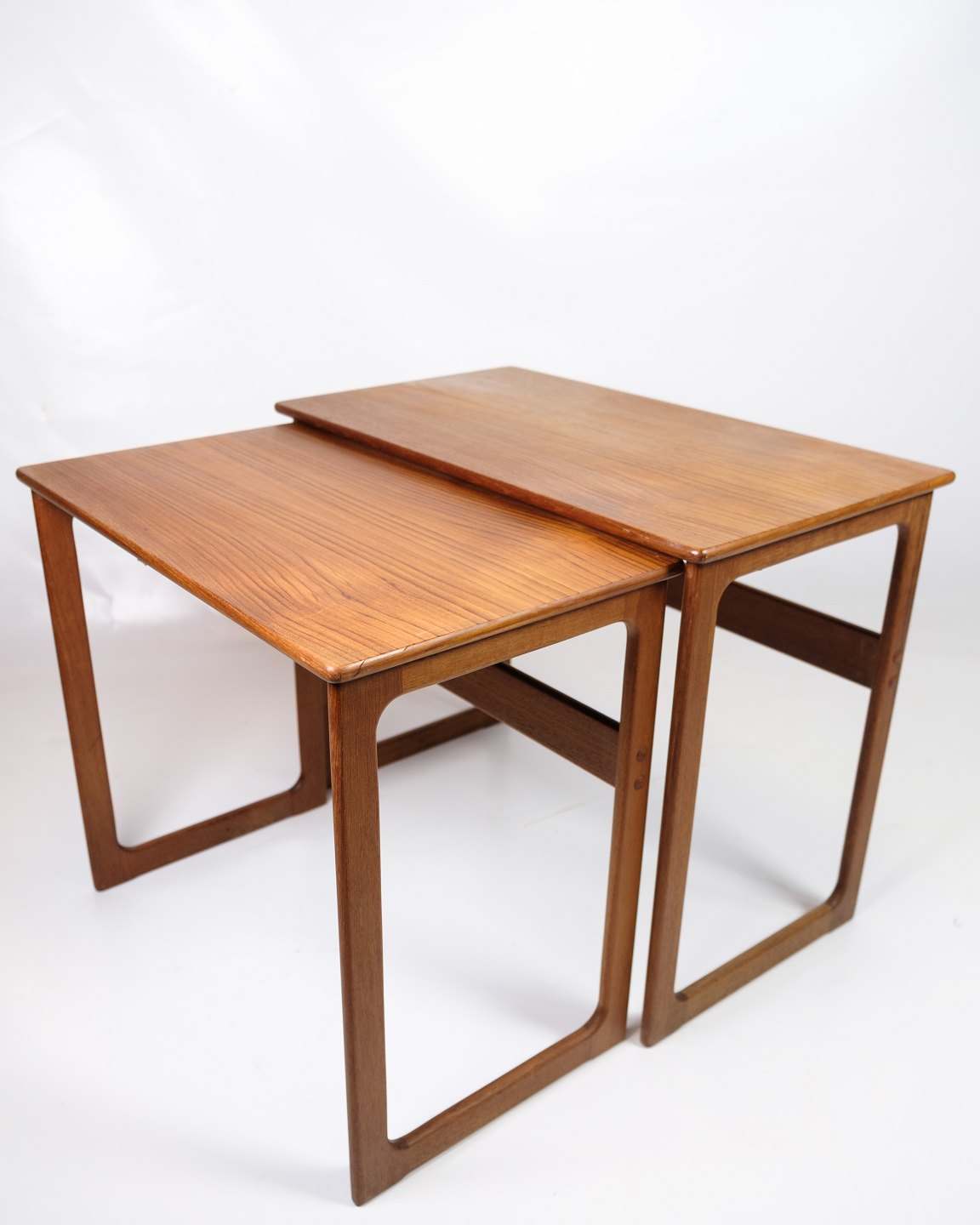 Sæt af 2 indskudsborde, model 219, udført i teak og designet af Johannes Andersen & Illum Wikkelsø, fremstillet af CFC Silkeborg i 1960'erne. Bordene er kendetegnet ved deres enkle og funktionelle design med smukke detaljer, såsom de let afrundede kanter og slanke ben, som er typiske for dansk møbelkunst fra perioden.