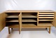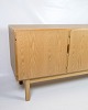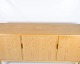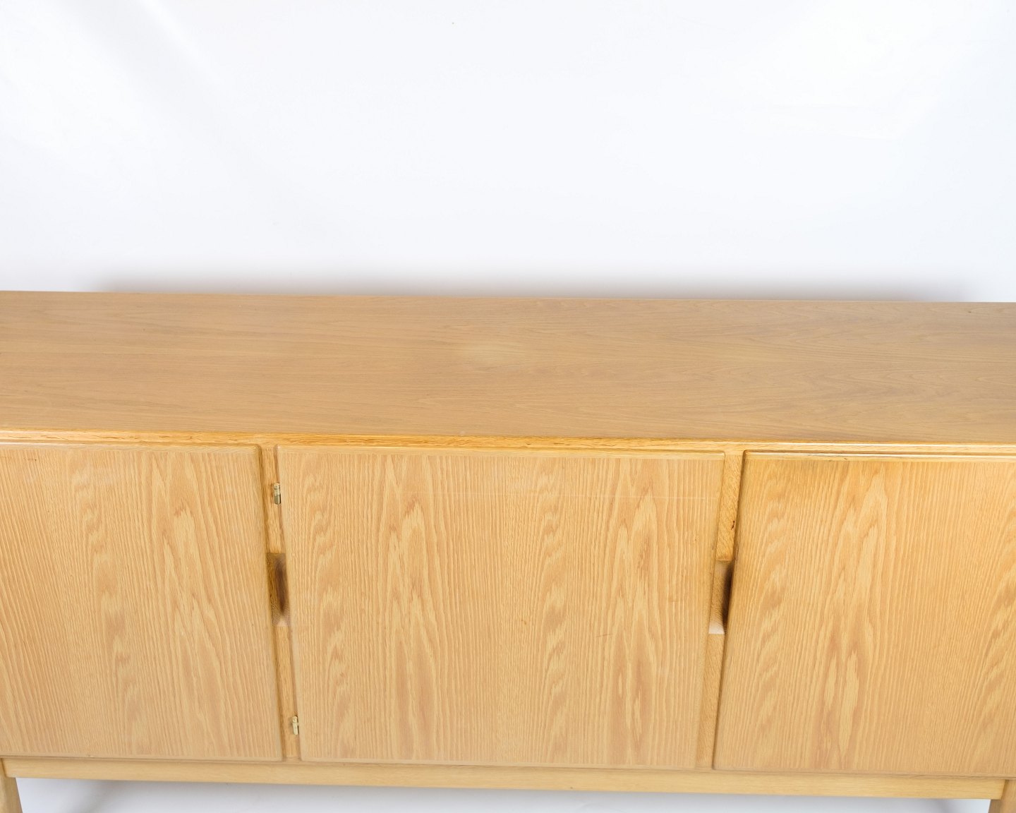 Skænk i lys eg fra 1960'erne, udført i dansk design. Skænken har tre låger, der åbner op til rummelige opbevaringsrum med hylder og tre udtræksskuffer, ideelle til opbevaring af mindre genstande. Det enkle og funktionelle design kombinerer rene linjer med kvalitetsmaterialer, hvilket gør skænken både praktisk og stilfuld.