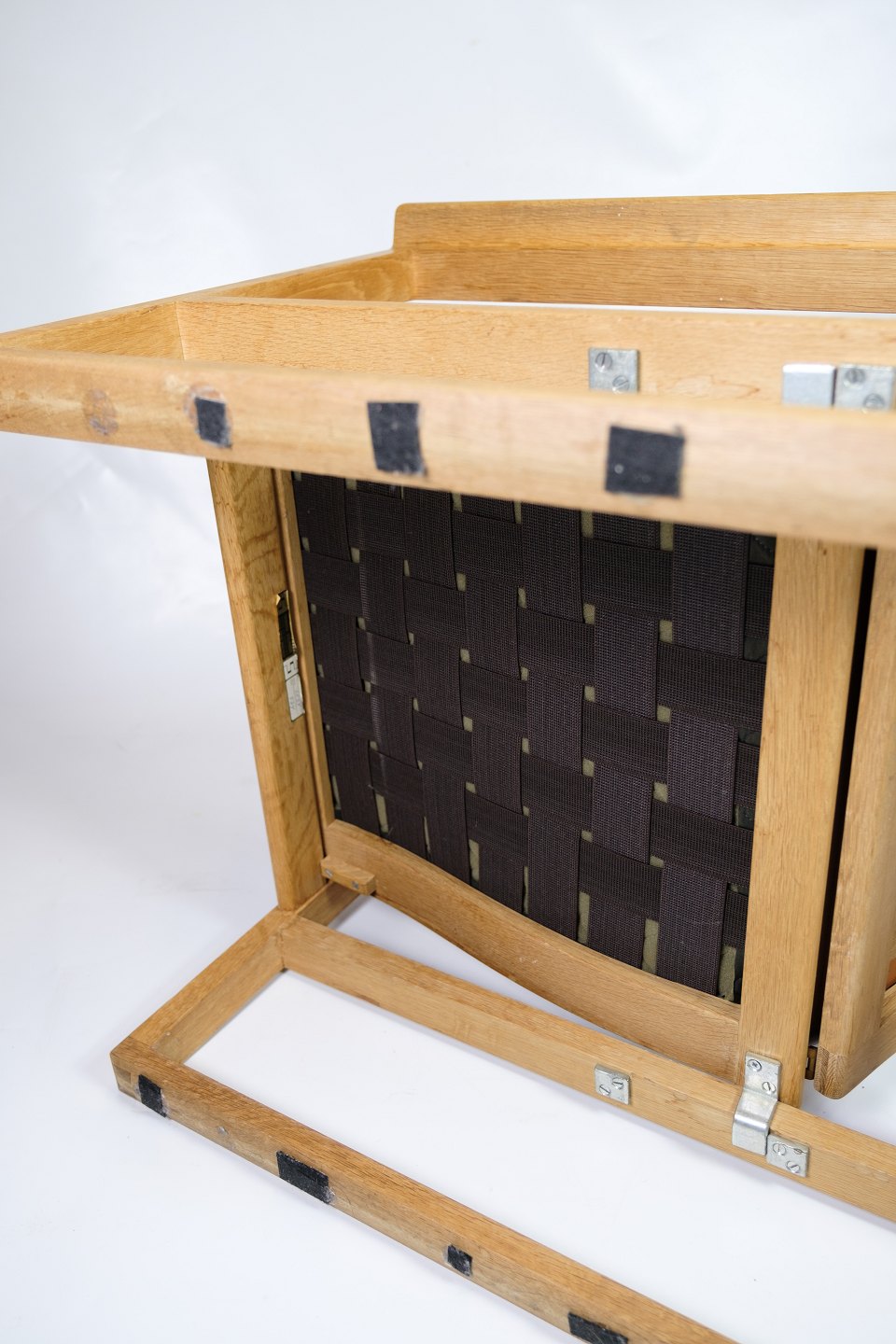 Slædestolen, model BM2254, designet af Børge Mogensen og fremstillet af Fredericia Stolefabrik. Stolen er udført i lys eg med sæde og ryglæn polstret i cognacfarvet Elegance læder, som giver et varmt og klassisk udtryk. Det karakteristiske slædeformede stel understreger både stabilitet og lethed i designet, samtidig med at det sikrer god komfort.