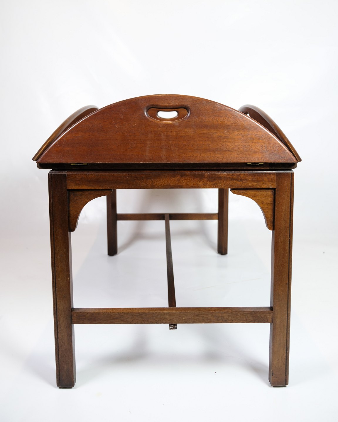 Butlerbord lavet af mahogni fra 1960erne. Bordet er lavet af solid mahogni, hvilket giver det en varm glød og holdbarhed. Butlerborde var populære i denne periode på grund af deres alsidighed – de kan nemt bruges som serveringsbord eller sidebord og har ofte en aftagelig bakke eller håndtag, der gør dem lette at flytte rundt.