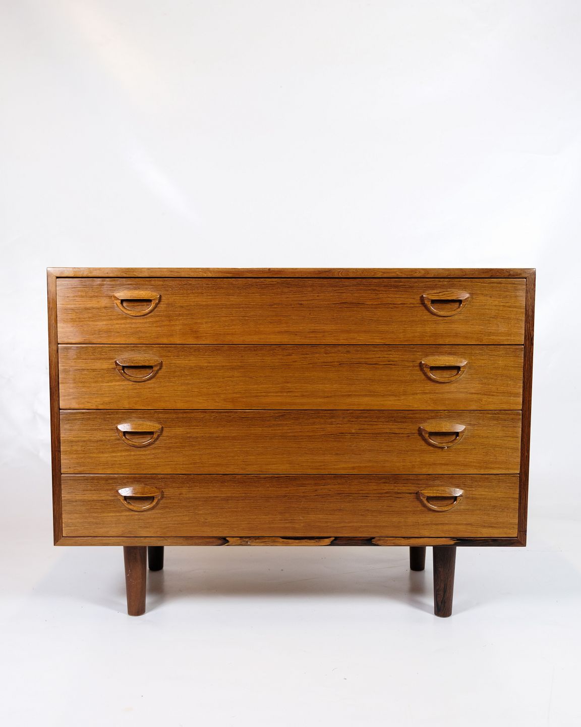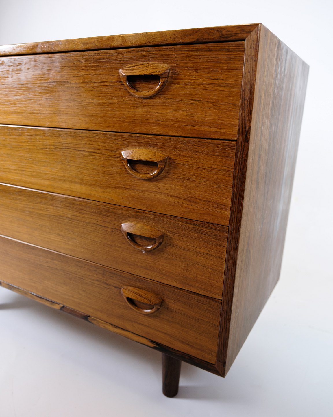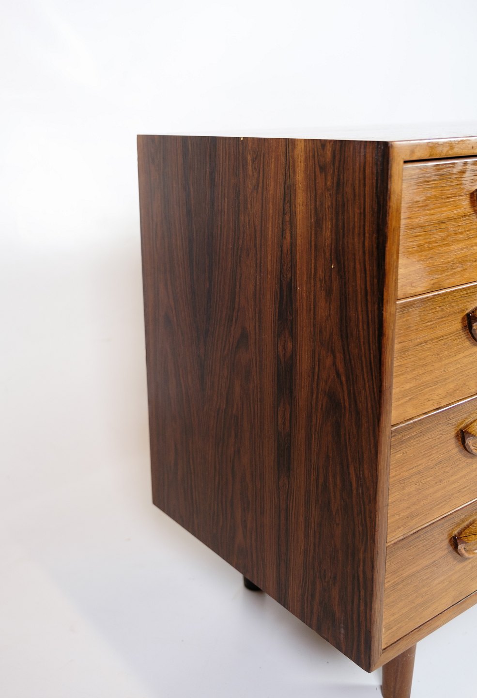 Kommode med 4 skuffer og runde ben. Udført i palisander fra 1960erne og designet af Kai Kristiansen. Kai Kristiansens design er kendt for sit fokus på funktionalitet, enkelhed og den håndværksmæssige kvalitet af møblet.