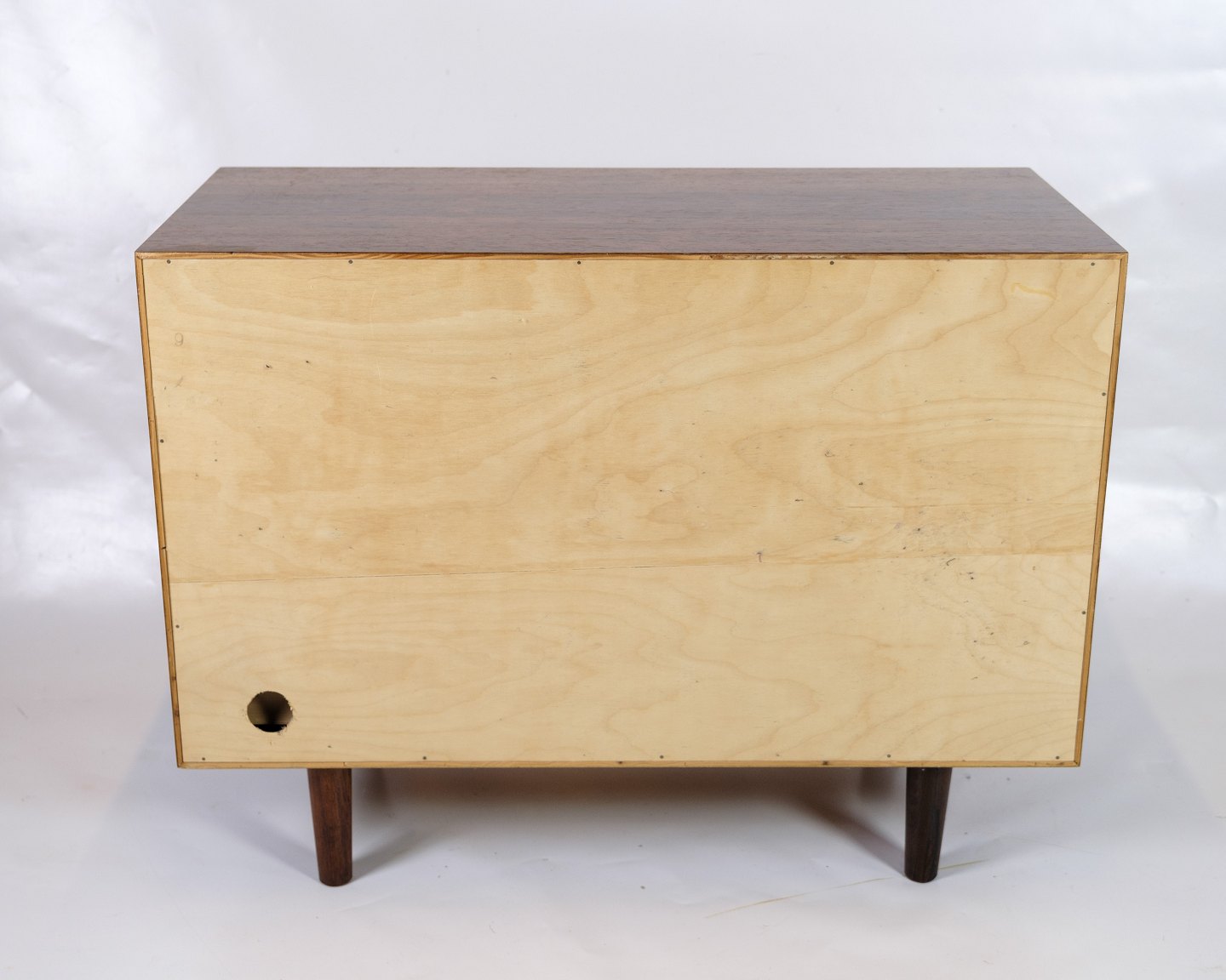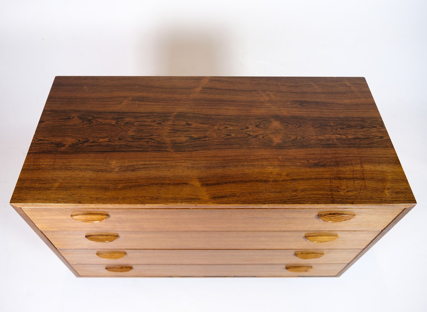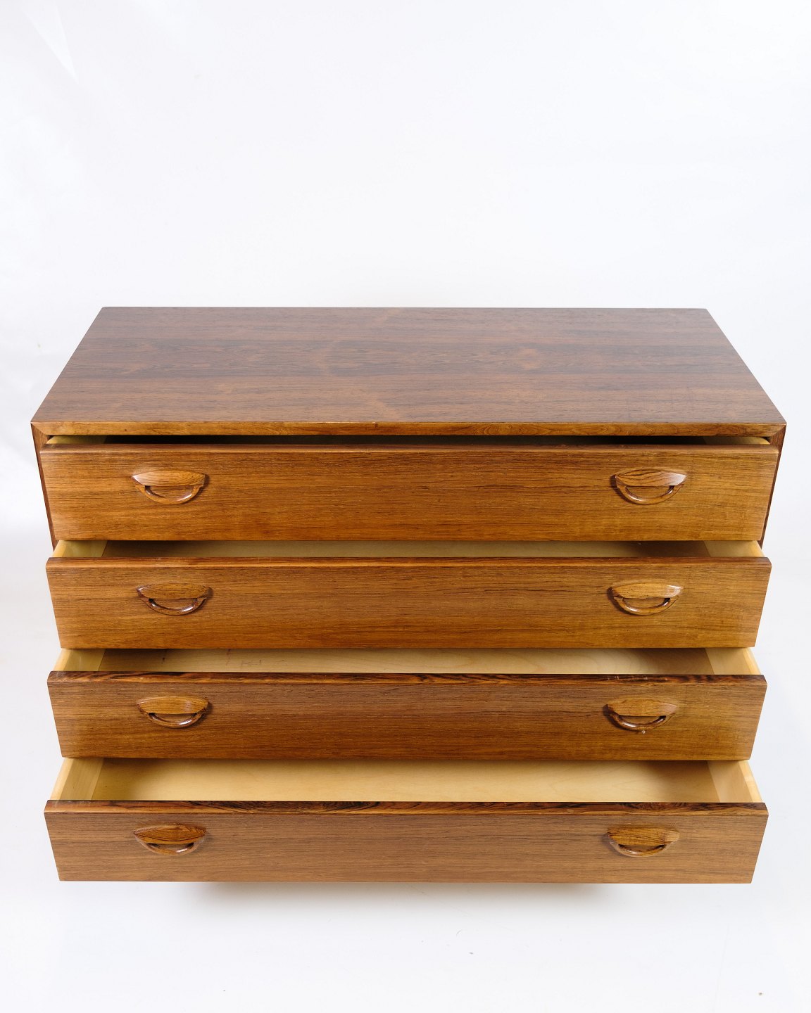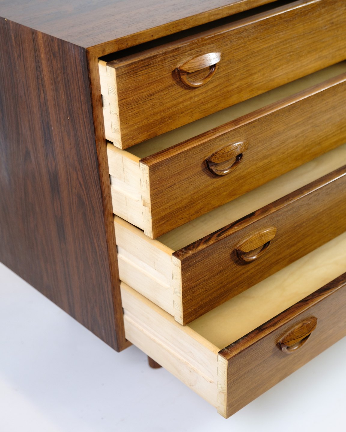 Kommode med 4 skuffer og runde ben. Udført i palisander fra 1960erne og designet af Kai Kristiansen. Kai Kristiansens design er kendt for sit fokus på funktionalitet, enkelhed og den håndværksmæssige kvalitet af møblet.