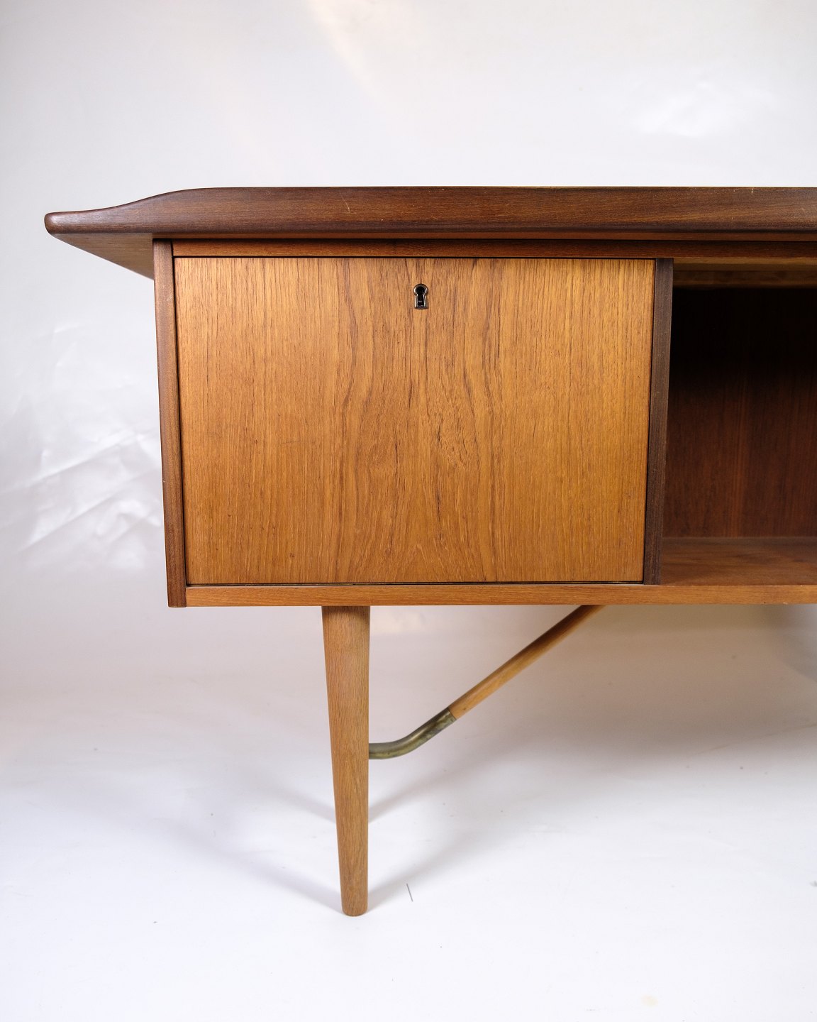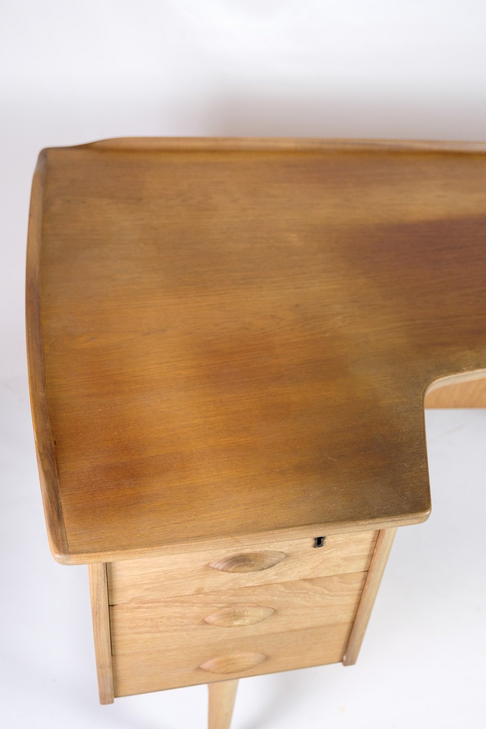 Kontakt os vedrørende prisBoomerang-skrivebord designet af Peter Løvig Nielsen i 1956 og fremstillet af Hedensted Møbelfabrik i 1960'erne. Skrivebordet er udført i teak med elegante messingdetaljer og har en karakteristisk boomerangformet bordplade, der giver både stil og funktionalitet. Det unikke design inkluderer skuffer og opbevaringsrum, hvilket gør det til et praktisk og æstetisk valg.