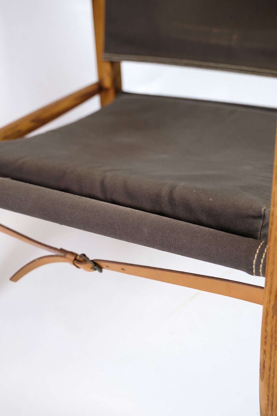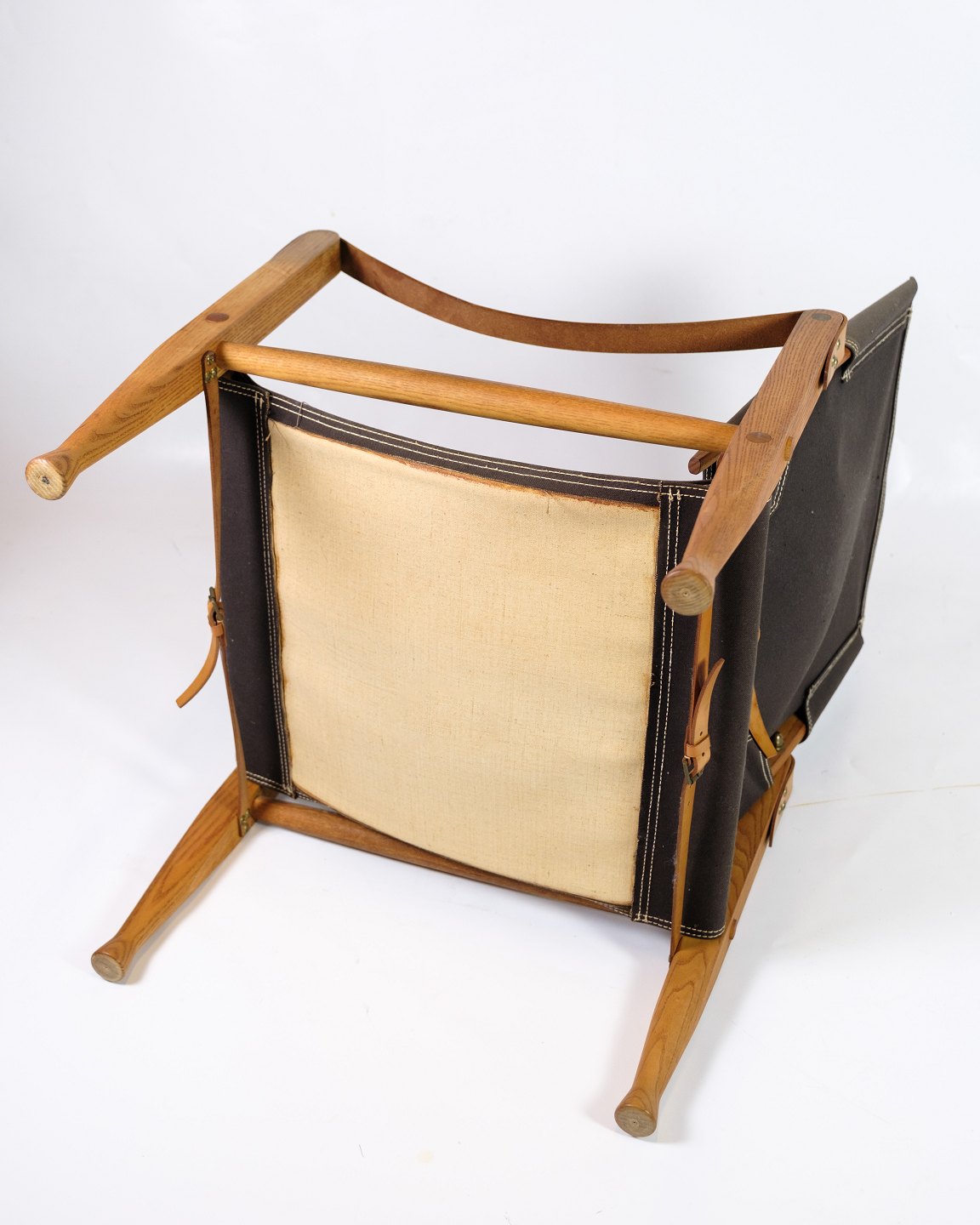 SolgtEt sæt safari-lænestole designet af Kaare Klint og fremstillet af Rud. Rasmussen. Stolene er udført i asketræ med sæde og ryg i brunt kanvas samt armlæn i kernelæder. Safari-stolene er kendt for deres enkle og funktionelle design, hvor fleksible materialer og aftagelige elementer gør dem både lette og praktiske.