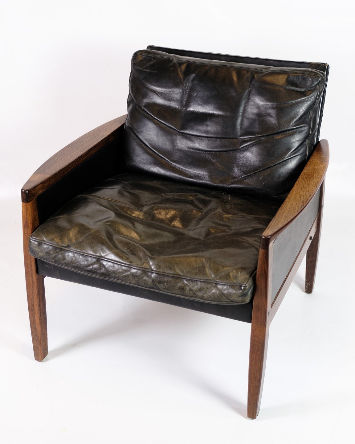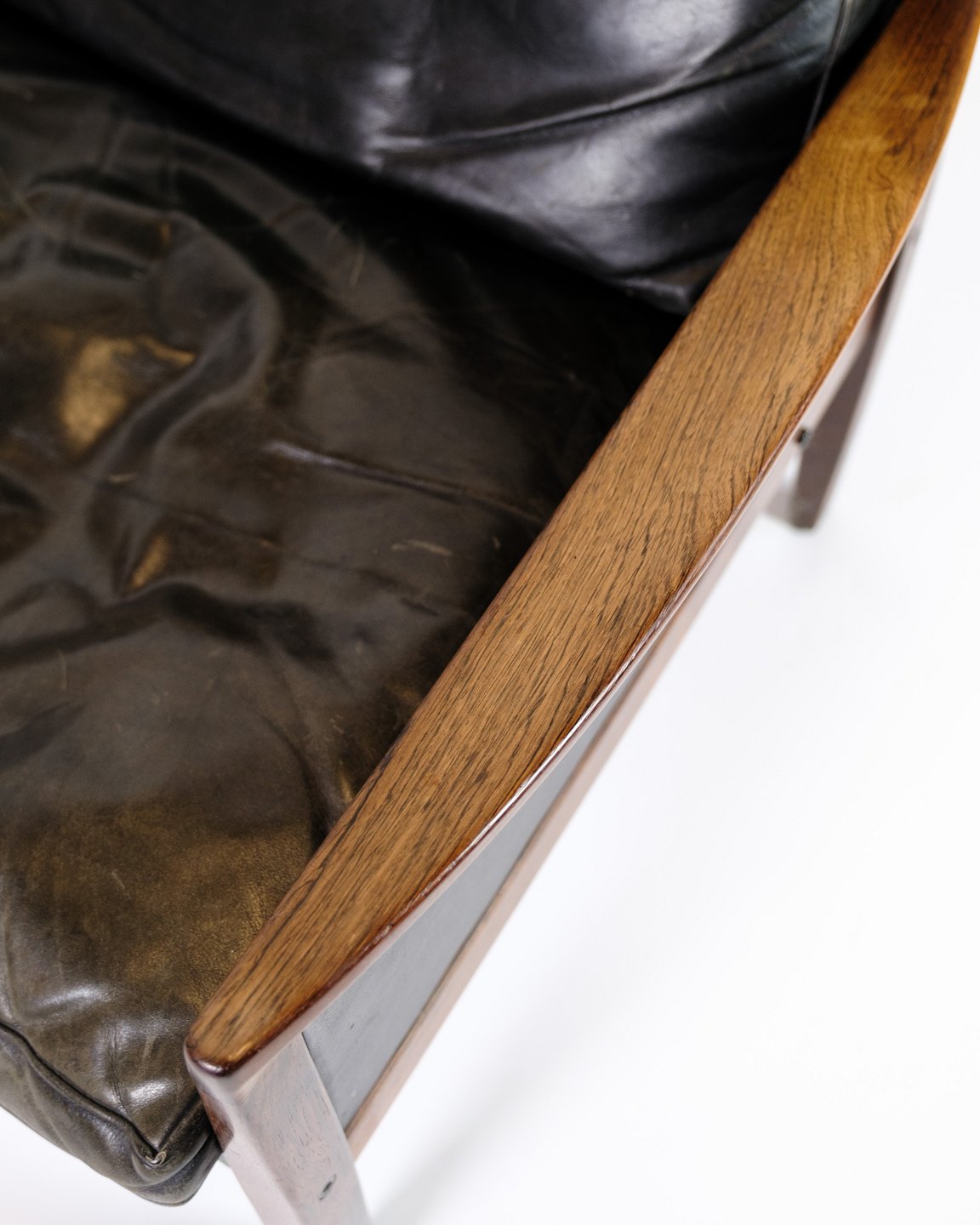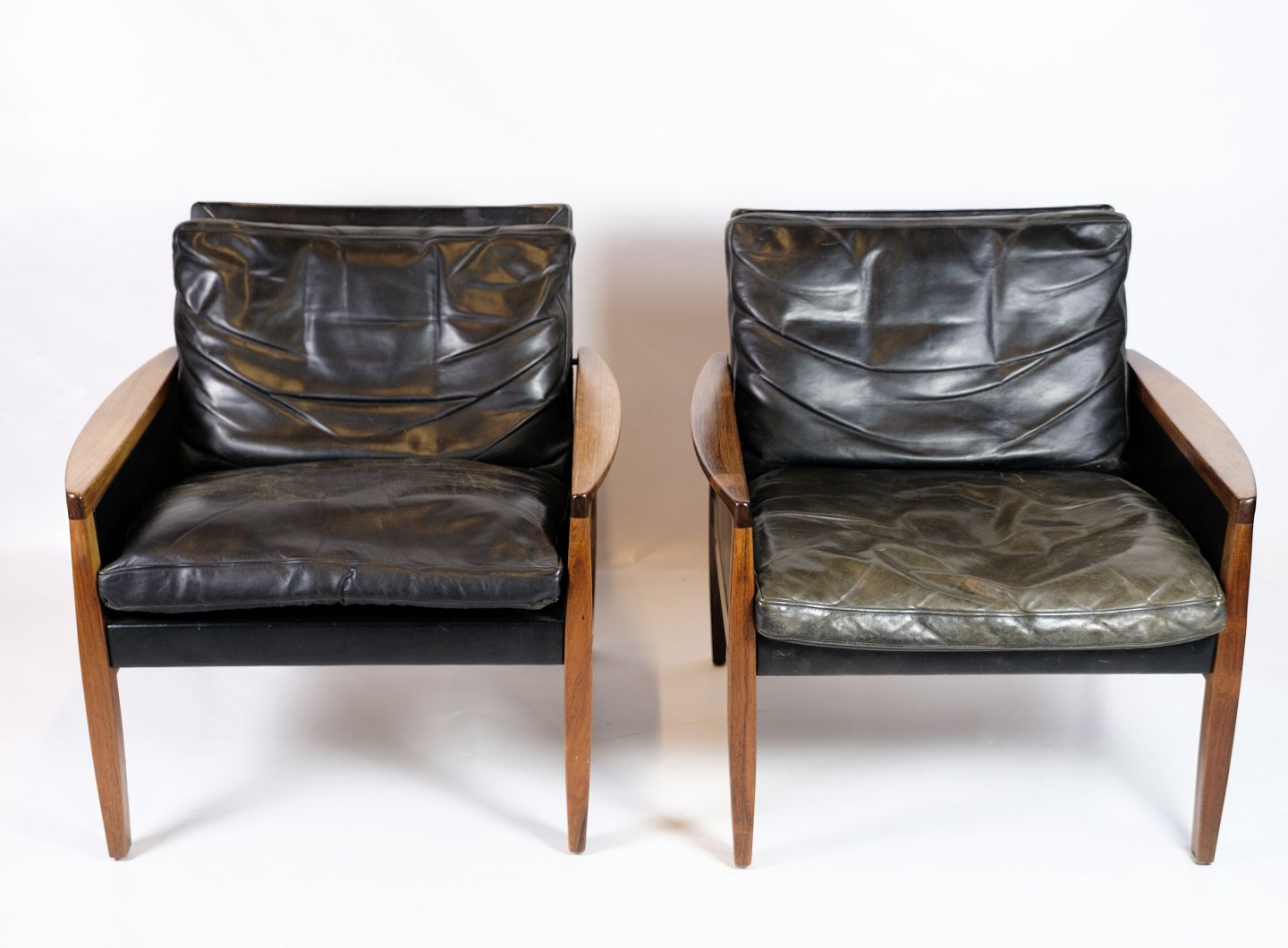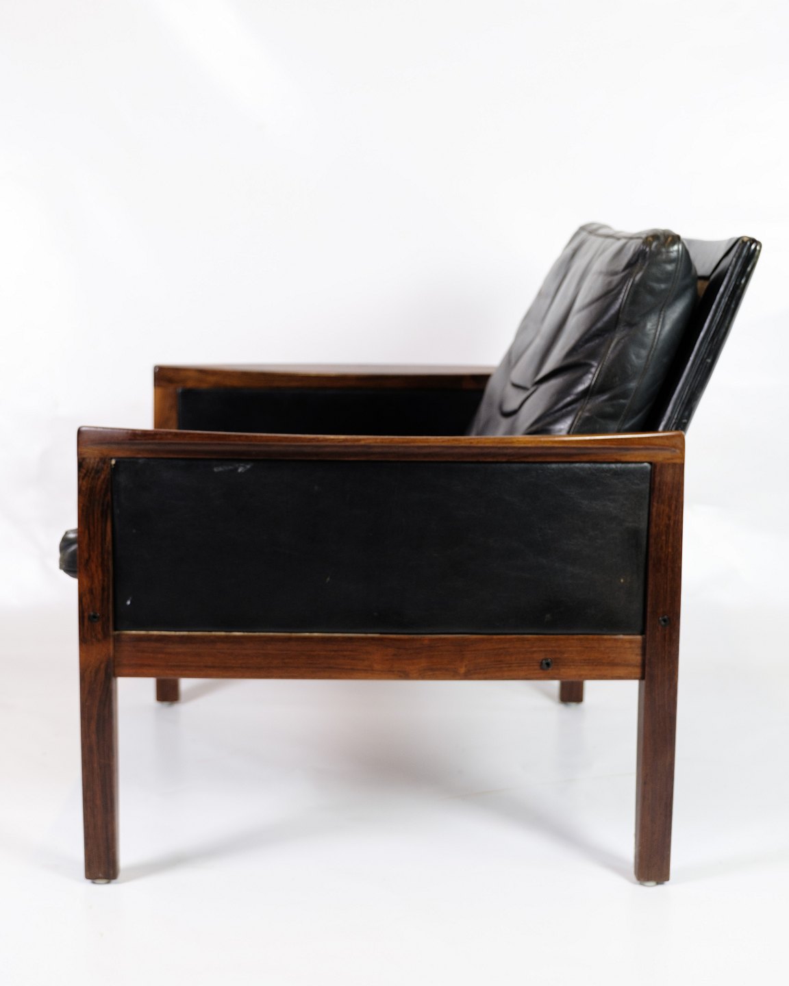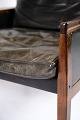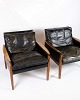 SoldThis set of 2 armchairs in rosewood with black leather cushions is a magnificent example of classic Danish design. The rosewood wood, with its deep color and fine grain, gives the chair a unique and luxurious radiance, while the soft, black leather ensures a comfortable sitting experience.