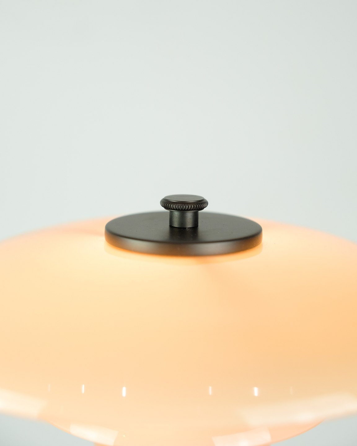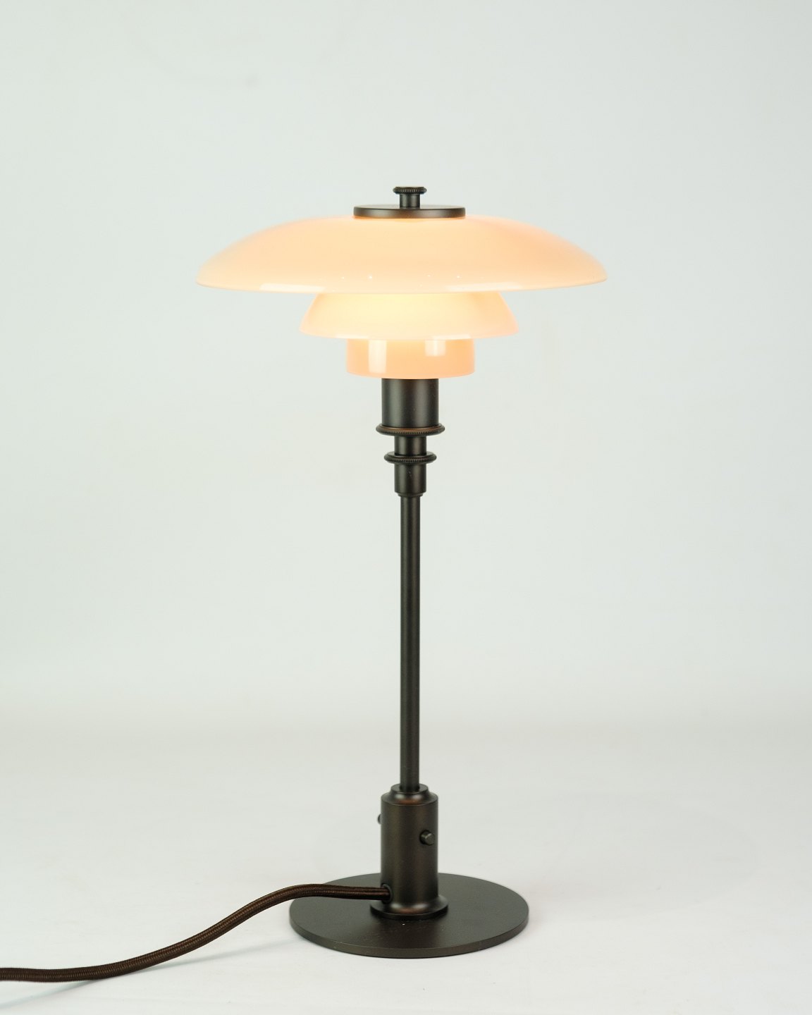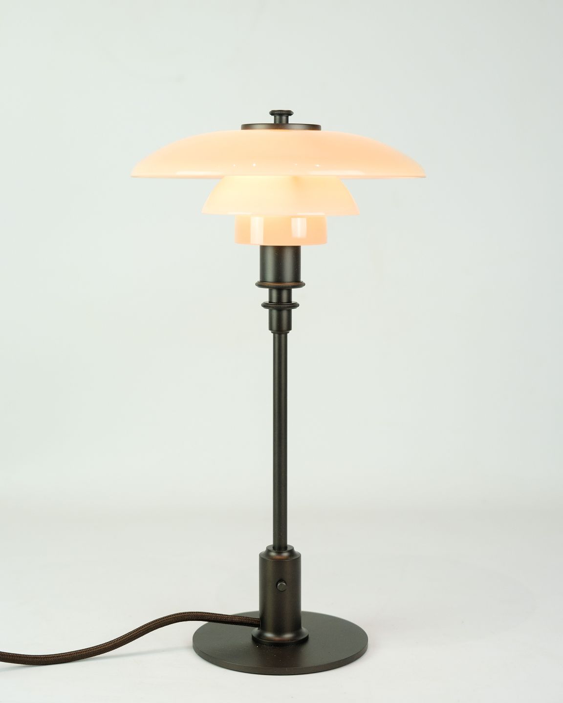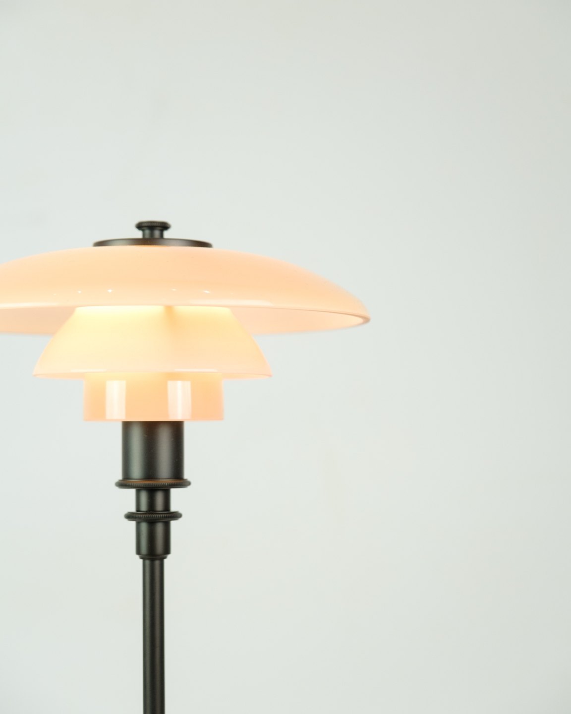 Hver lampe er unik på grund af de håndlavede skærme, der kan variere i nuance og tekstur. Denne model er en hyldest til Henningsens banebrydende treskærmssystem fra 1925-26, designet til at skabe blændfrit og behageligt lys. PH 2/1 bordlampen er ideel til at tilføre eksklusivitet og elegance til ethvert rum.