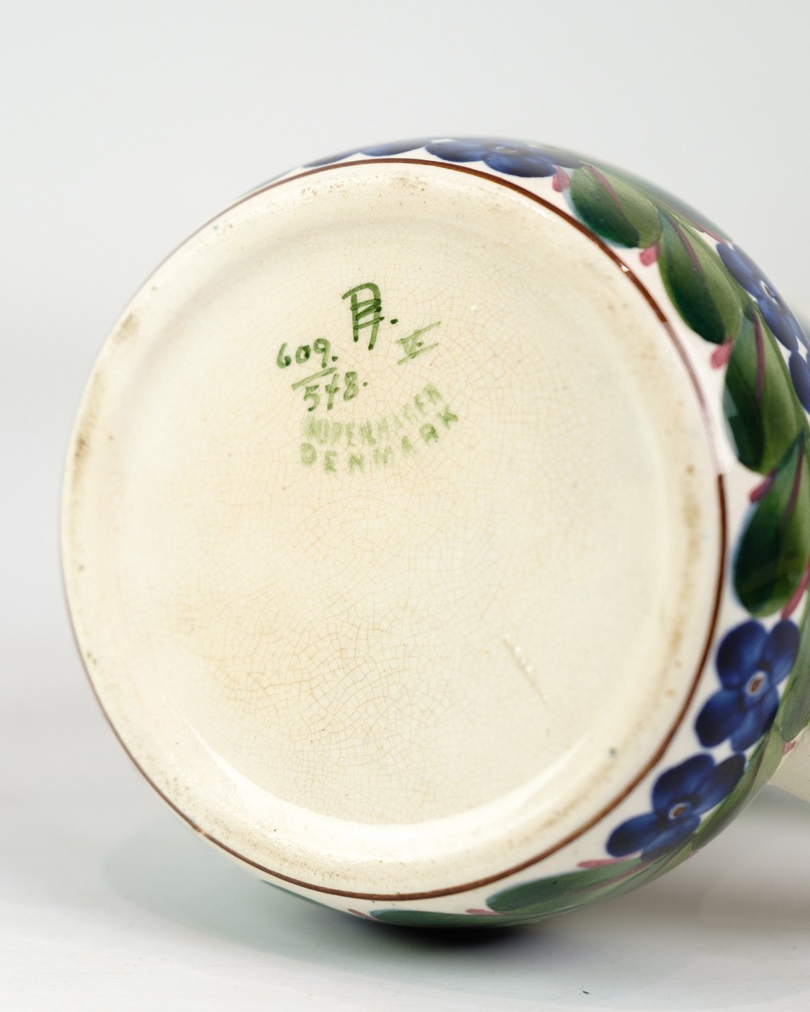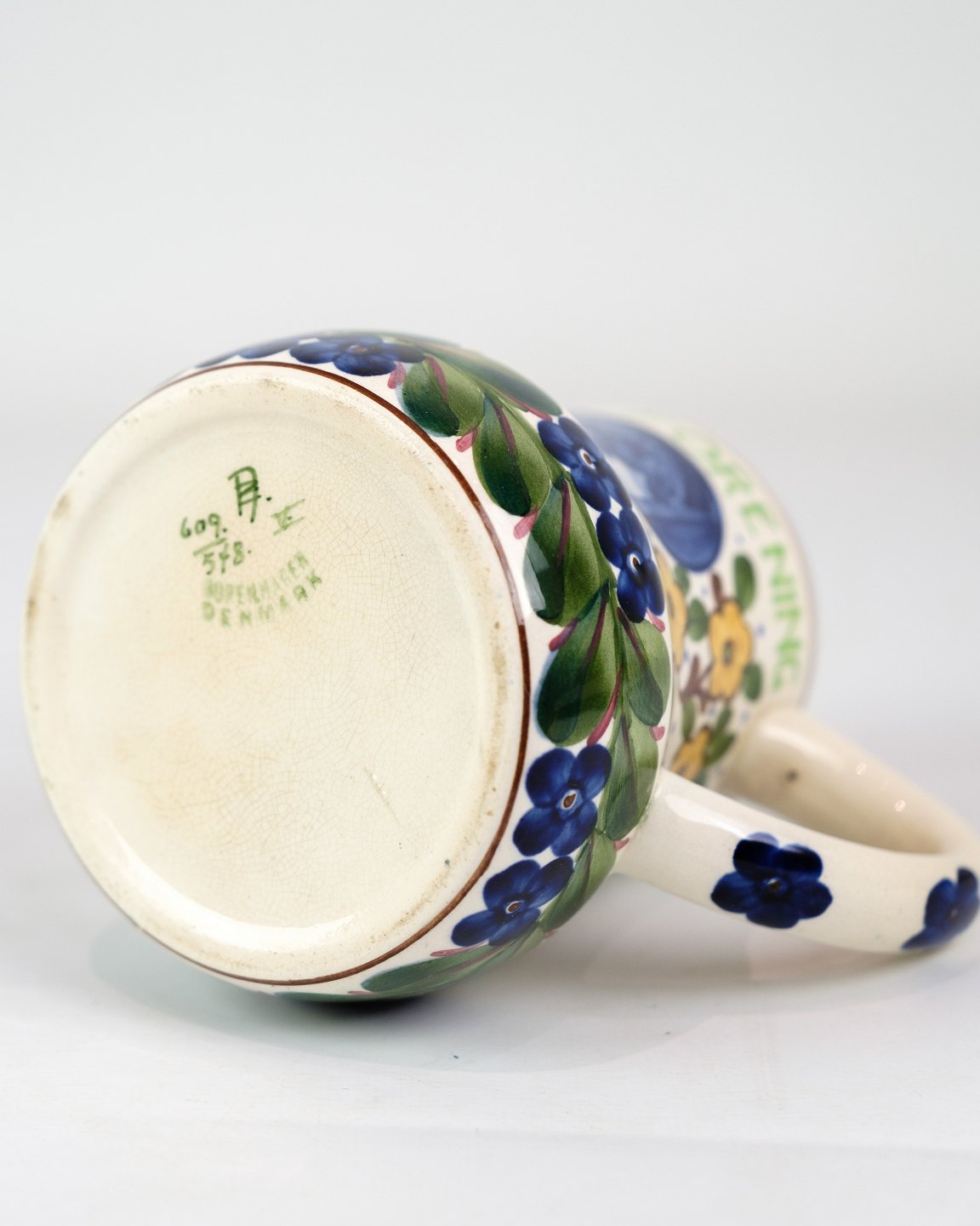 Dette krus, model 609/548, er fremstillet i fajance og designet i samarbejde med Den Danske Turistforening Nyborg. Kruset bærer et unikt og historisk præg, der afspejler Aluminia-fabrikkens tradition for kunstnerisk udsmykning og detaljerigdom.