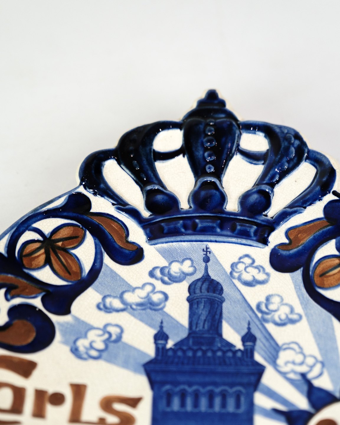 SolgtDenne bryggeriplatte fra 1908 er fremstillet i fajance af Aluminia og prydet med en smuk dekoration af den ikoniske Elefantporten ved Carlsberg Bryggerierne. Motivet hylder Carlsbergs stolte bryggeritraditioner og giver platten en historisk og kunstnerisk værdi.