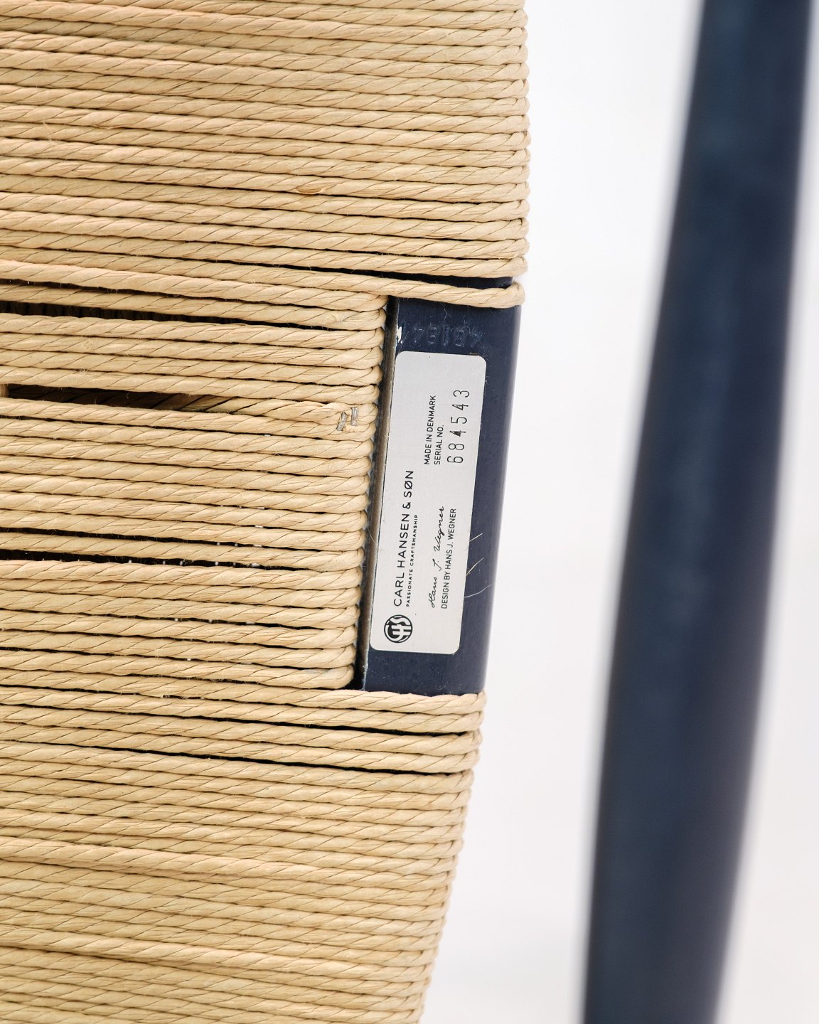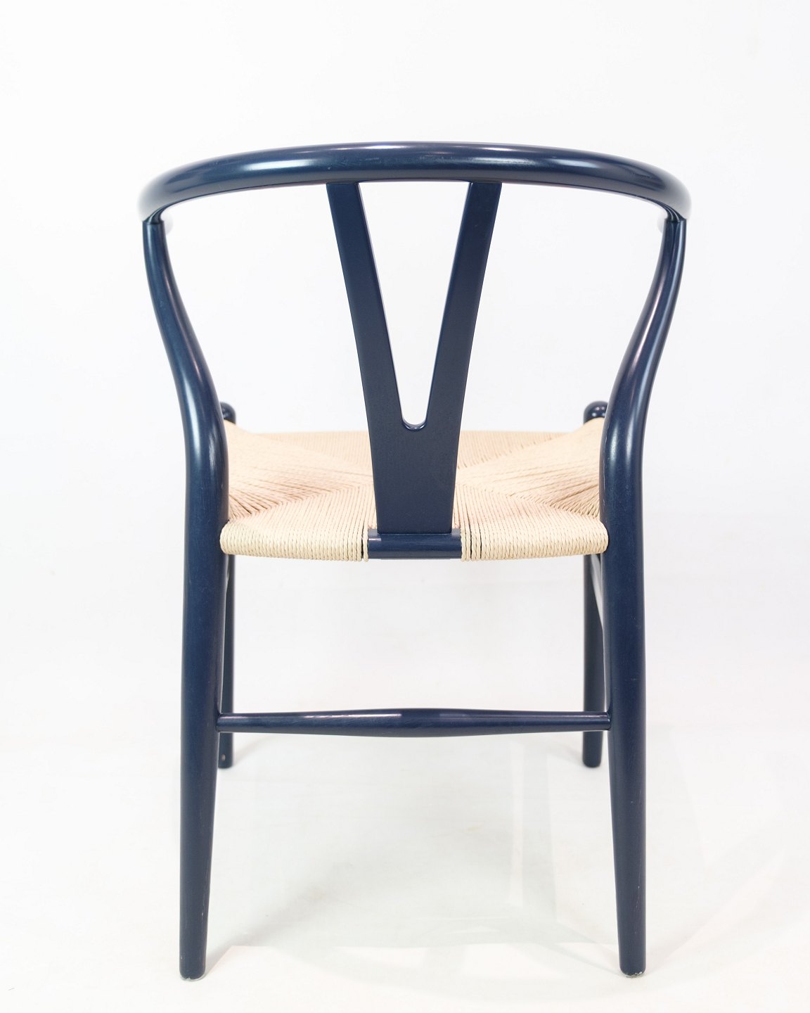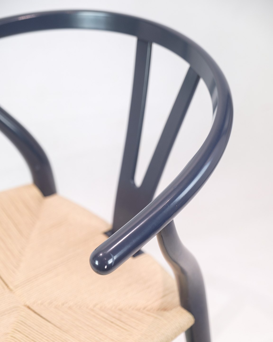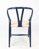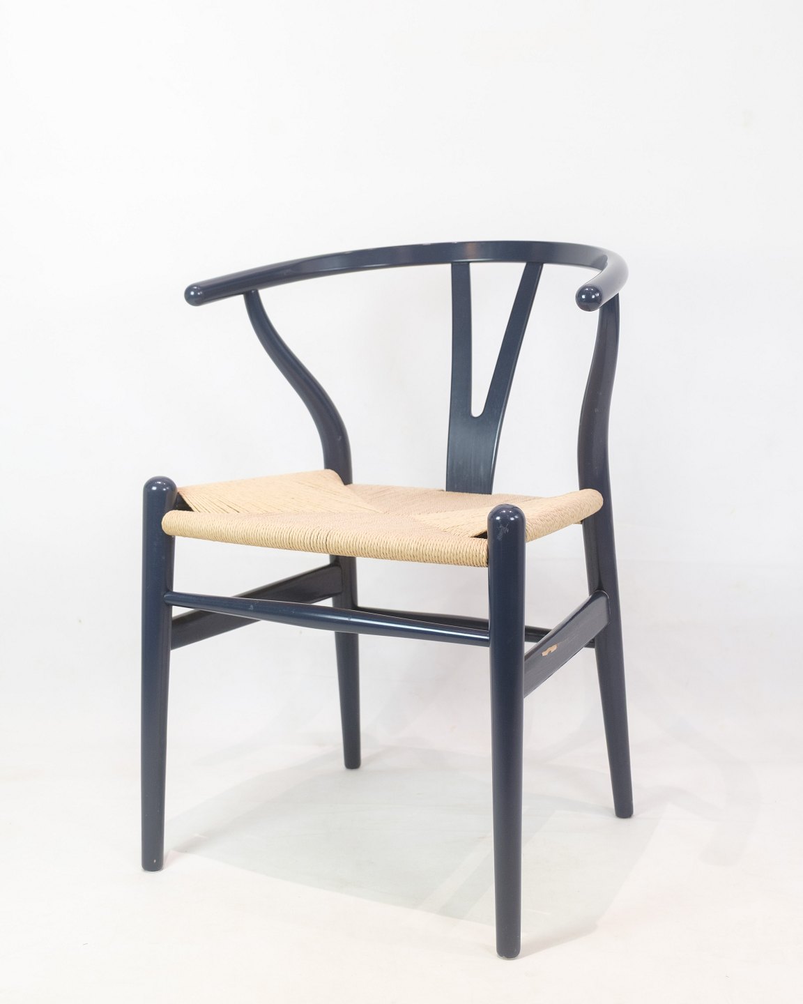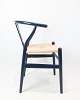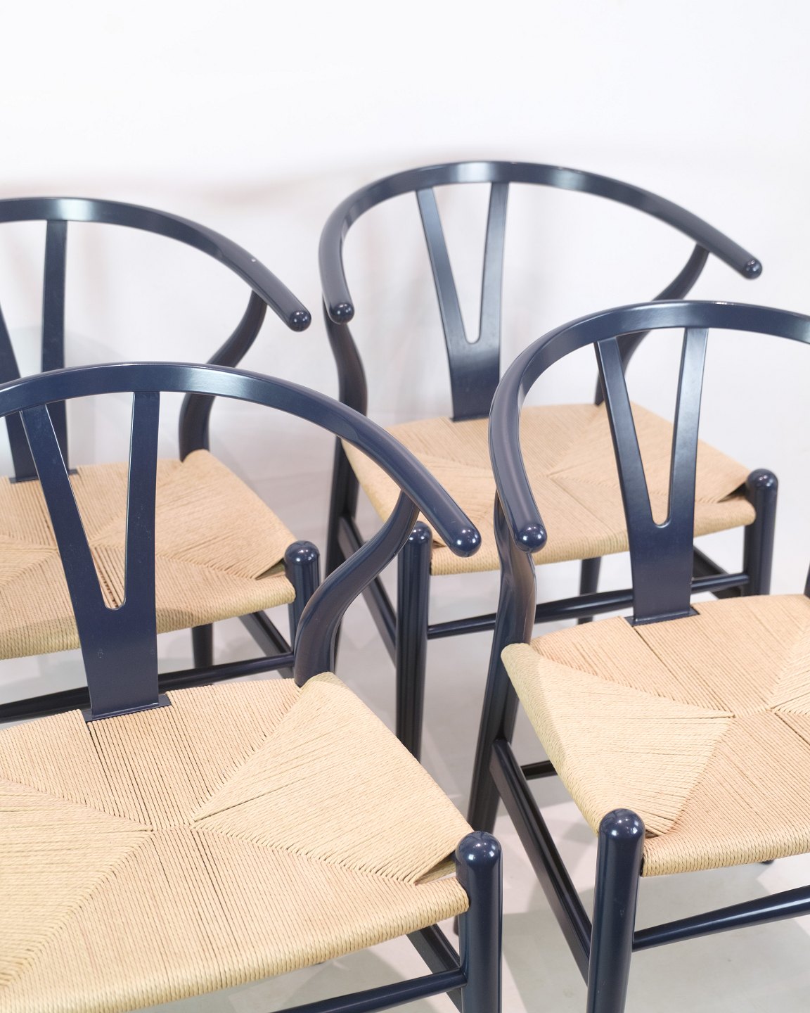 SolgtSæt af 4 Y-stole, model CH24, Designet af Hans J. Wegner og produceret af Carl Hansen & Søn. Stolene er malet i en navy blå farve og sædet er udført i det klassiske naturflet.
