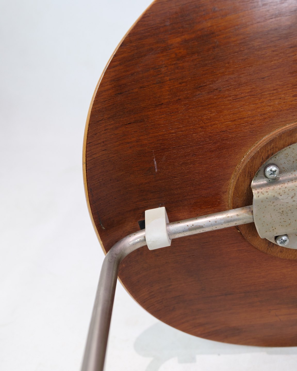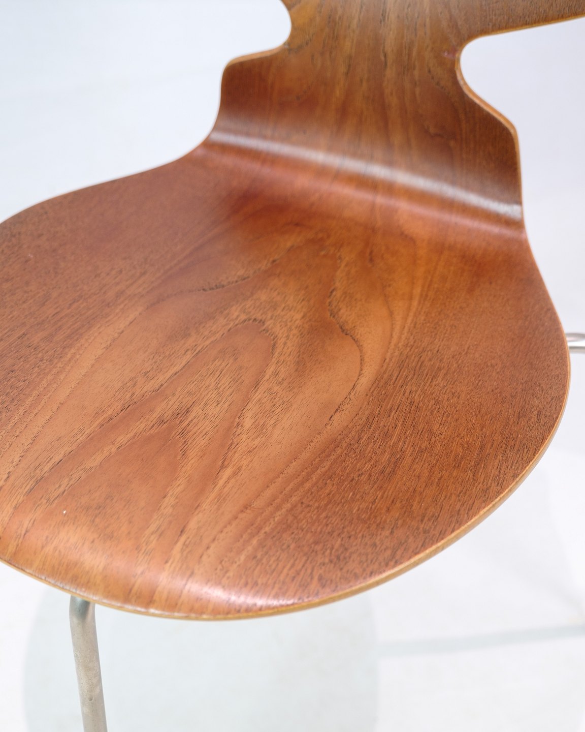 Myrestolen, model 3100, designet af Arne Jacobsen i 1952 og produceret af Fritz Hansen. Stolen er lavet i teak med et trebenet chrome stel. Stolen er en tidlig model fra 1950erne og står i meget pæn stand.