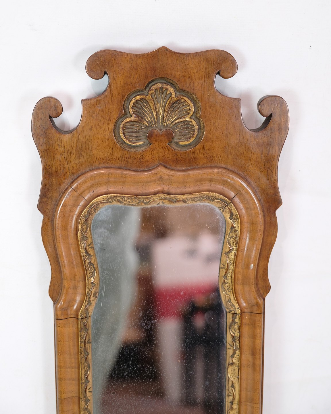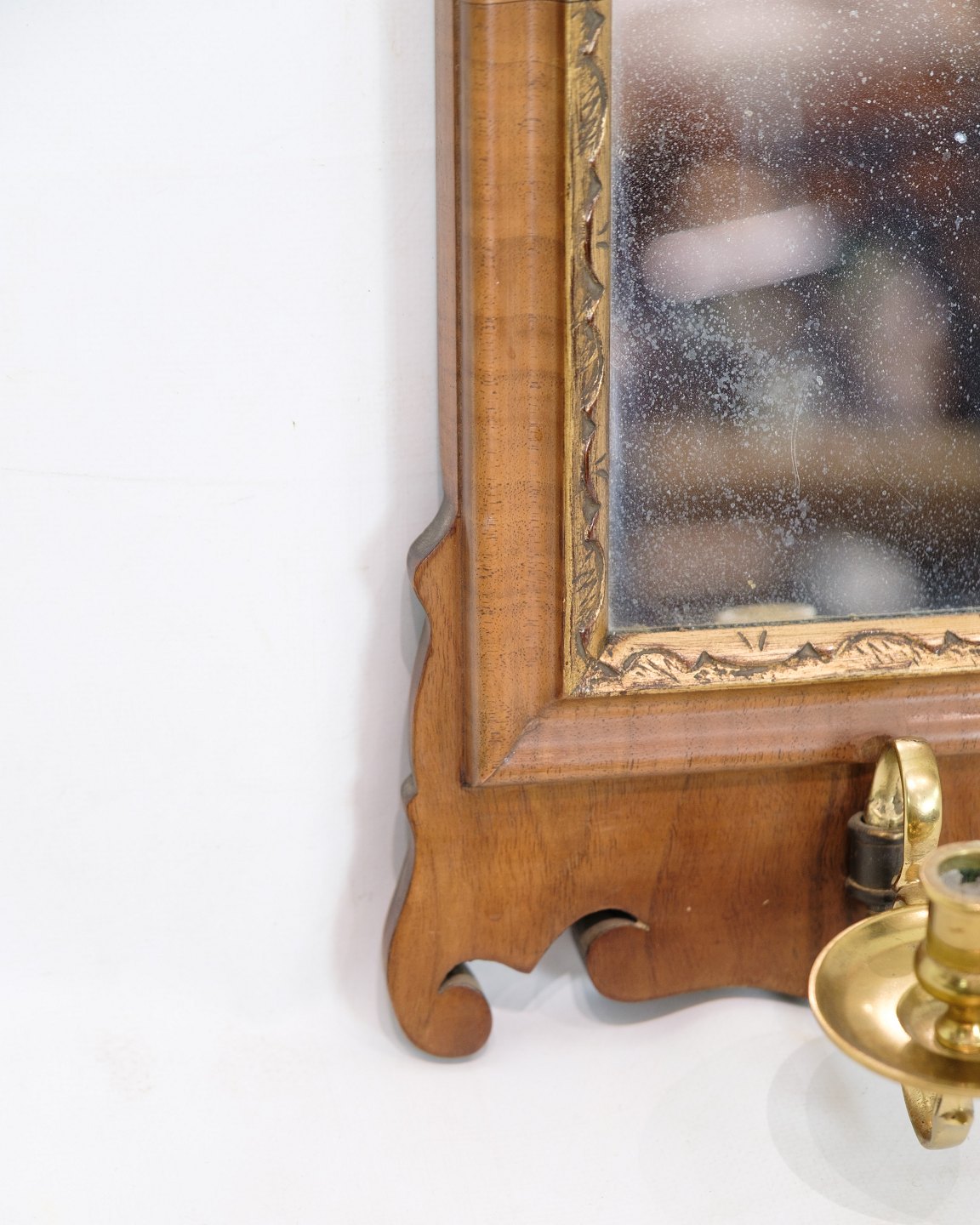 Set of 2 antique wall mirrors with integrated brass candlestick. The frame is made of walnut and the mirrors are made in the rococo style from the 1880s.