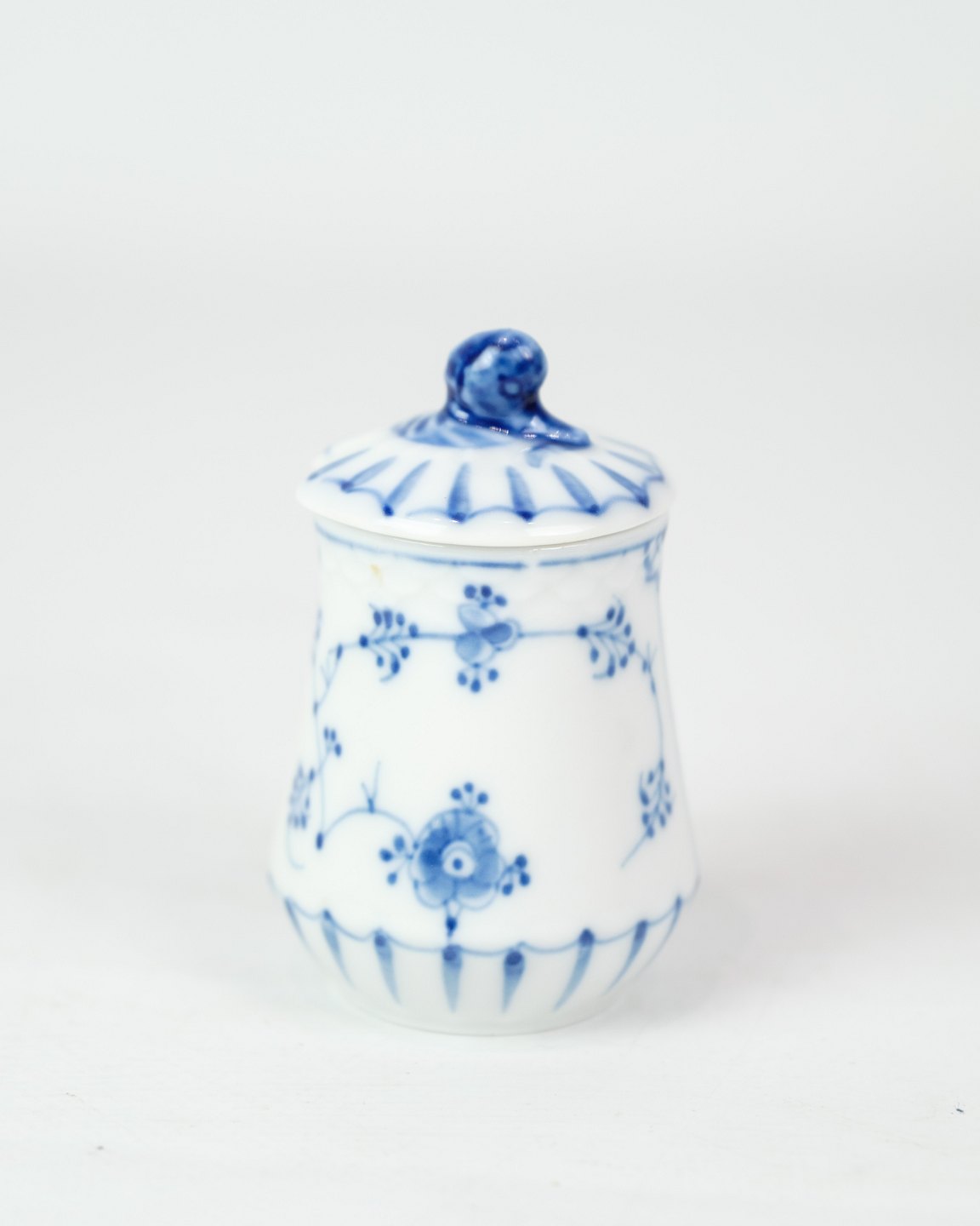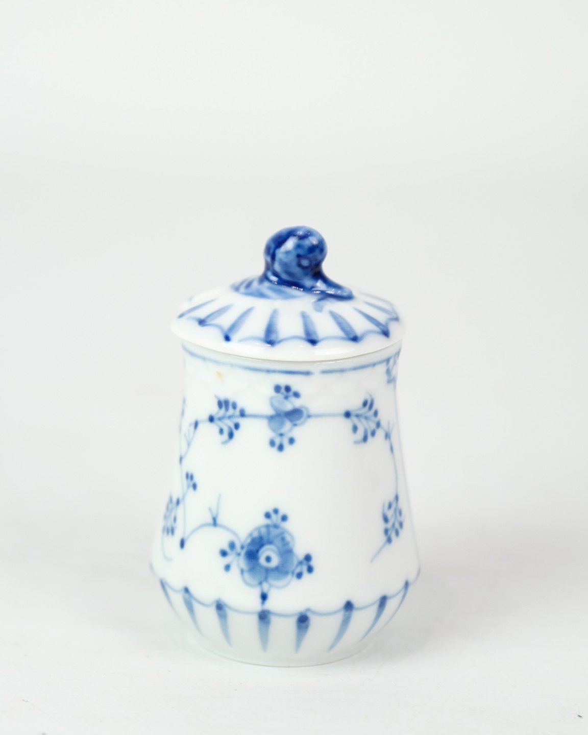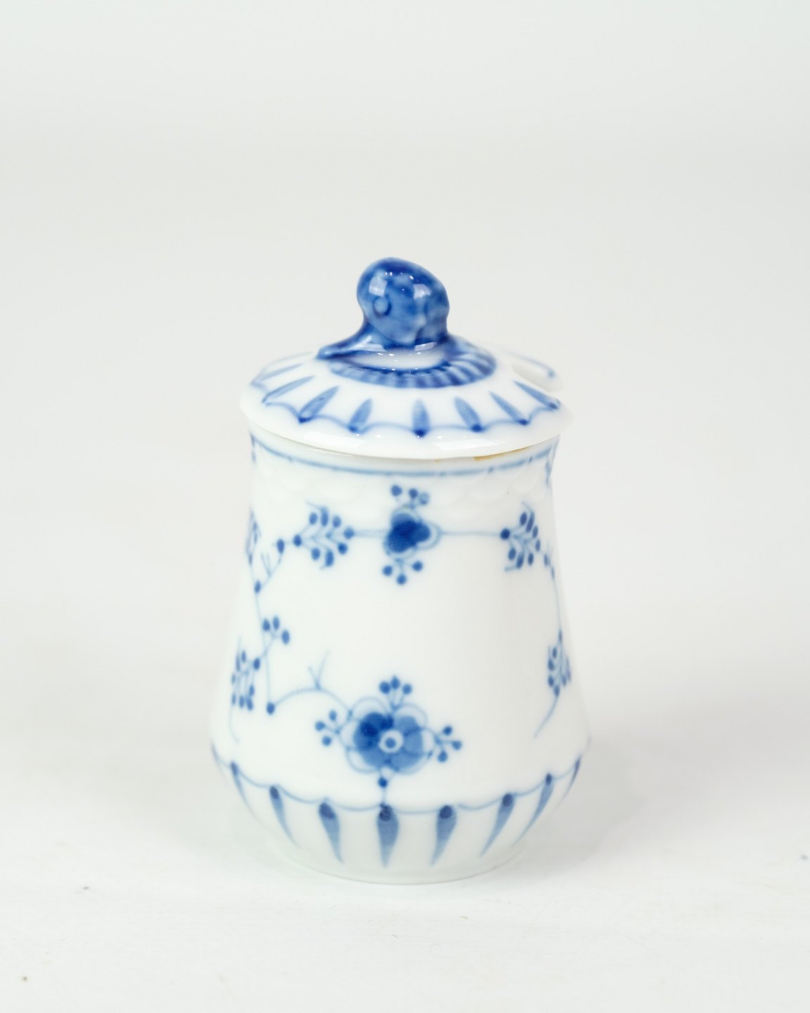 Sennepskrukke nr. 52c fra Bing & Grøndahl. Fremstillet i porcelæn med klassisk blåmalet musselmalet dekoration.