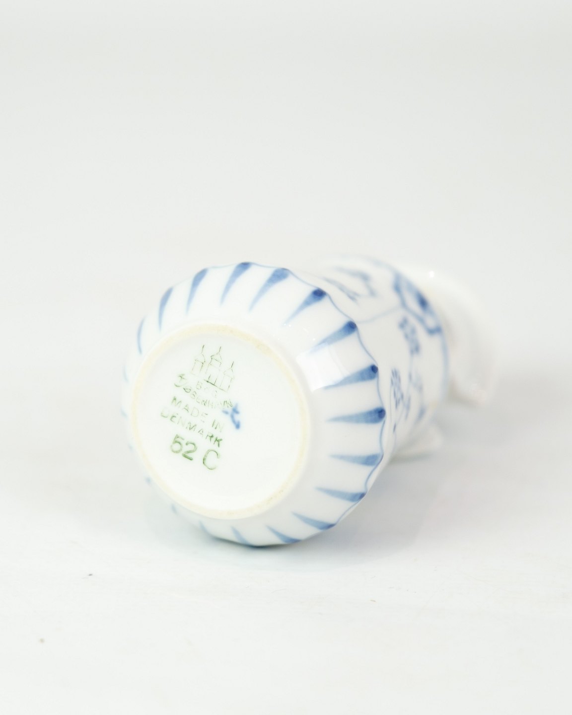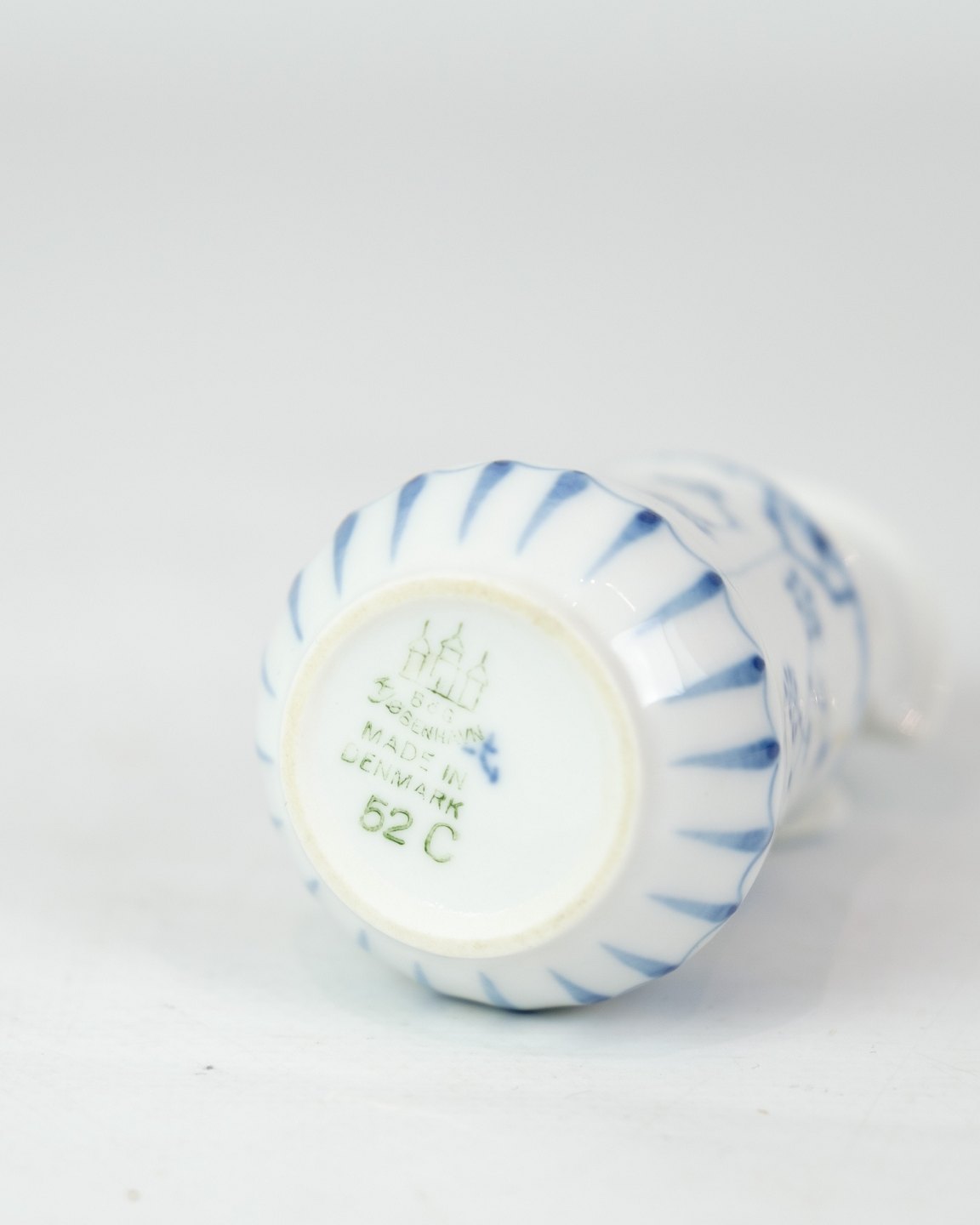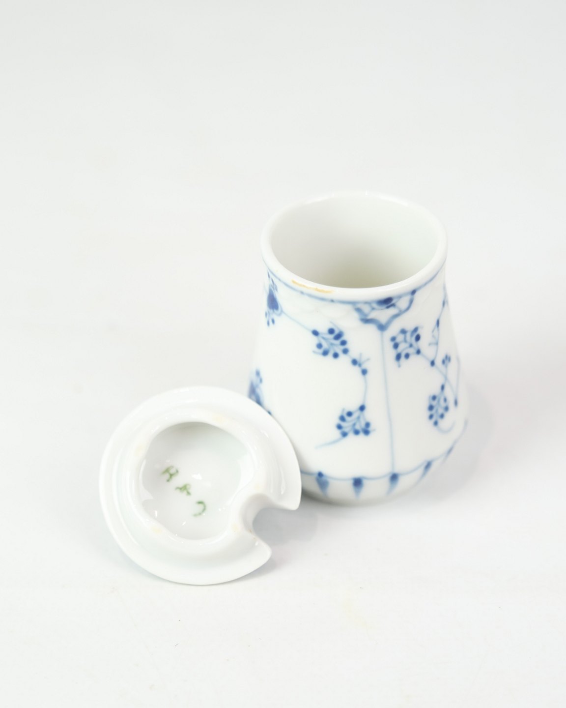 Sennepskrukke nr. 52c fra Bing & Grøndahl. Fremstillet i porcelæn med klassisk blåmalet musselmalet dekoration.