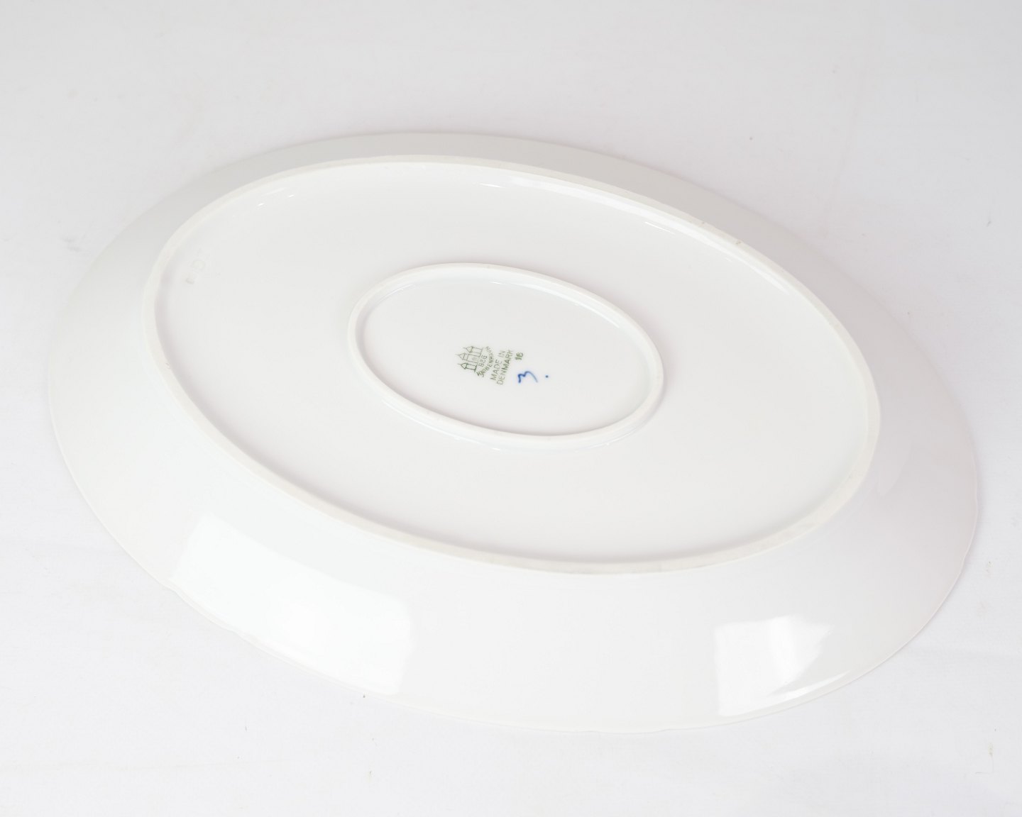 Ovalt Fad nr. 16 fra Bing & Grøndahl. Fremstillet af porcelæn med klassisk musselmalet design i håndmalet blå dekoration.