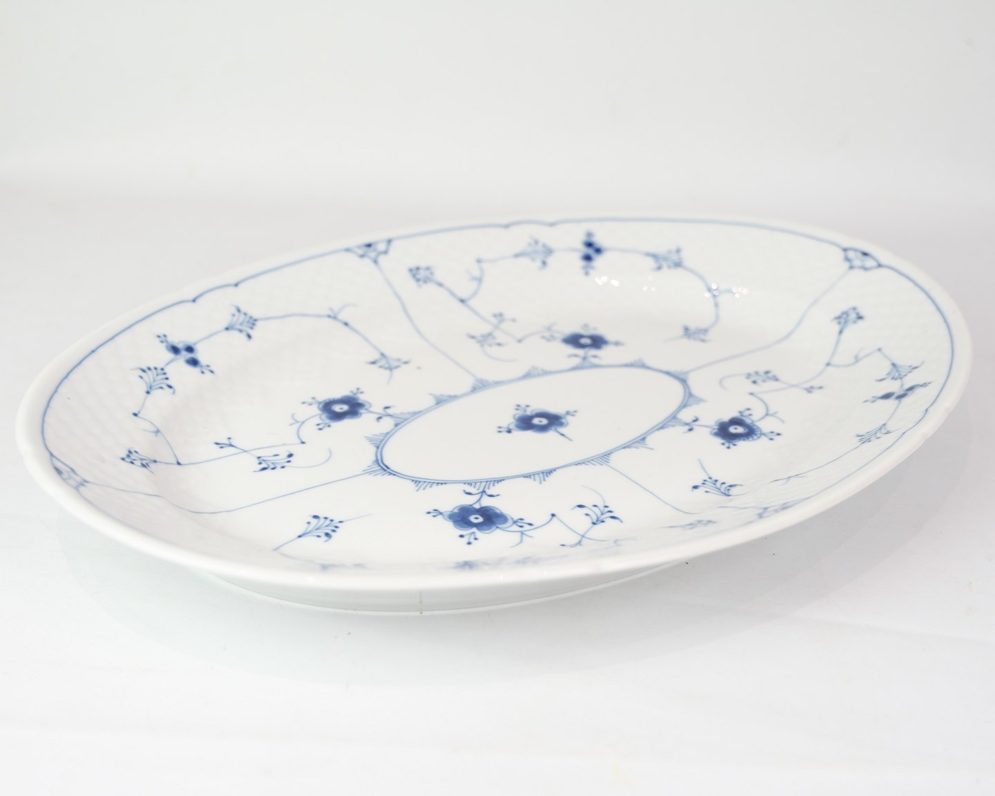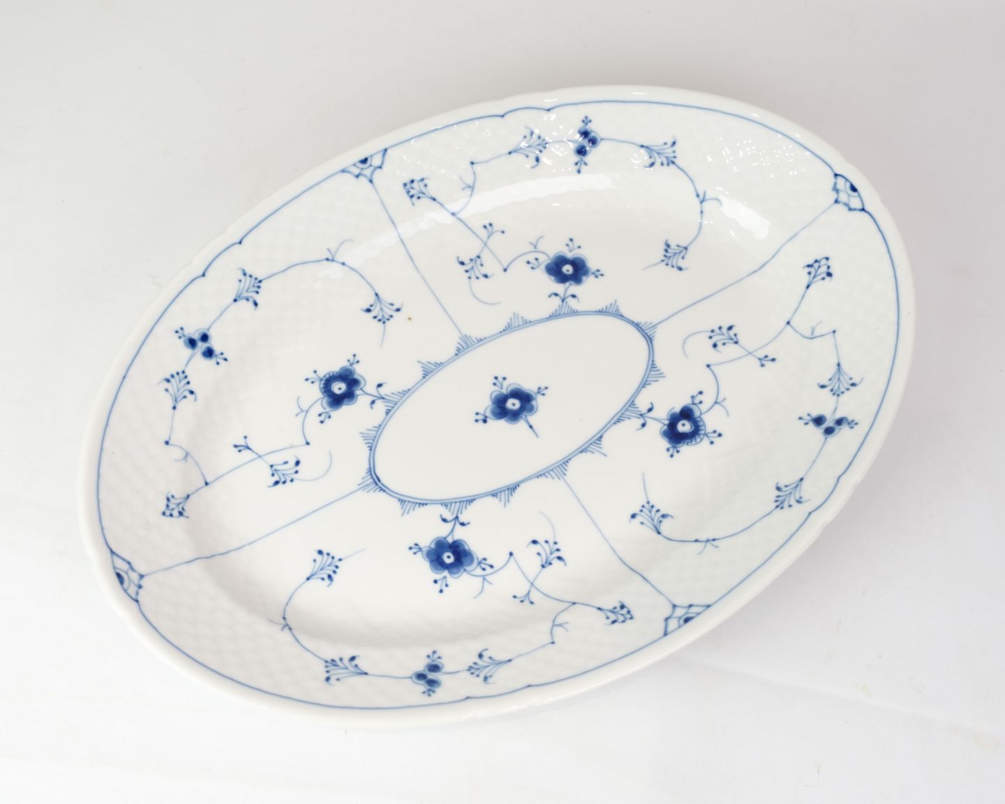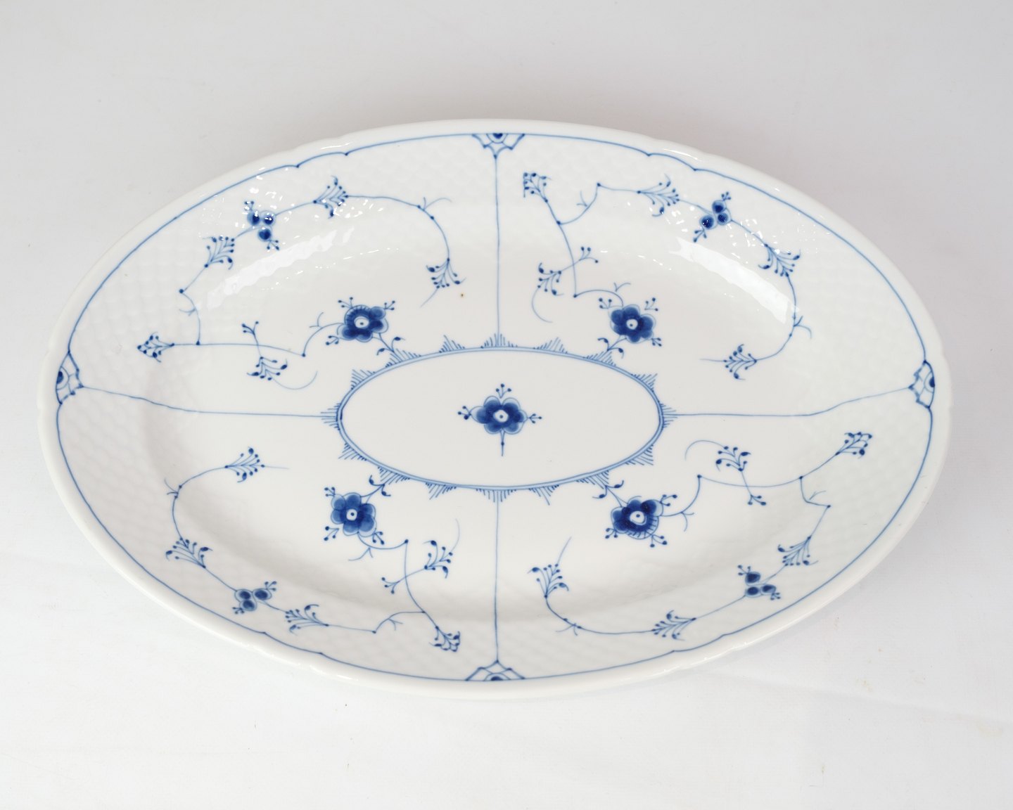Oval dish no. 15 from Bing & Grondahl. Made of porcelain with classic blue fluting design in hand-painted blue decoration.