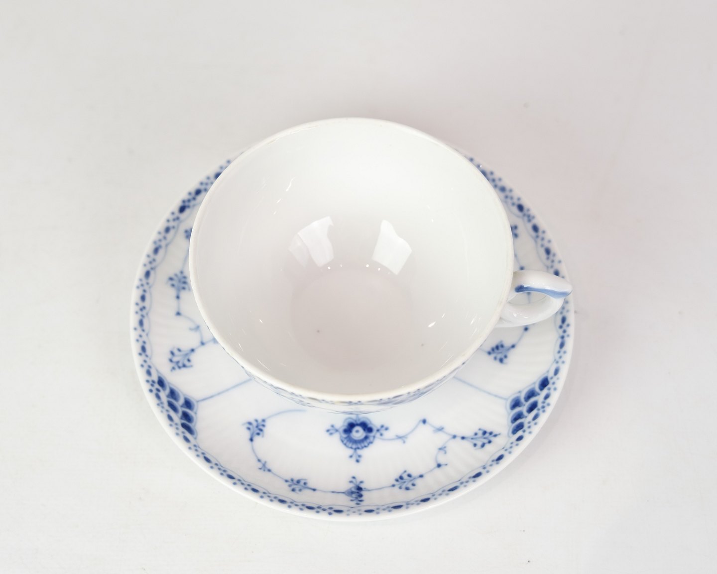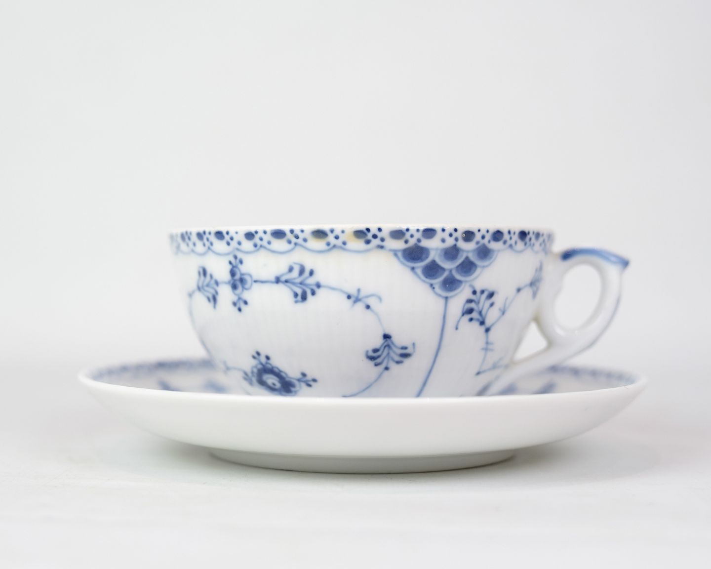 SoldTeacup with saucer of patterned blue fluting half lace model no. 656 with matching saucer.