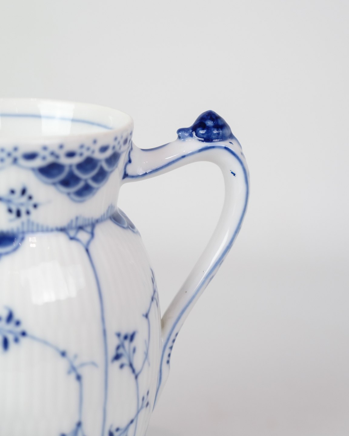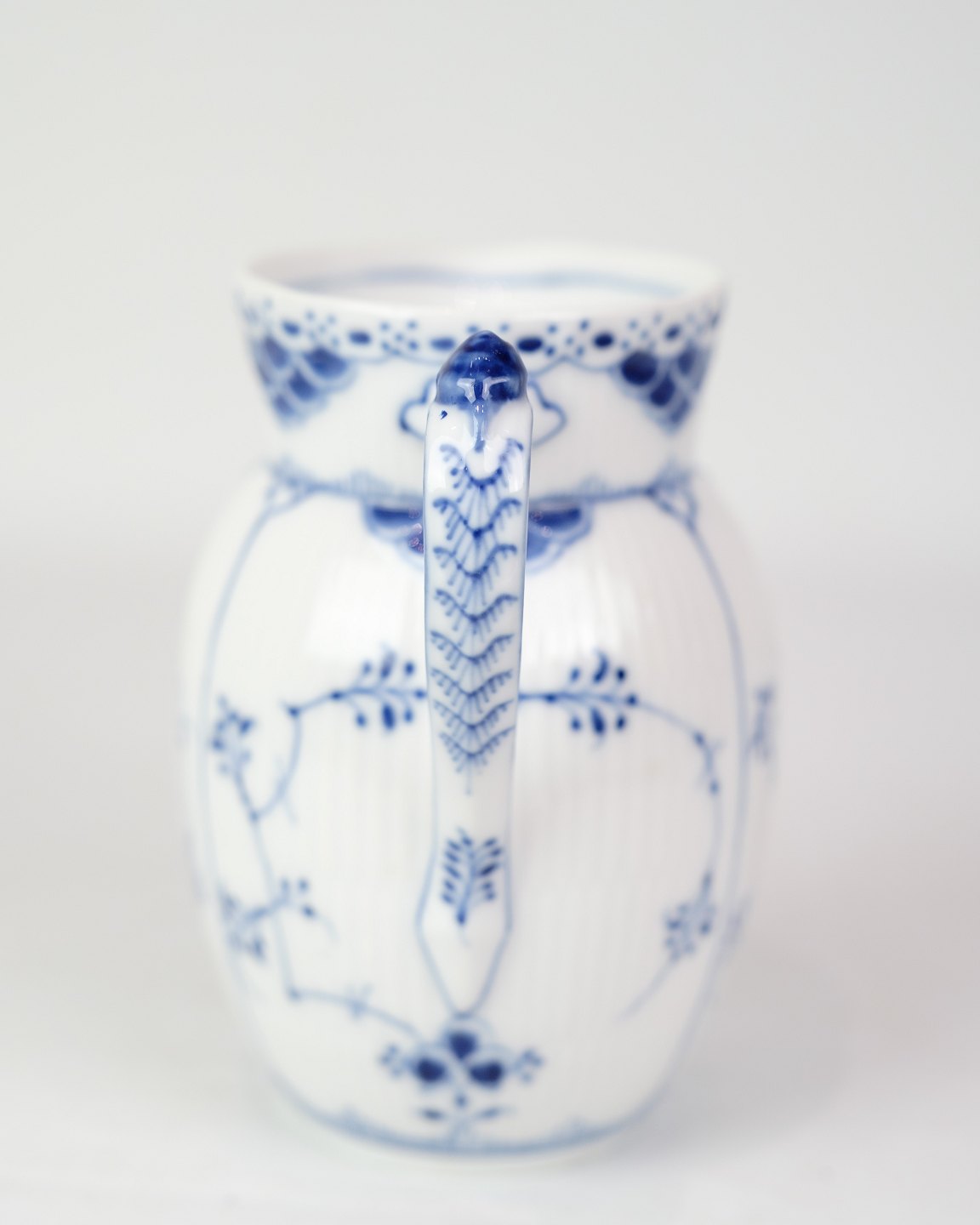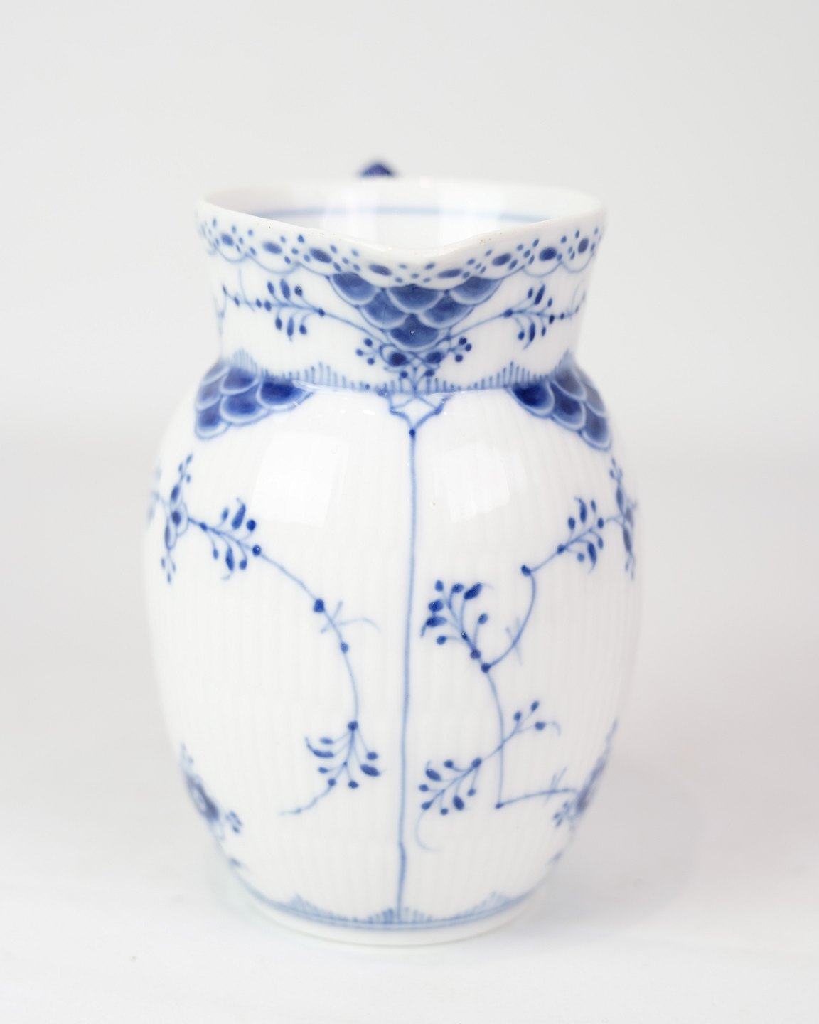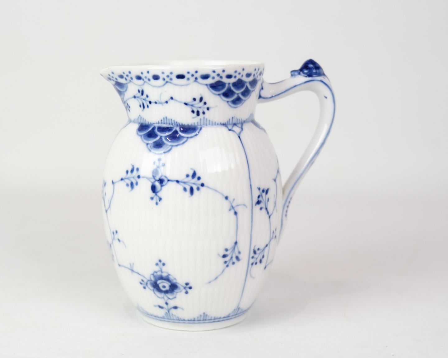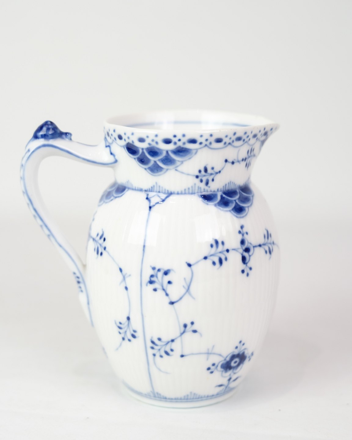 Jug marked 1/561 from Royal Copenhagen, made of porcelain. Made in blue fluting half lace design, hand painted in blue decoration.