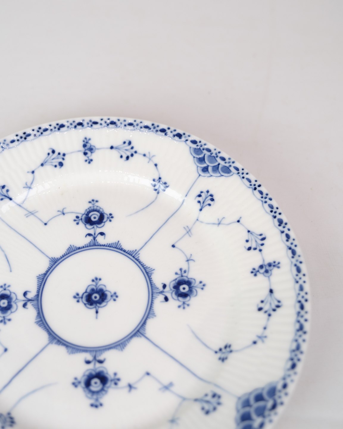 SoldLunch plate marked 1/578 from Royal Copenhagen. Made of porcelain with blue-fluted half-lace design, plate is hand-painted in blue decoration.