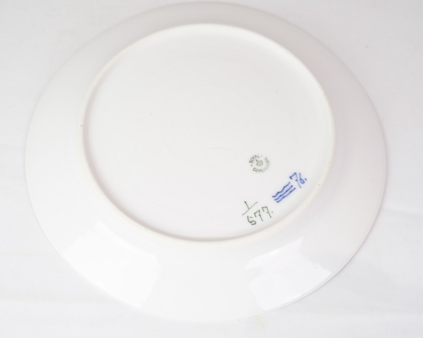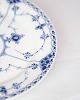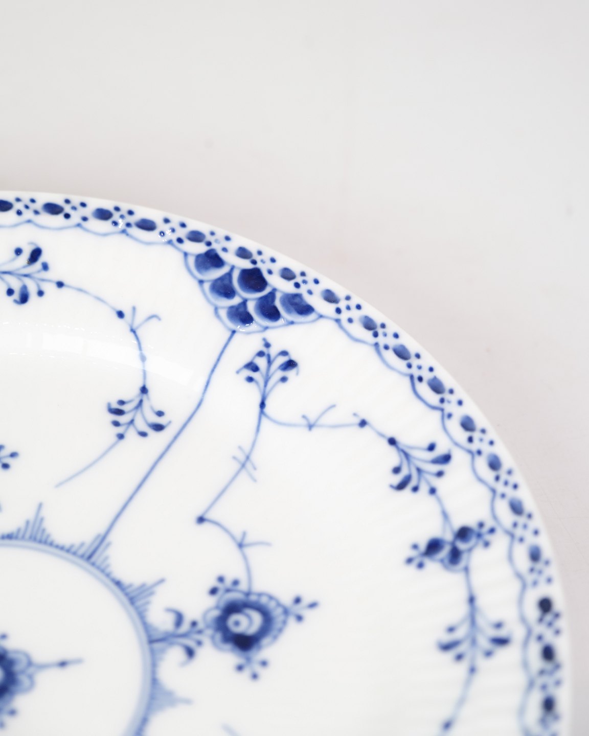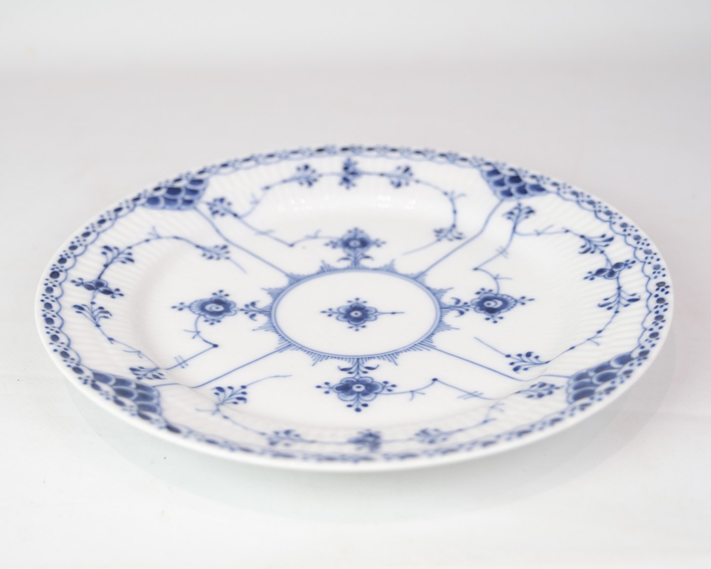 Middagstallerken mærket 1/577 fra Royal Copenhagen. Fremstillet i porcelæn med klassisk musselmalet halvblonde design. Håndmalet i blå dekoration.