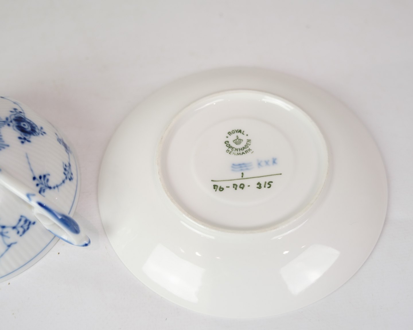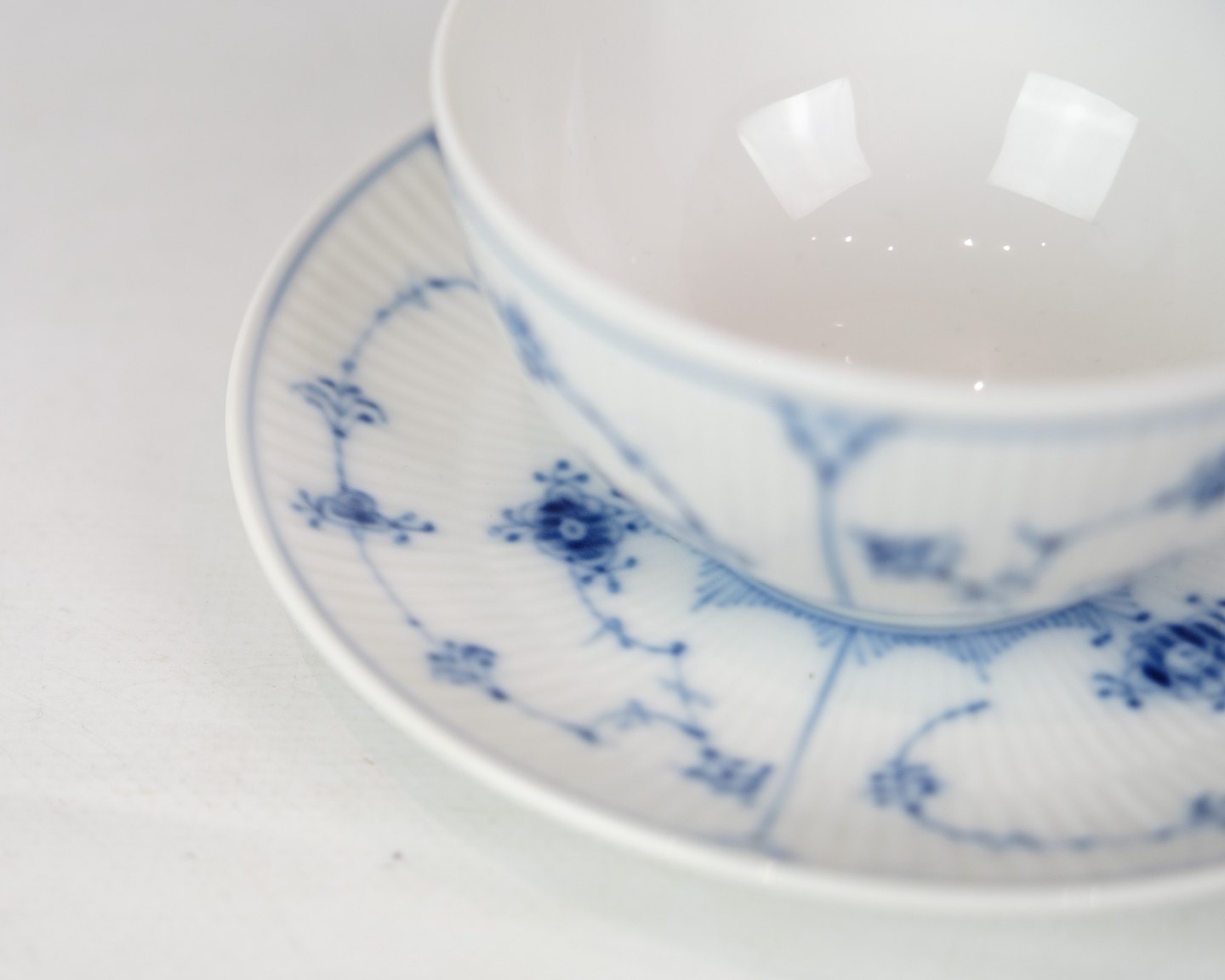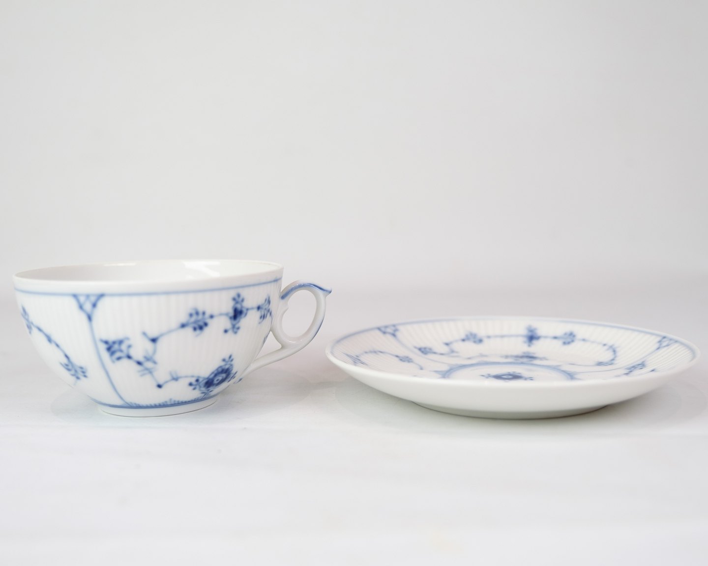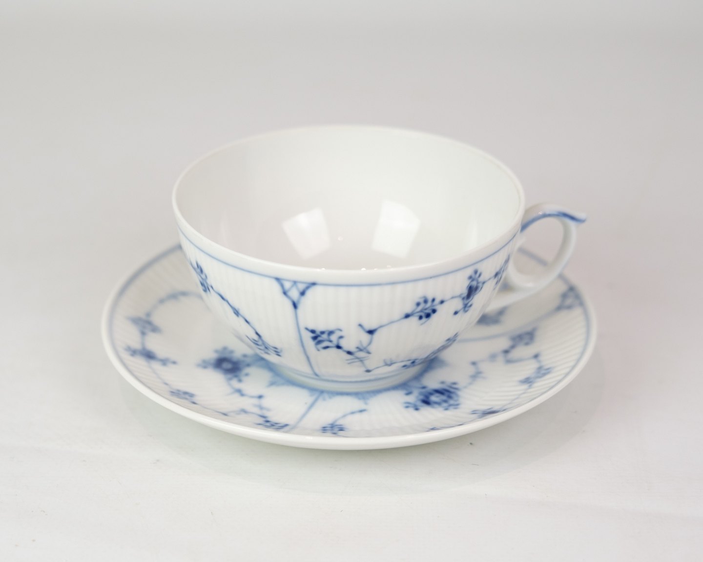Stor tekop med tilhørende underkop mærket 1/315 fra Royal Copenhagen. Fremstillet i porcelæn med klassisk musselmalet riflet design.