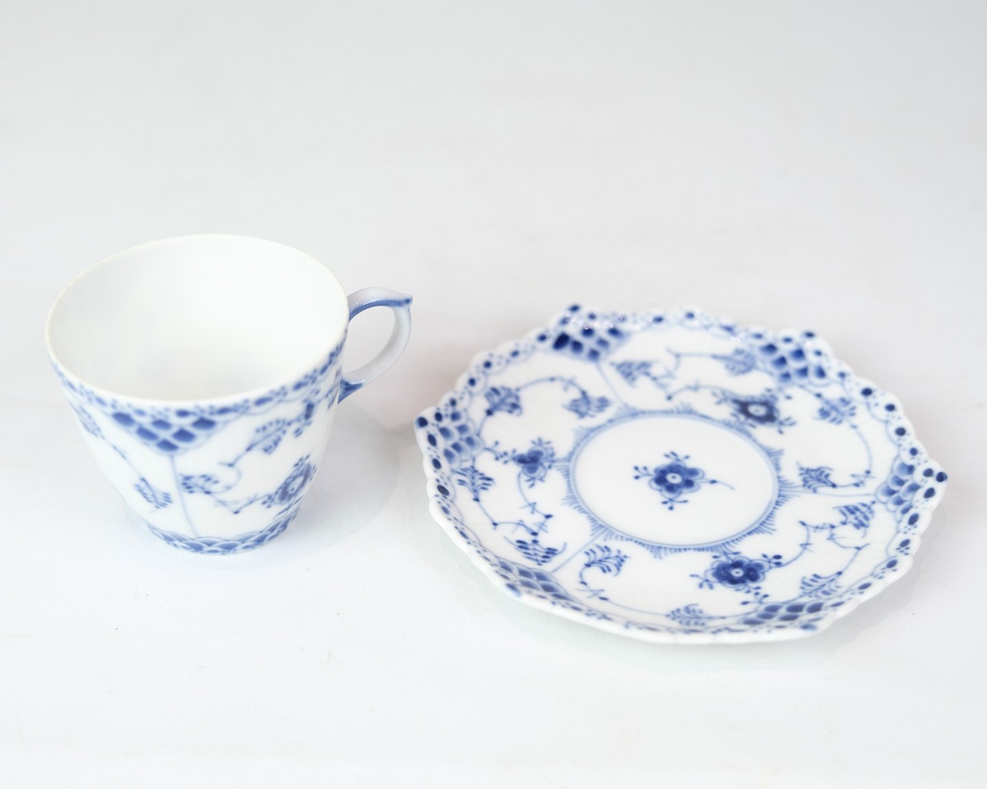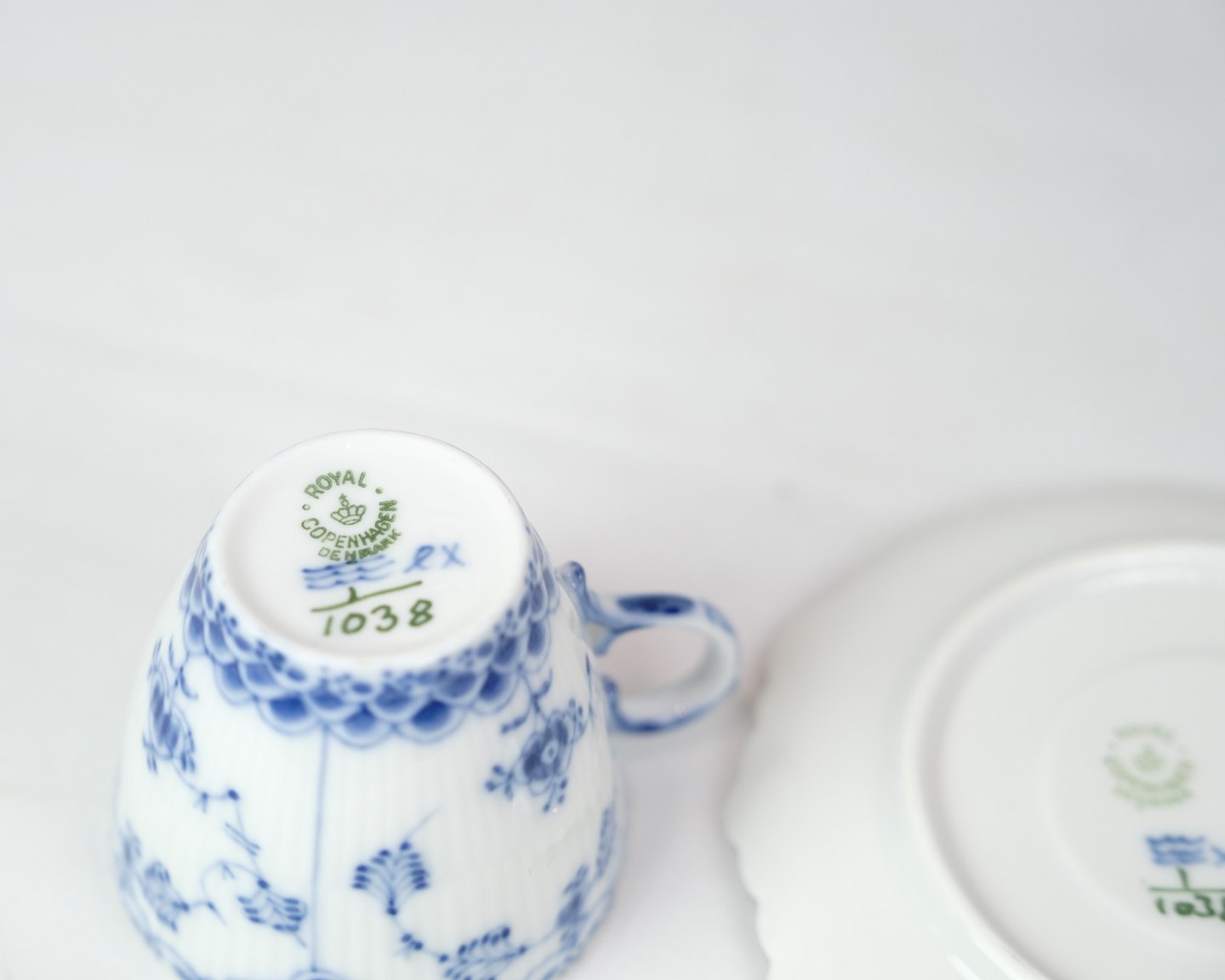 Kop med tilhørende underkop idealt til en espresso eller, som lille te / kaffe kop med mønstret musselmalet eller helblonde. Sættet har nr. 1/1038 og står i flot stand uden skår. For info omkring 1. eller 2. sortering kontakt os.
