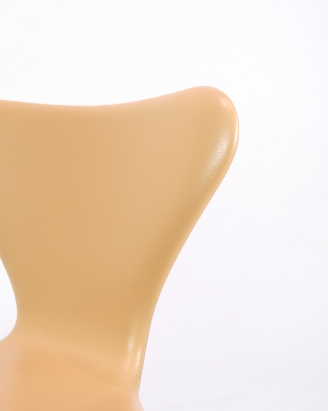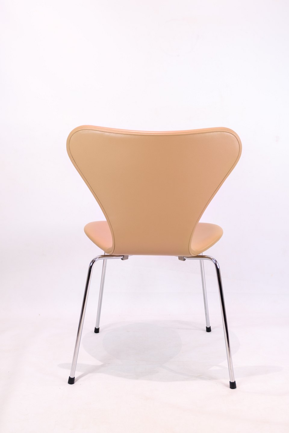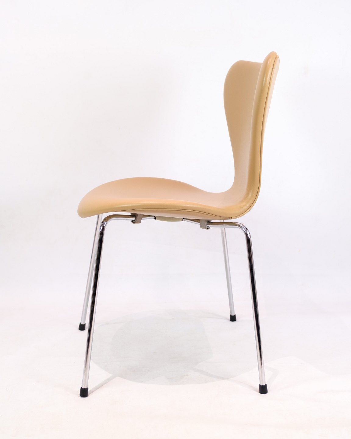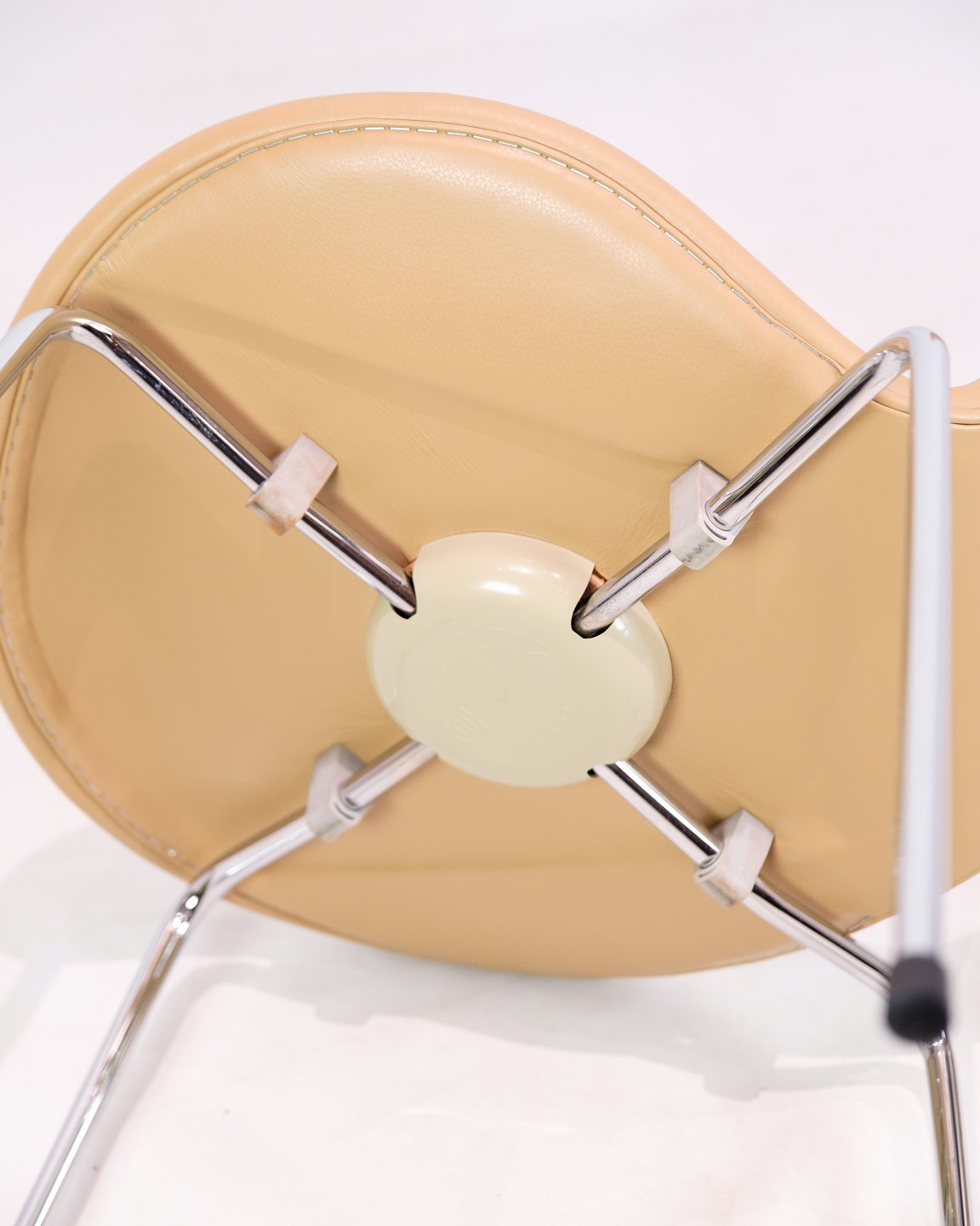 Syverstolen model 3107, designet af Arne Jacobsen og produceret af Fritz Hansen. Ny polstret i creamfarvet Elegance læder med stel i krom.