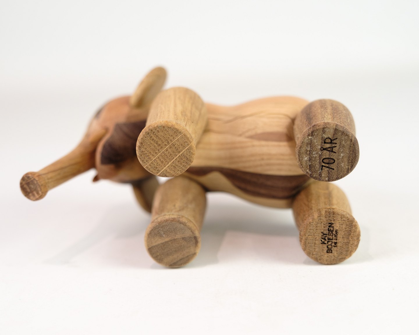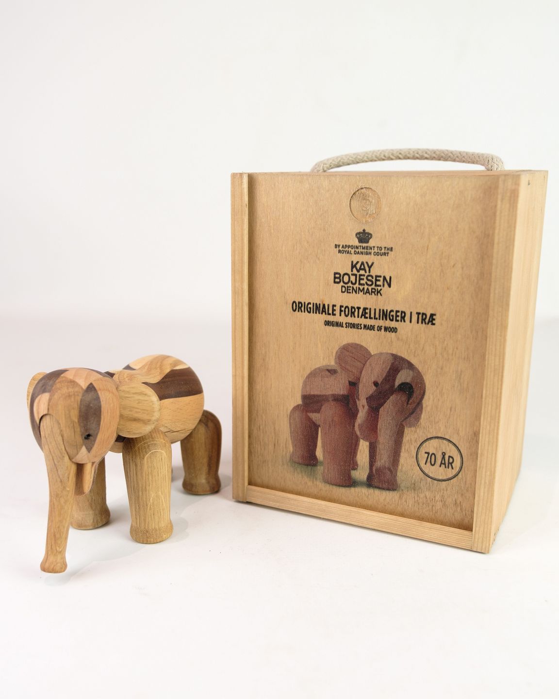 Kay Bojesen Reworked Mini elefant jubilæums model fra 2023 som fejring af 70-års jubilæum. Elefanten er en særudgave som er en del af reworked familien. Elefanten er udført i flere forskellige træsorter heriblandt teak, valnød, eg, ask & ahorn. Reworked udgaven er en del af Kay Bojesens svar på upcycling og genbruge det som ikke ville blive brugt, for også at minimere ressourcespild.