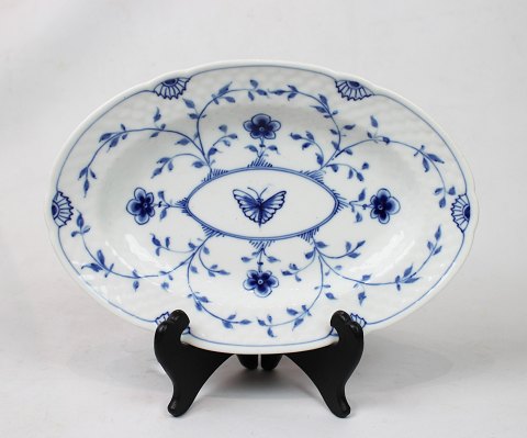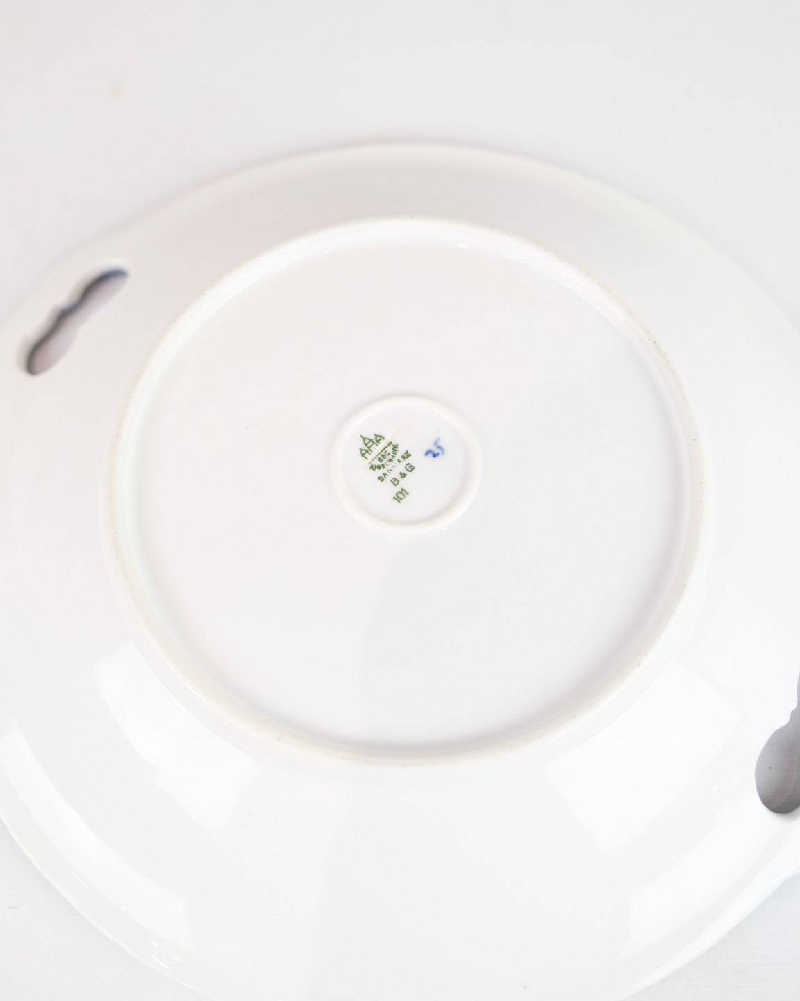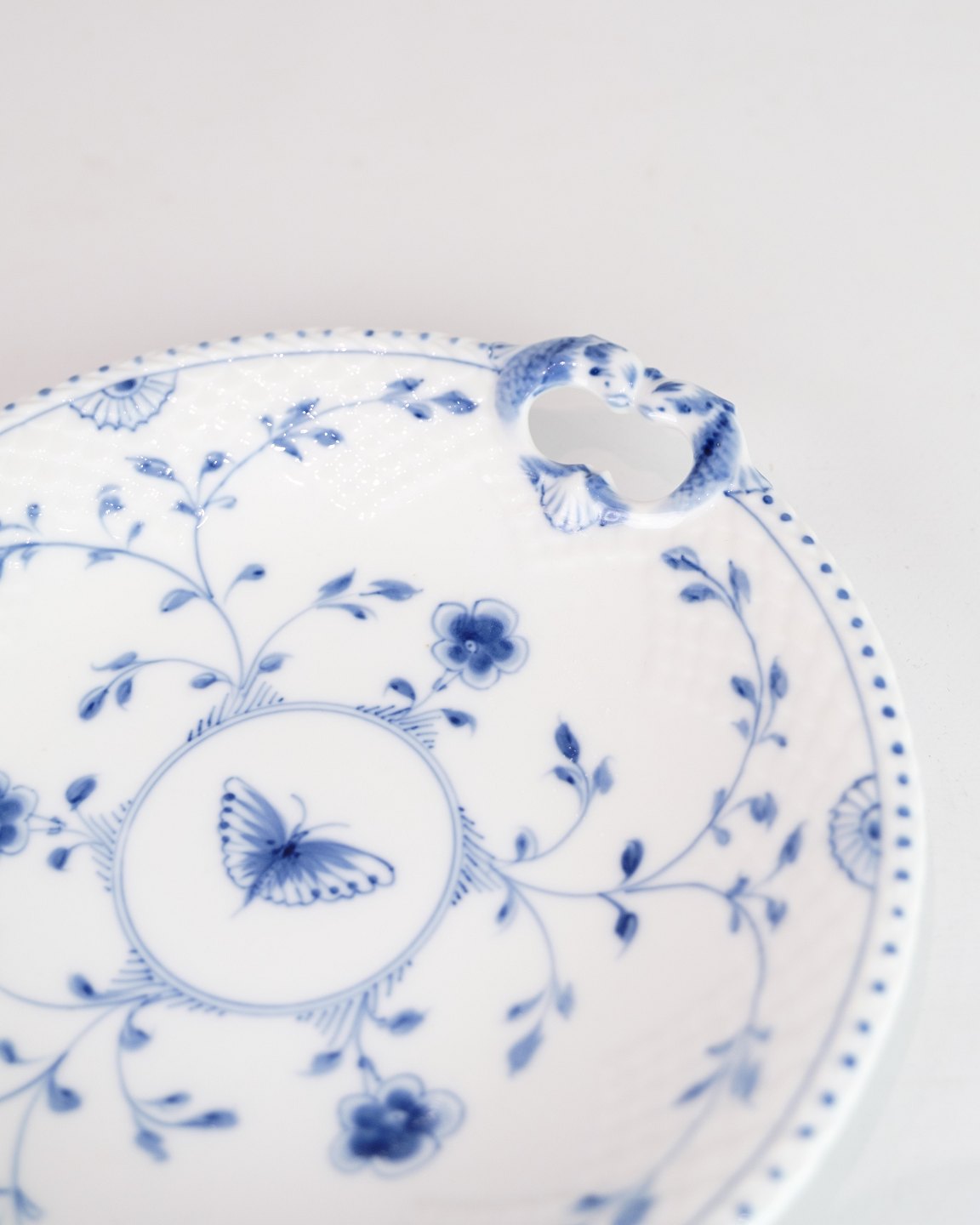 Rundt kagefad med hanke, model nr. 101, Designet af Frederik August Hallin fra Bing & Grøndahl. Dekoreret med Sommerfugl-motiv. Porcelæn med trykt stempel under bunden. Egnet til servering eller samling.