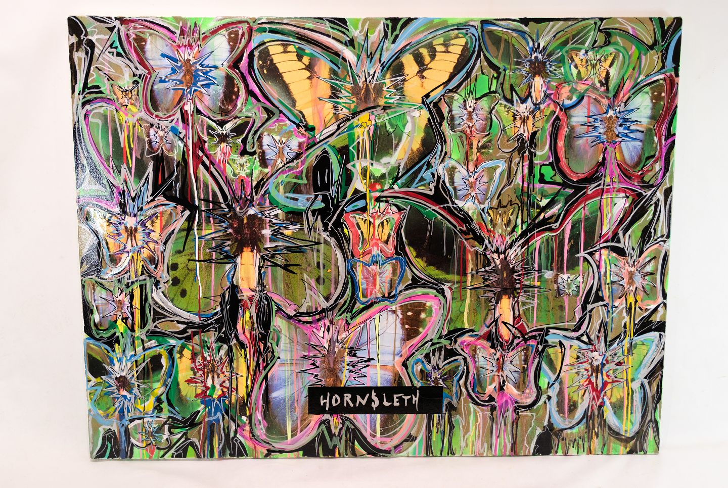 Originalt maleri af Kristian von Hornsleth i mixed media på lærred fra 2021 med titlen "Butterflies ART". Maleriet måler ca. 106 x 140 cm og er et karakteristisk eksempel på Hornsleths farverige og energiske stil. Værket er domineret af sommerfuglemotiver i lag på lag af kraftige penselstrøg, dryp og kontrastfulde farver, med det ikoniske "HORNSLETH"-navn centralt placeret.