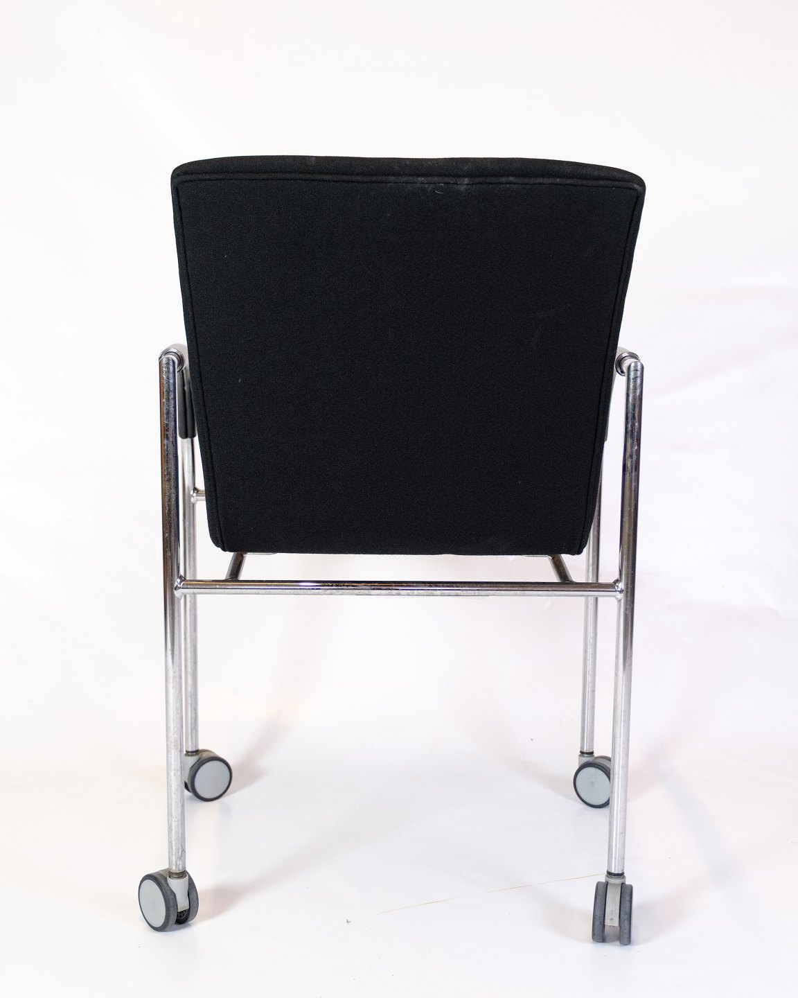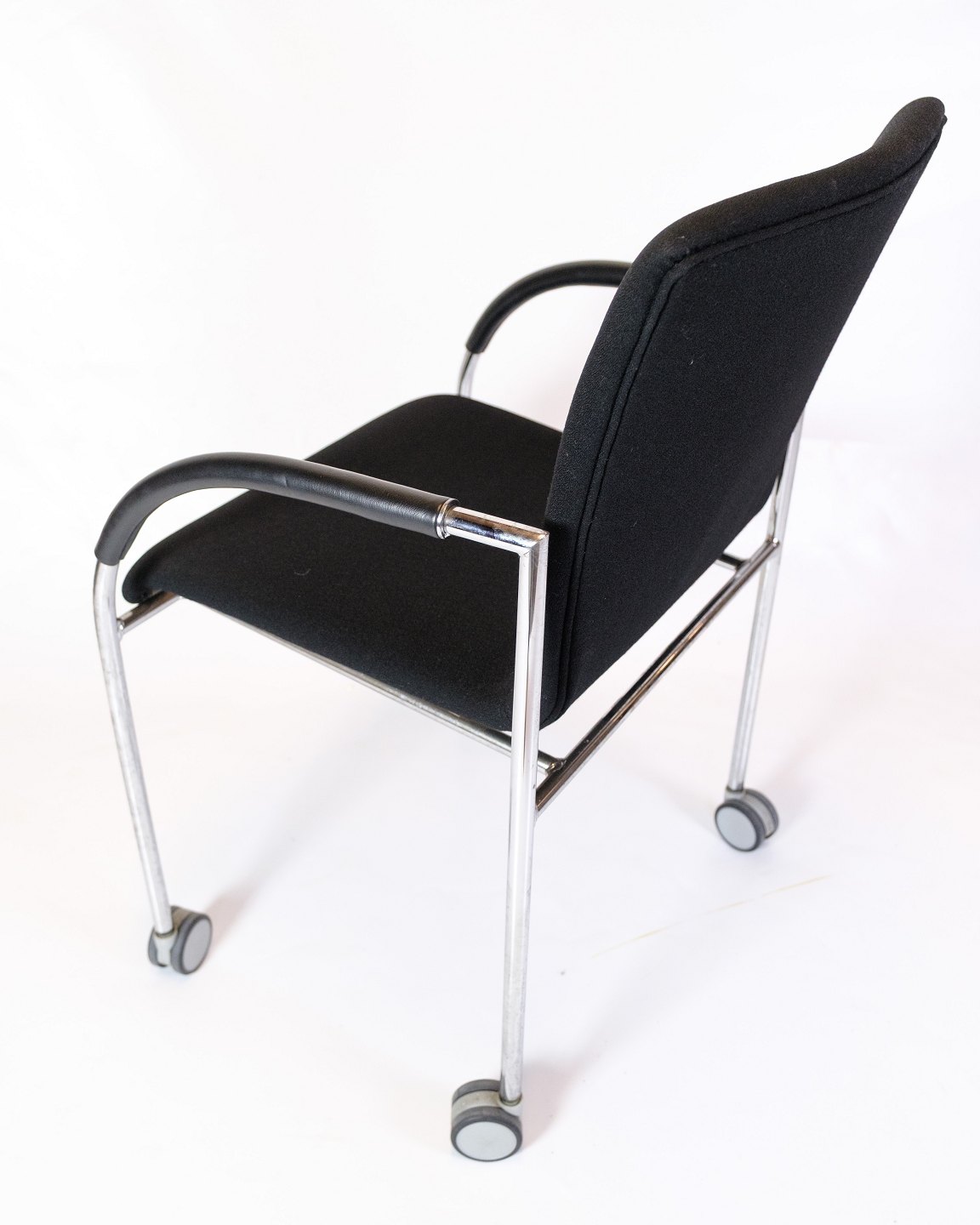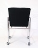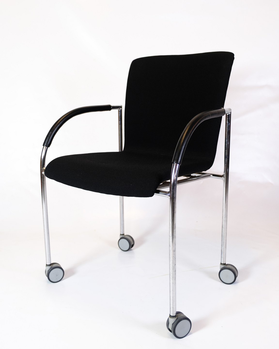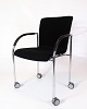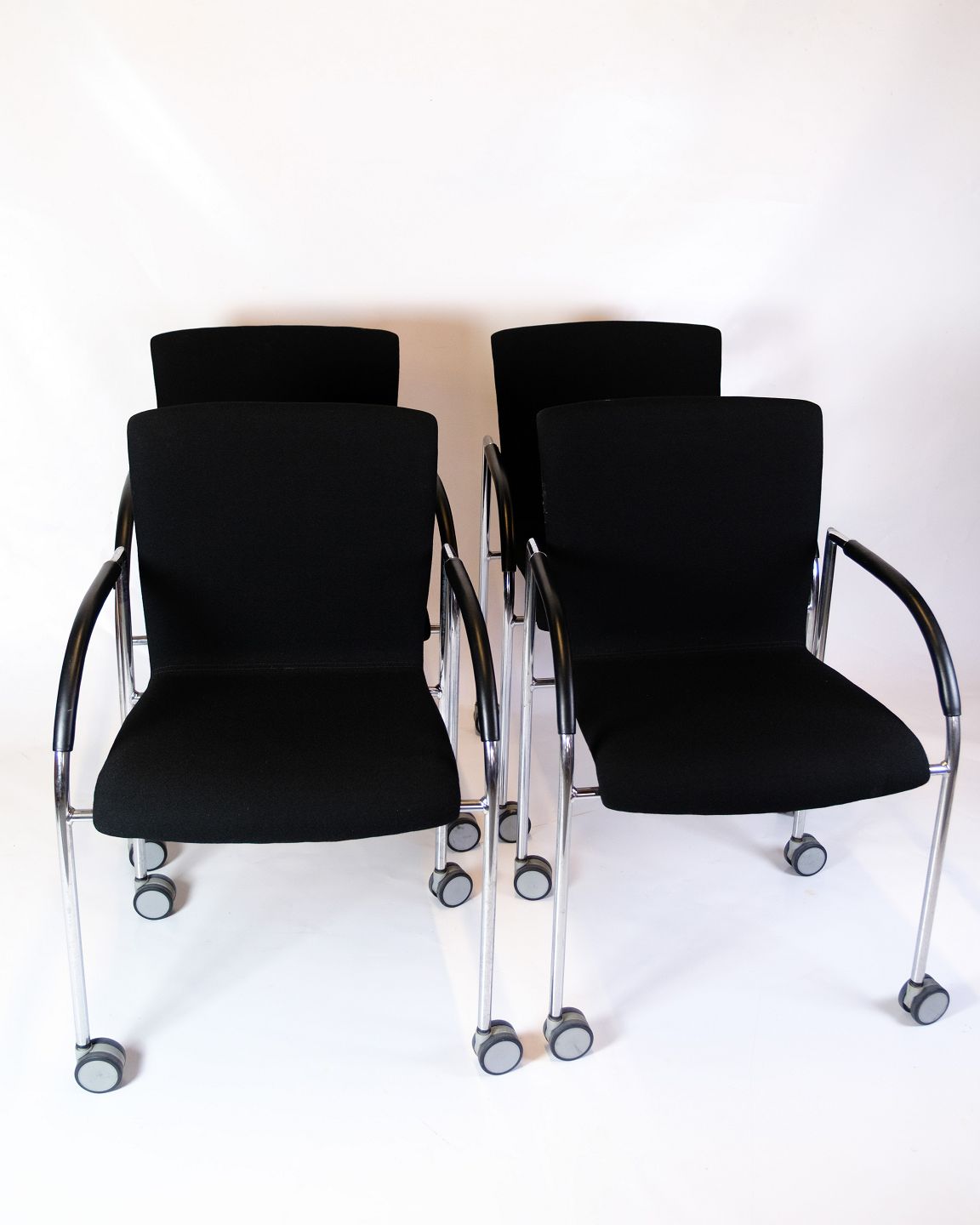 Sæt af fire konference stole af sort stof med læder arme for komfort. Stolen er fremstillet i krom med fire hjul. Stolene står i flot brugt stand.