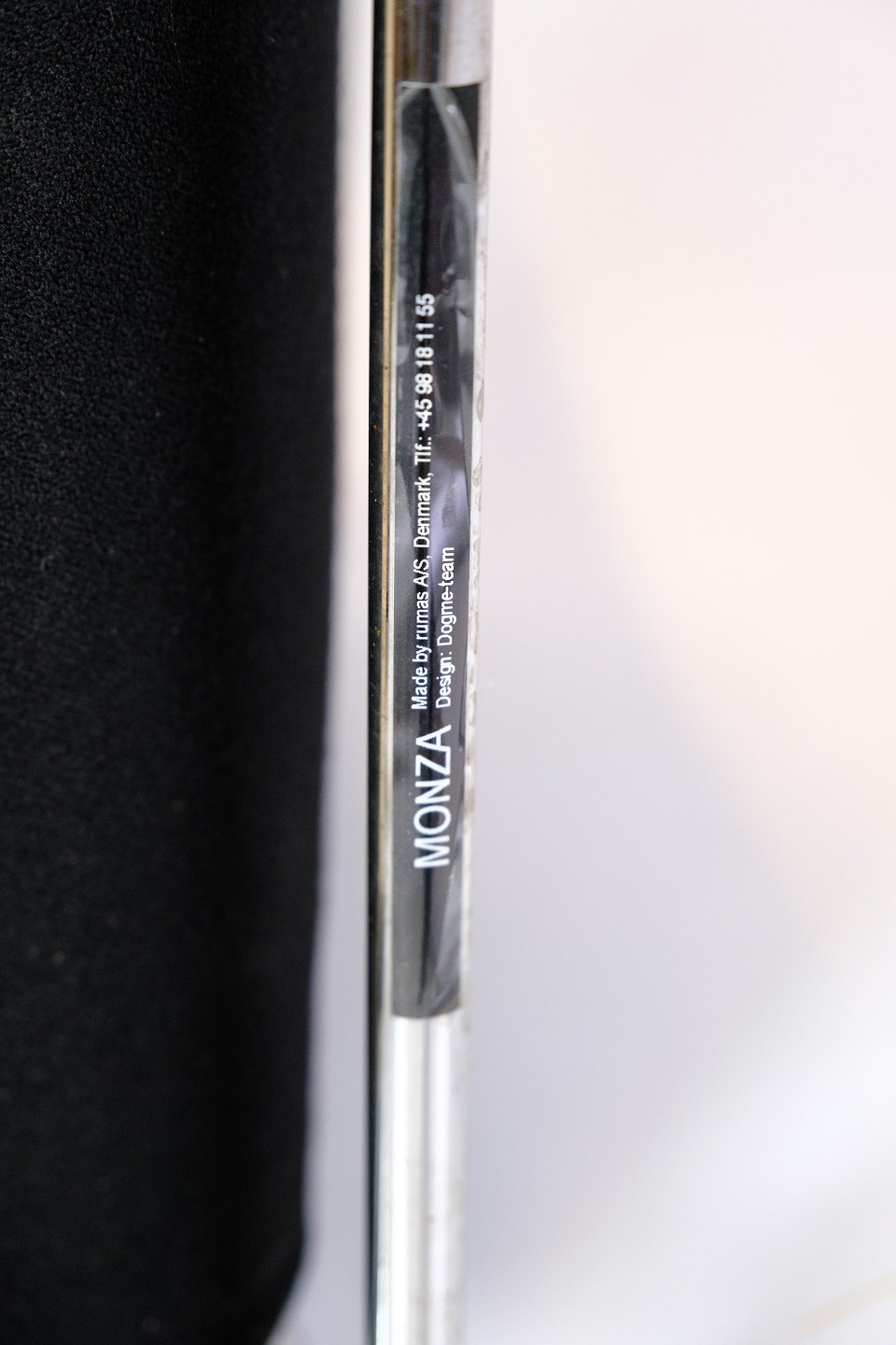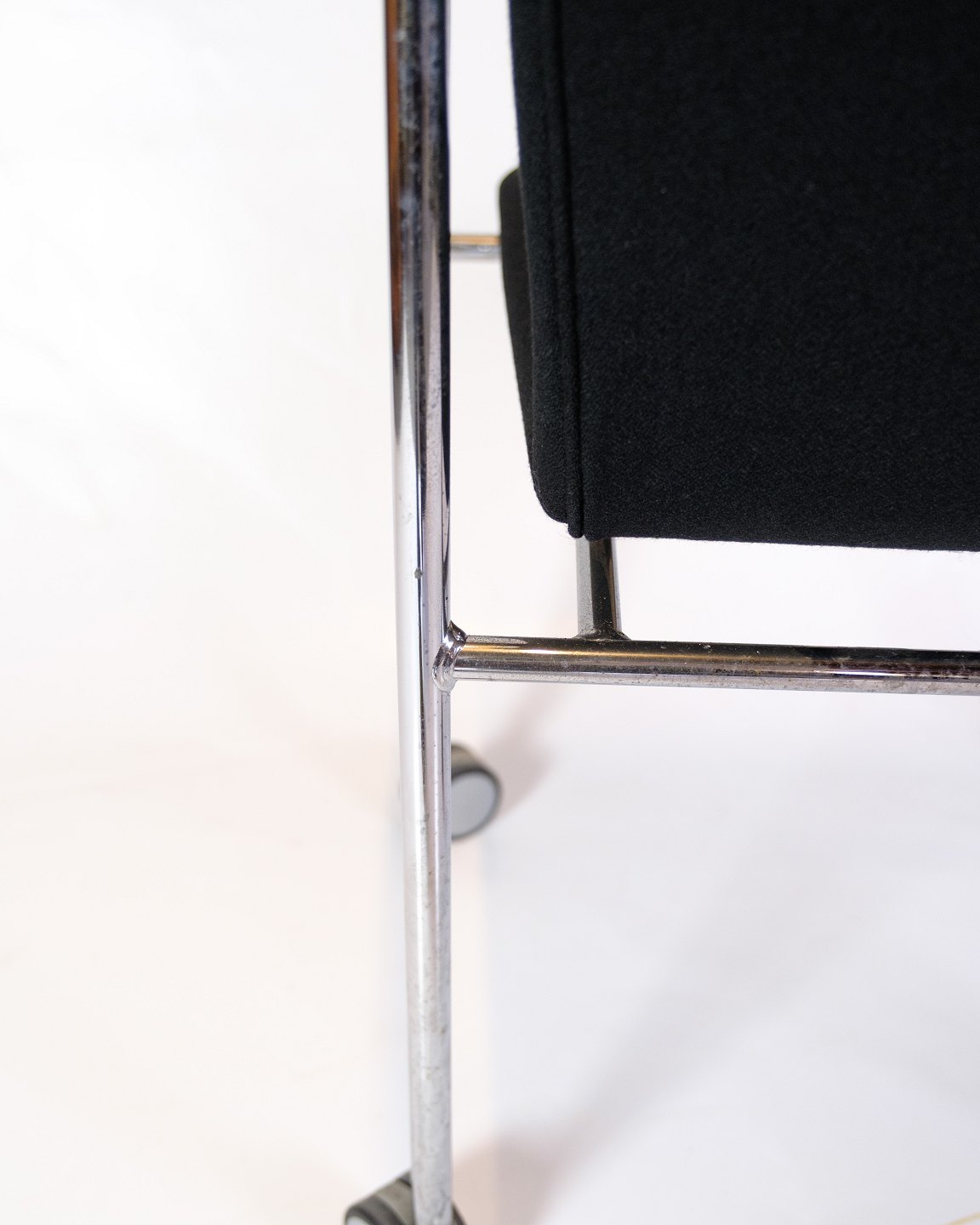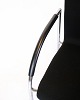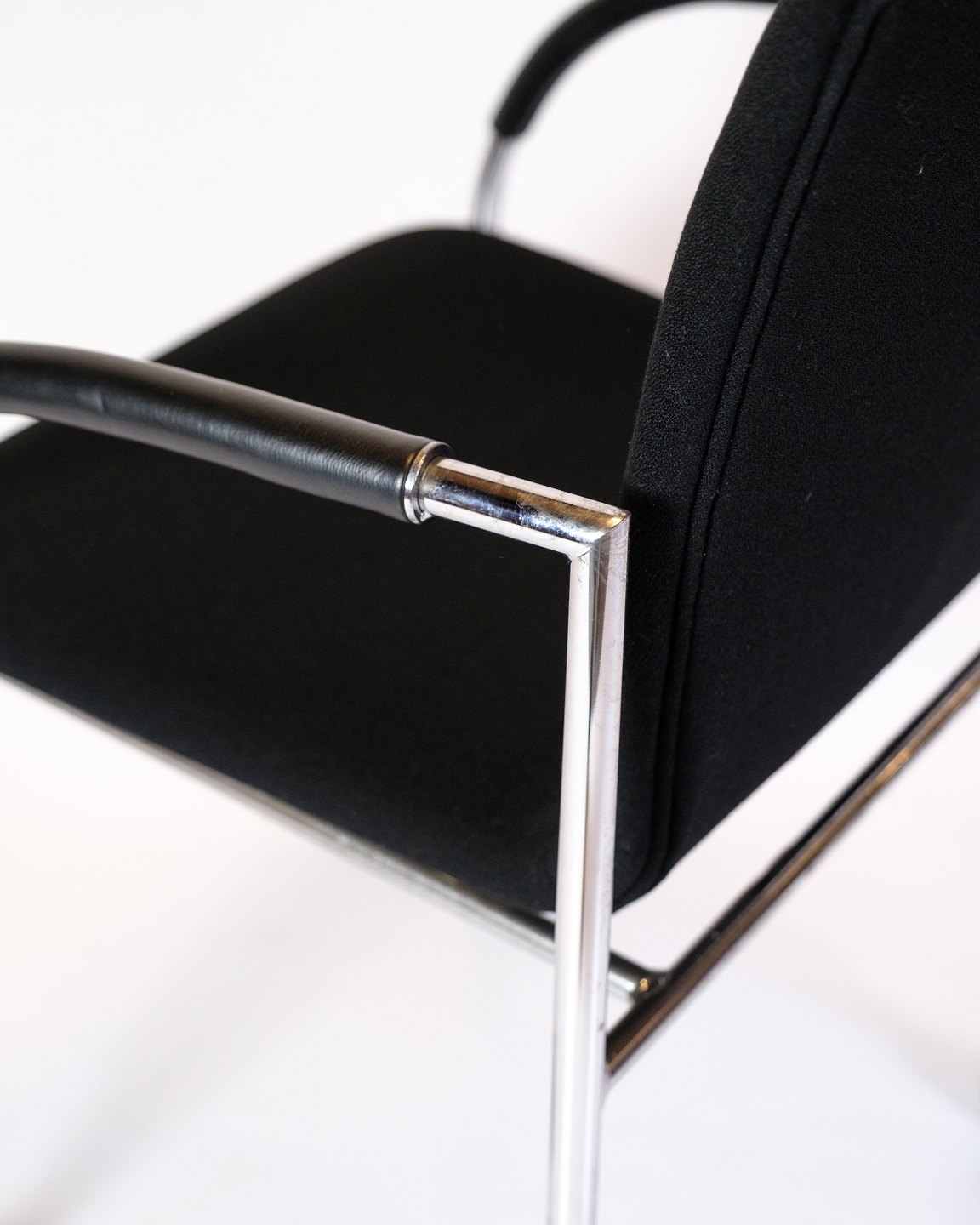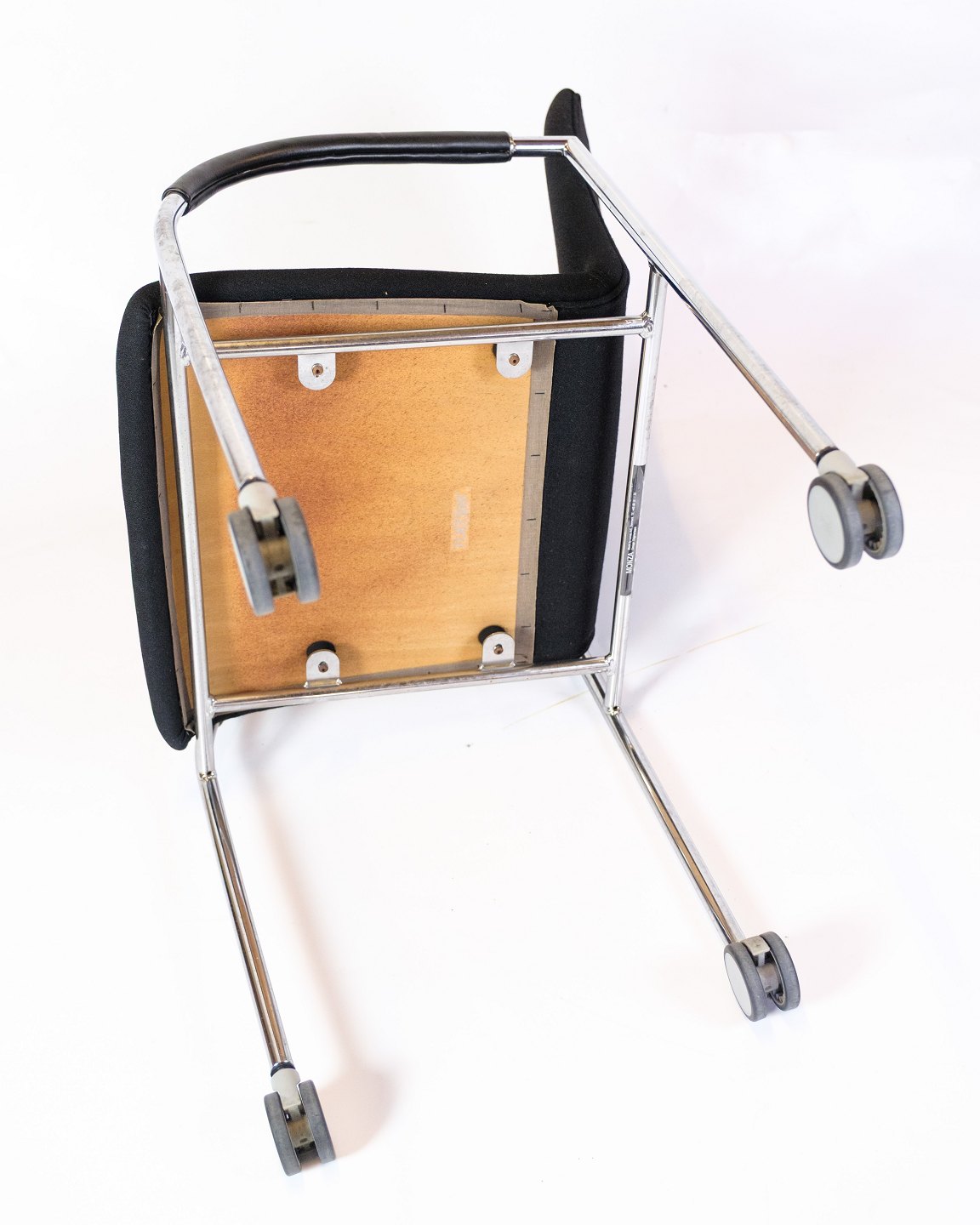 Sæt af fire konference stole af sort stof med læder arme for komfort. Stolen er fremstillet i krom med fire hjul. Stolene står i flot brugt stand.