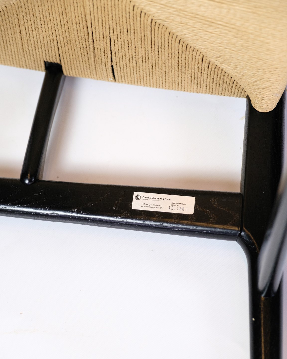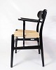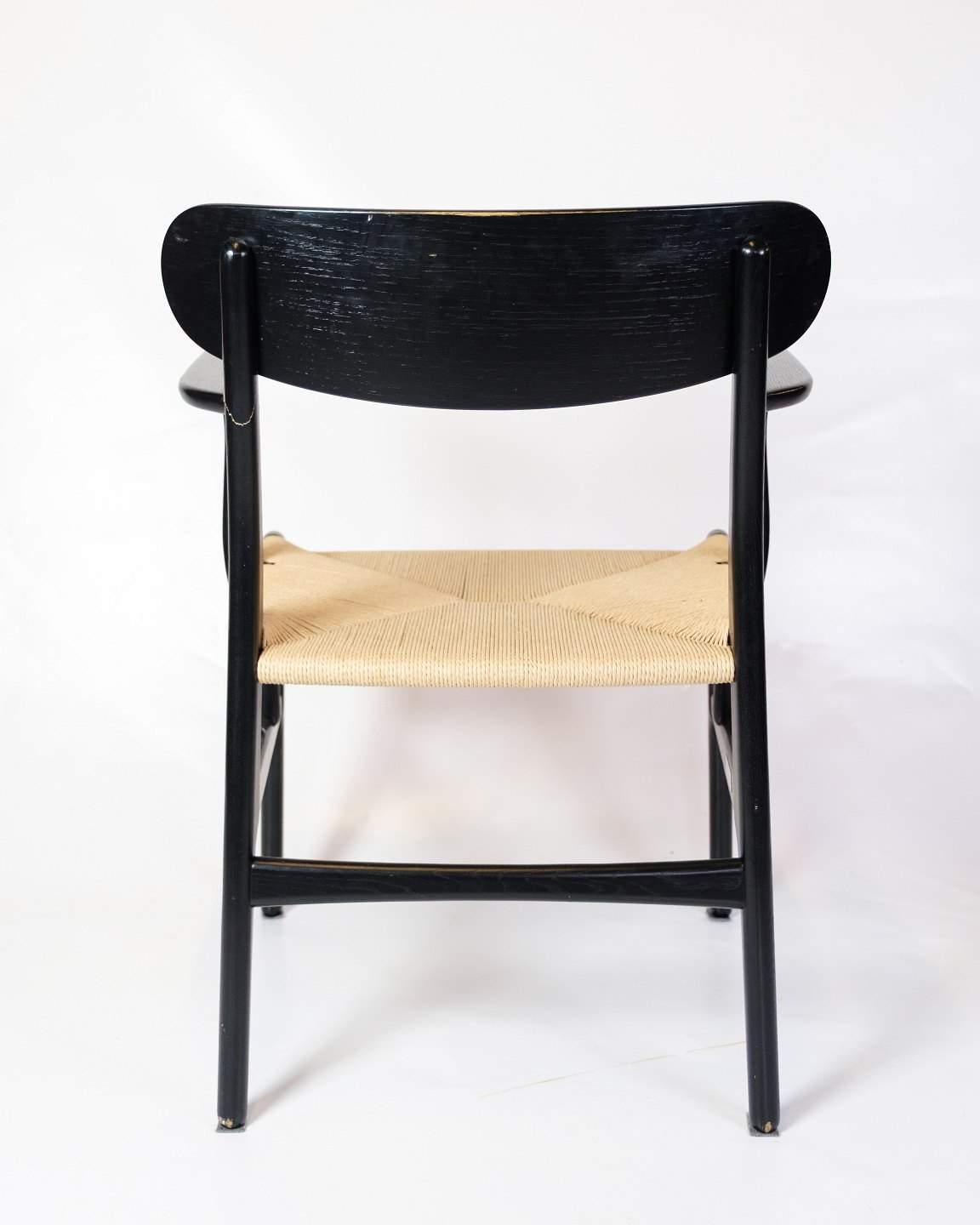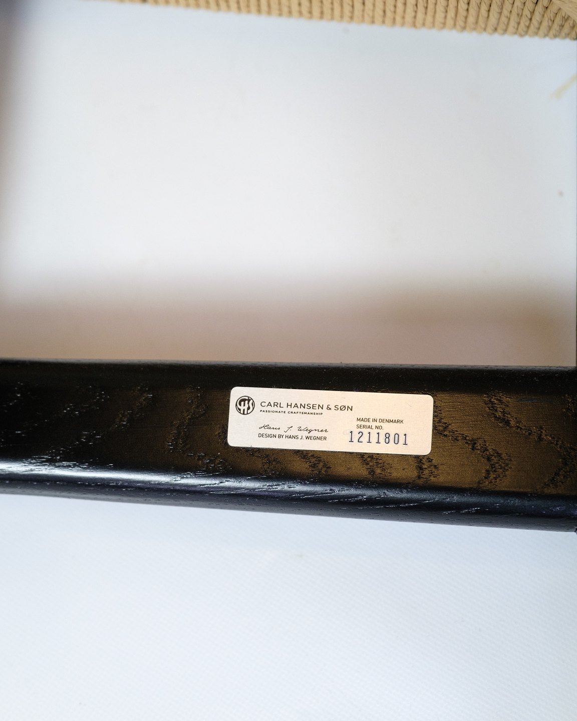 SoldArmchair with arms, model name CH26 made of black oak with light paper yarn made by Carl Hansen & Son. The CH26 chair is a design by Hans J. Wegner from the 1950s and is actually one of the more complicated to produce based on the curved shapes. During the release of the chair, which was also Wegner's debut Collection in their collaboration, Wegner lived with the family behind Carl Hansen & Son to follow the process. Very few copies were sold at the time due to the price, which was driven by the complex production. Today, newer machines have been used to make the chair, which has become one of Wegner's classics.