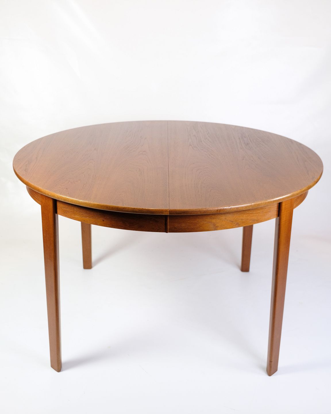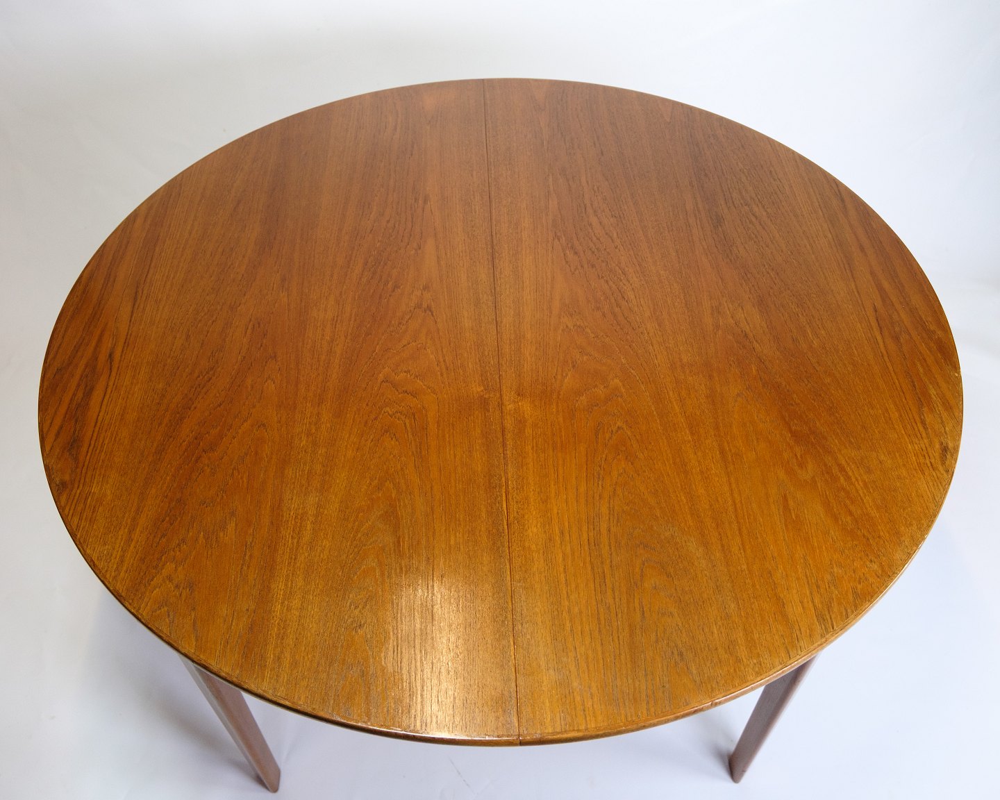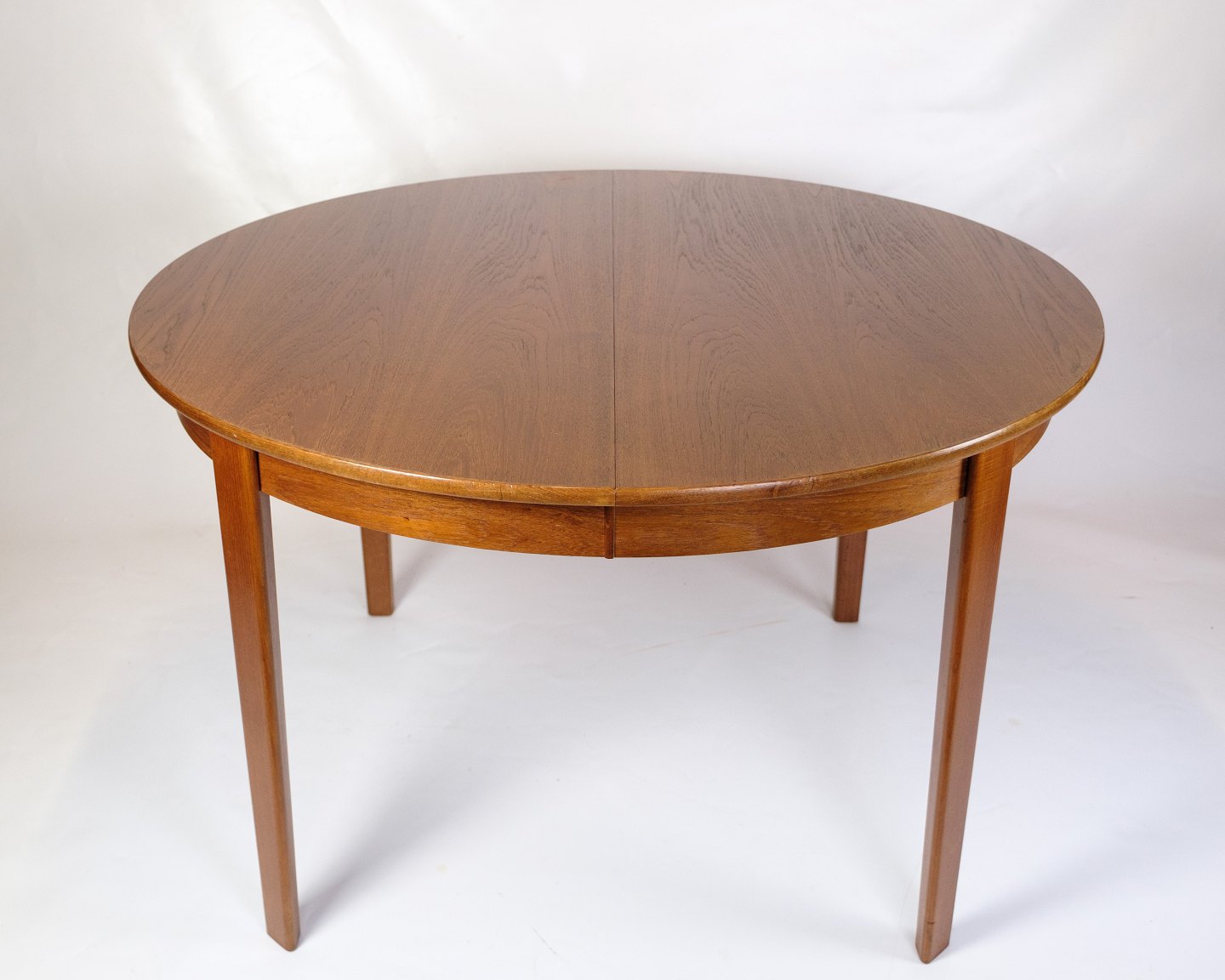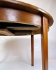 SolgtRundt spisebord i teak med fire tillægsplader, fremstillet i Danmark i 1960’erne. Bordet kan udvides med op til fire plader, hvilket er sjældent og giver stor fleksibilitet.