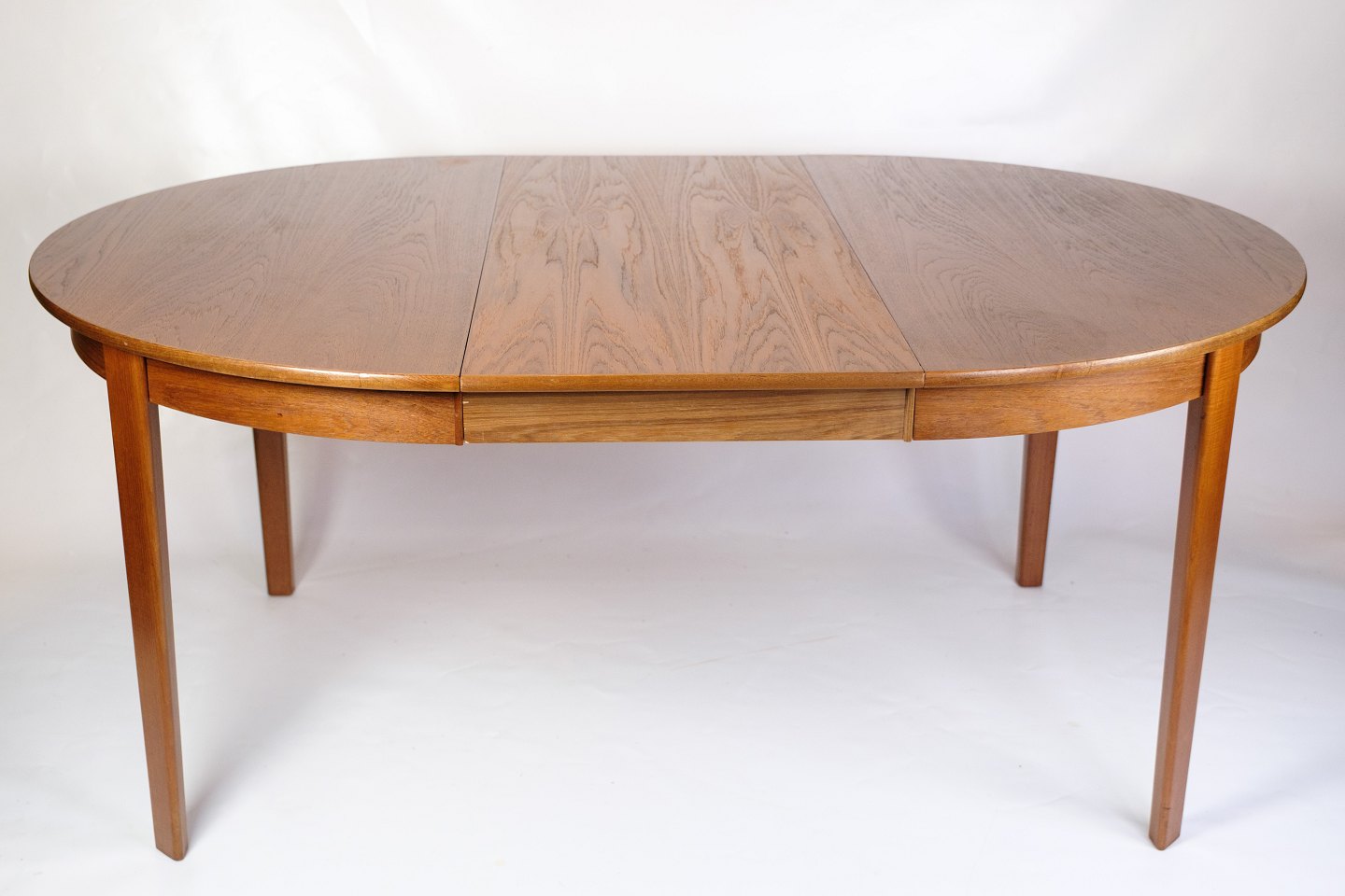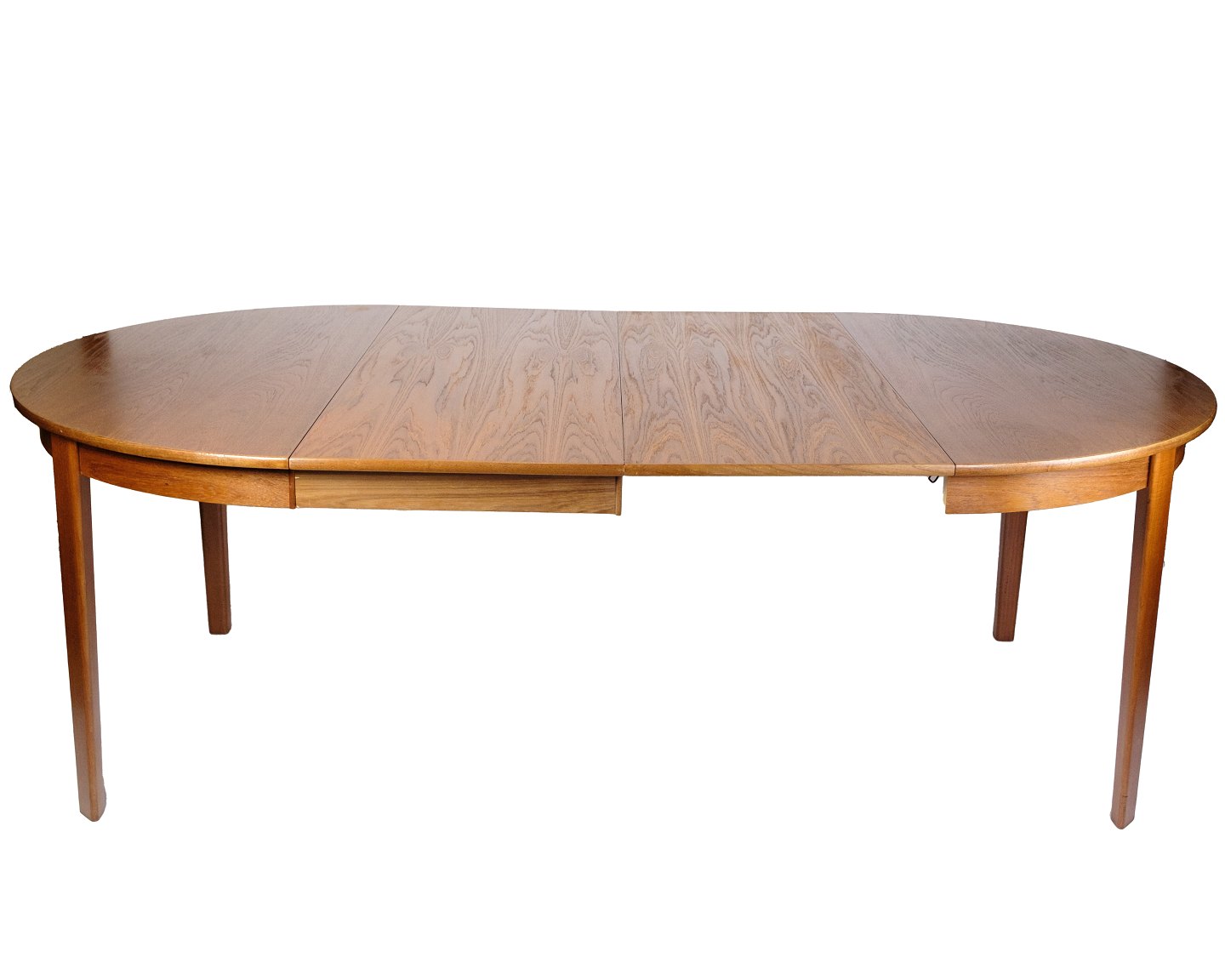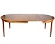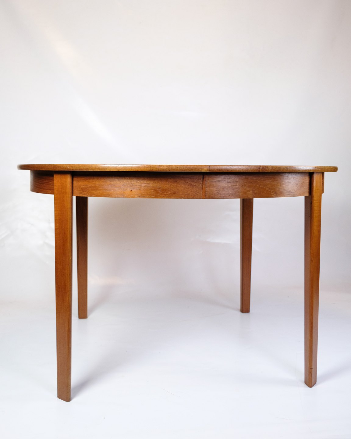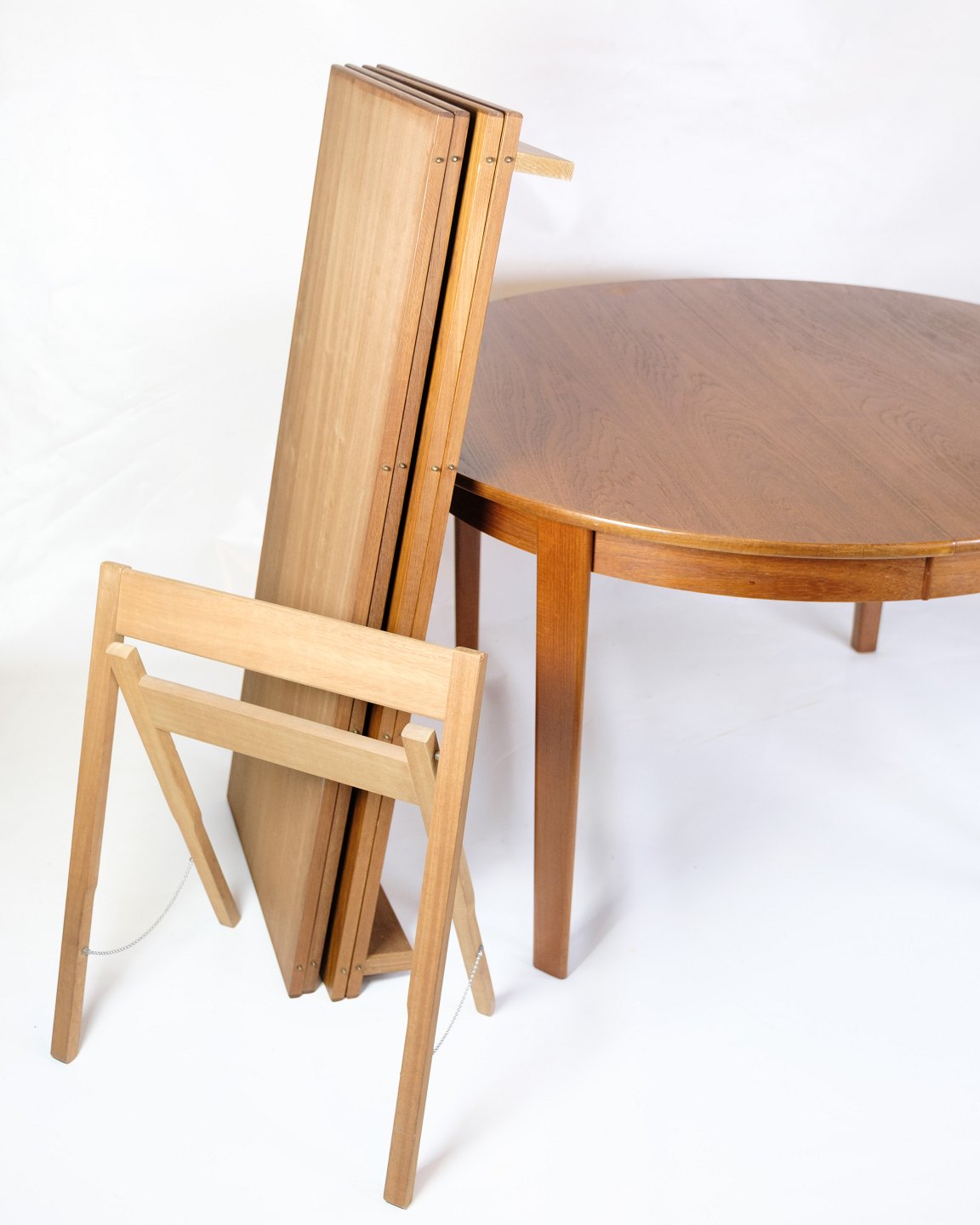 SolgtRundt spisebord i teak med fire tillægsplader, fremstillet i Danmark i 1960’erne. Bordet kan udvides med op til fire plader, hvilket er sjældent og giver stor fleksibilitet.