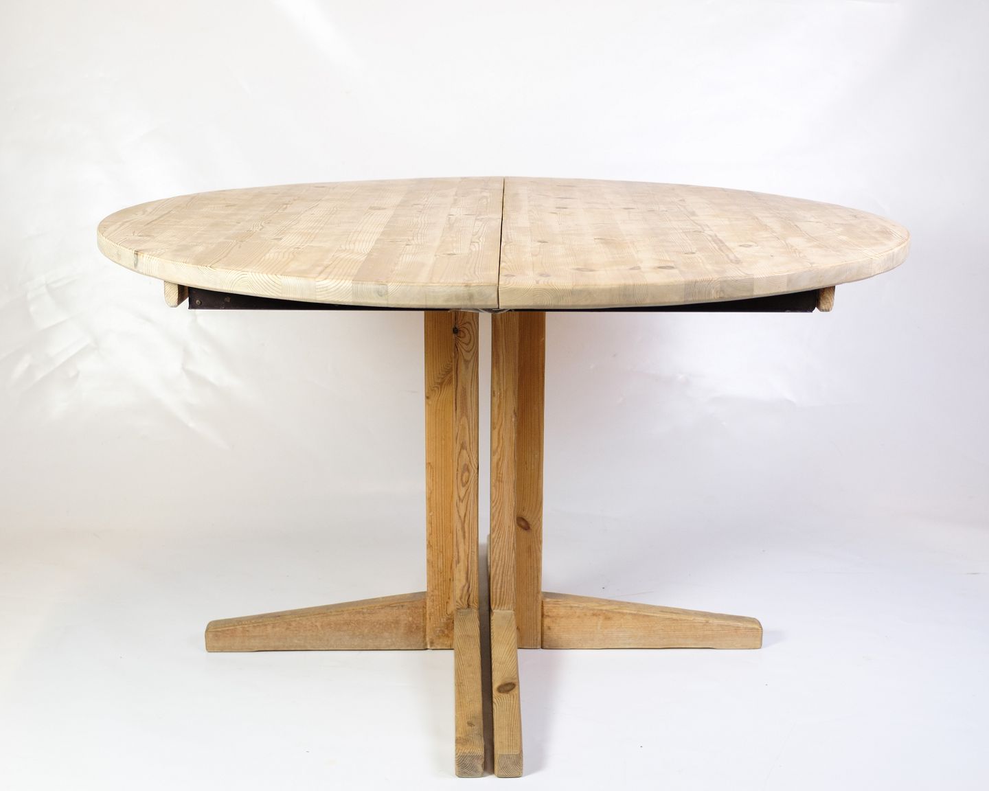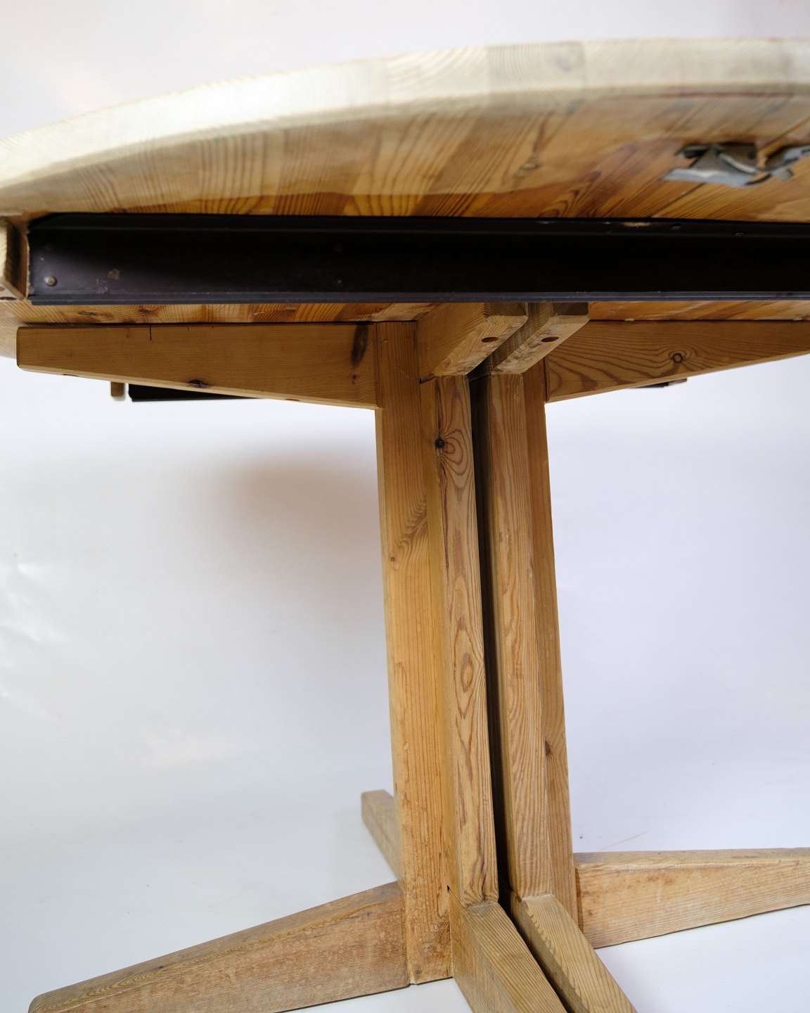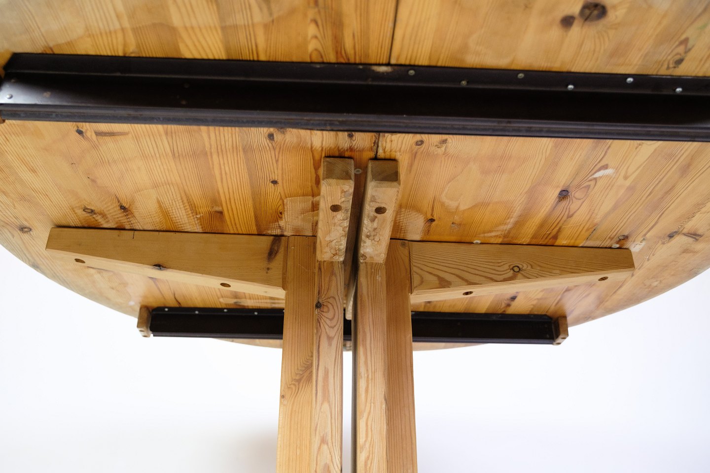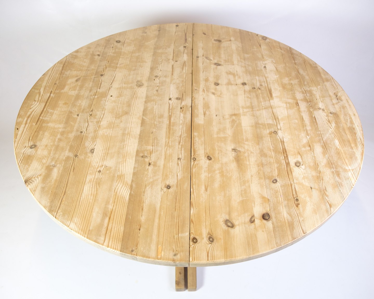 SoldRound dining table with extension in solid pine from the 1970s. Made with a three-legged frame and natural surface. The table comes with two extension leaves that provide extra space as needed. A solid and functional table with classic 70s design.