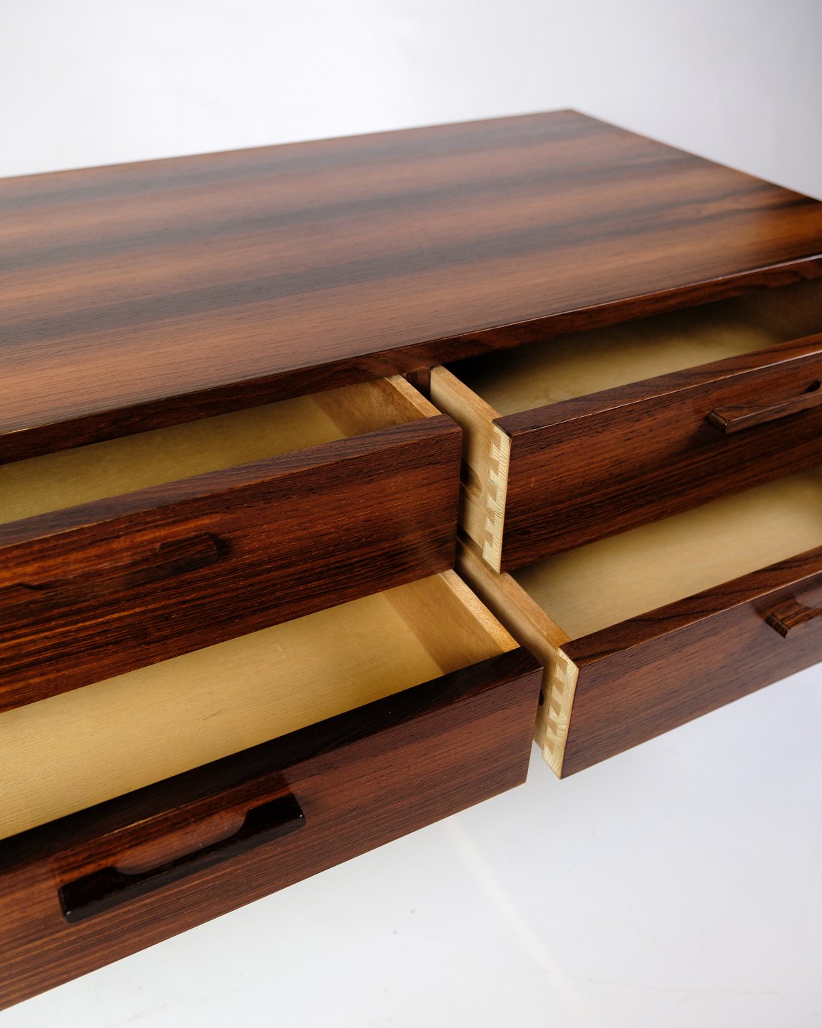 SolgtLille kommode i palisander med fire skuffer, ideel til opbevaring i stue, soveværelse eller kontor. Kommoden er fra ca. 1960’erne og repræsenterer klassisk dansk design med fokus på funktionalitet og naturlige materialer.