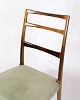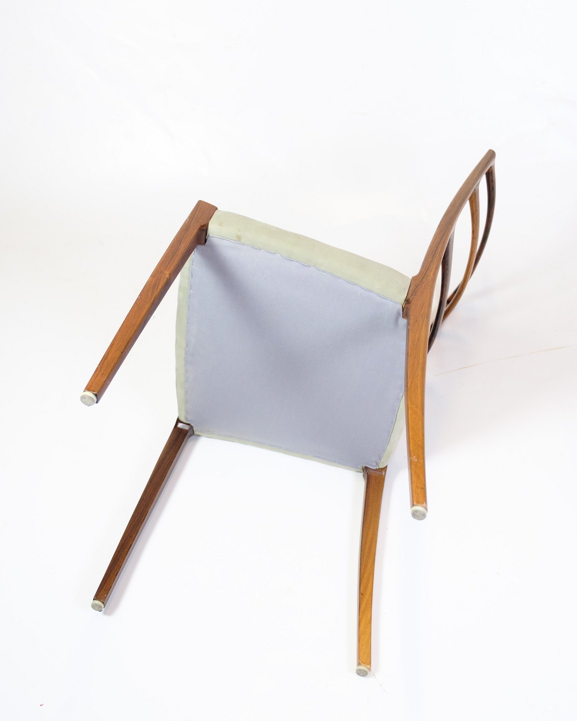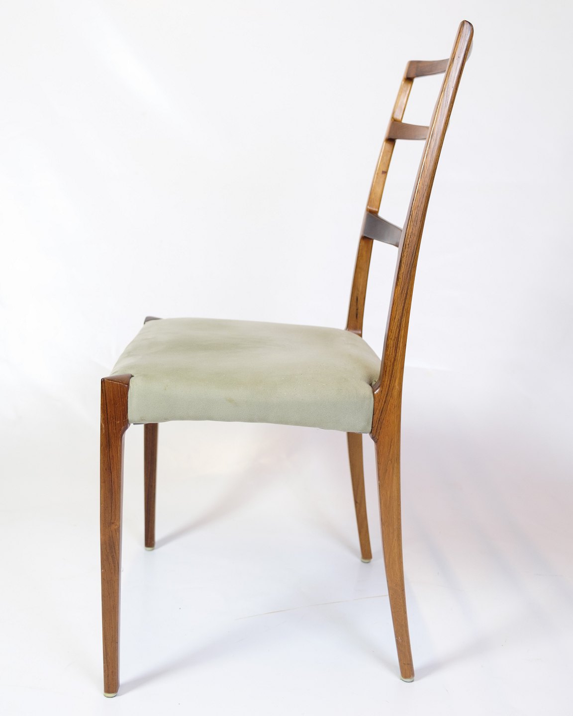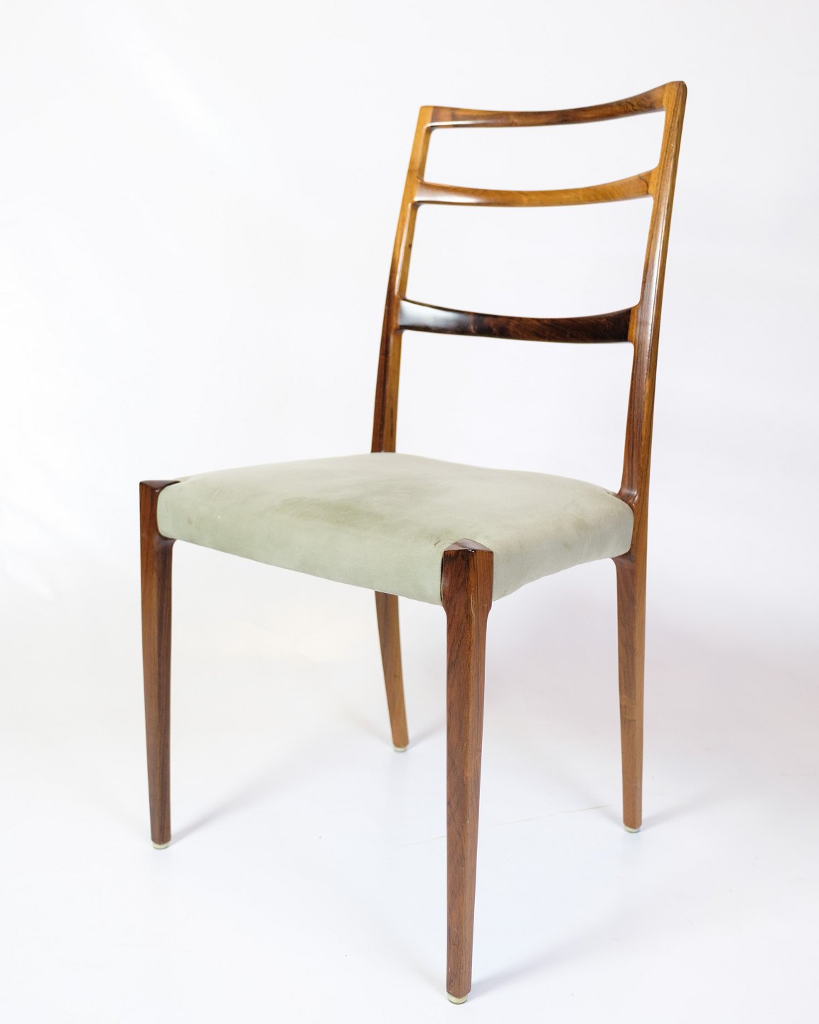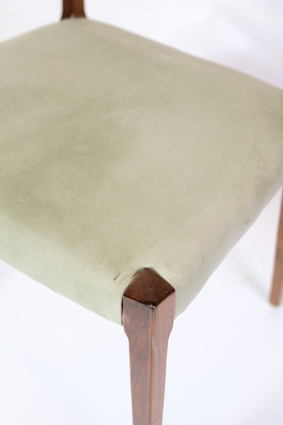 Set of six high-backed dining chairs from Sorø Møbelfabrik, made of rosewood with upholstered seats in green velvet. Produced in the 1960s and made in classic Danish design with a focus on comfort, aesthetics and solid craftsmanship. Suitable for both modern and retro-inspired interiors.