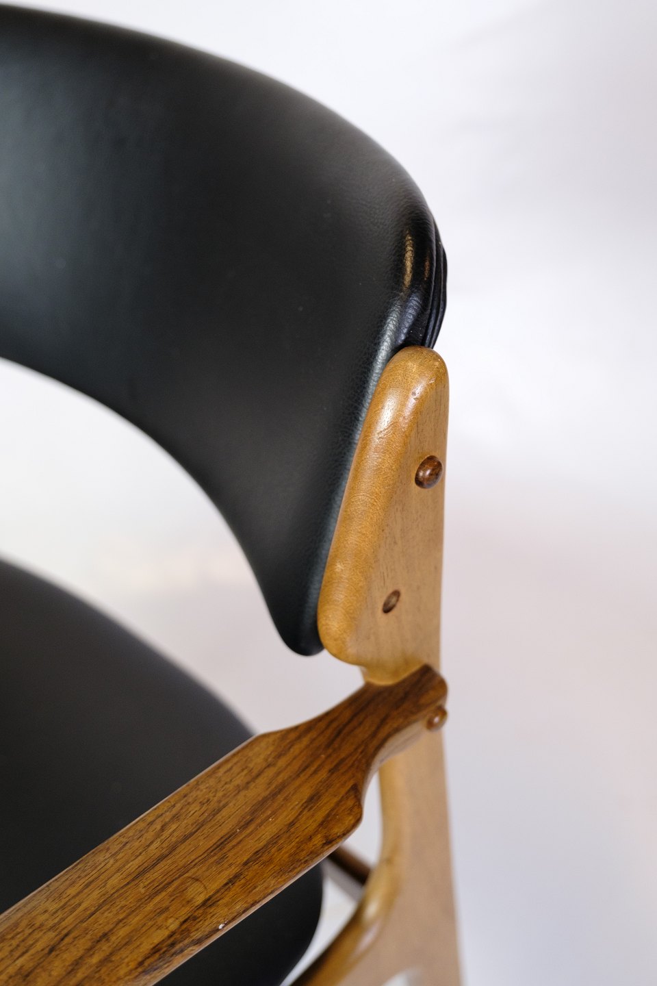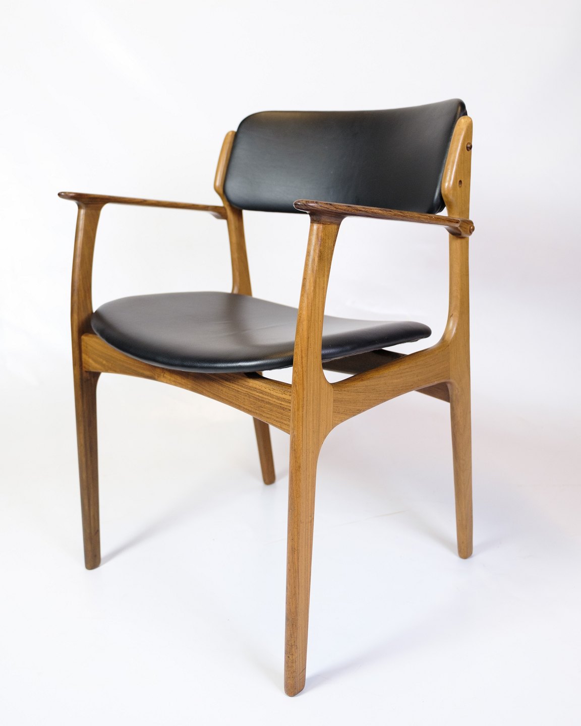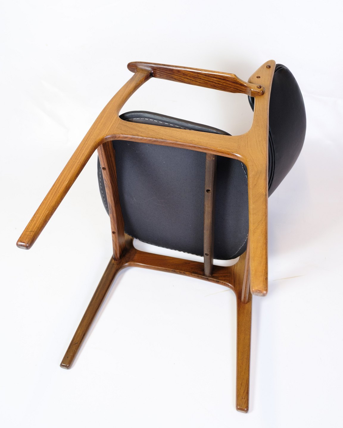 Sæt af to armstole, model OD50, designet af Erik Buch og fremstillet af O.D. Møbler i 1950’erne. Stolene er udført i palisander med sæder i sort læder og har det karakteristiske svævende sæde, som giver både visuel lethed og høj komfort. Erik Buch (1923–1982) var kendt for sit organiske formsprog og funktionelle tilgang til design, og hans møbler er i dag eftertragtede klassikere inden for dansk mid-century modern.