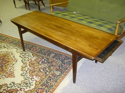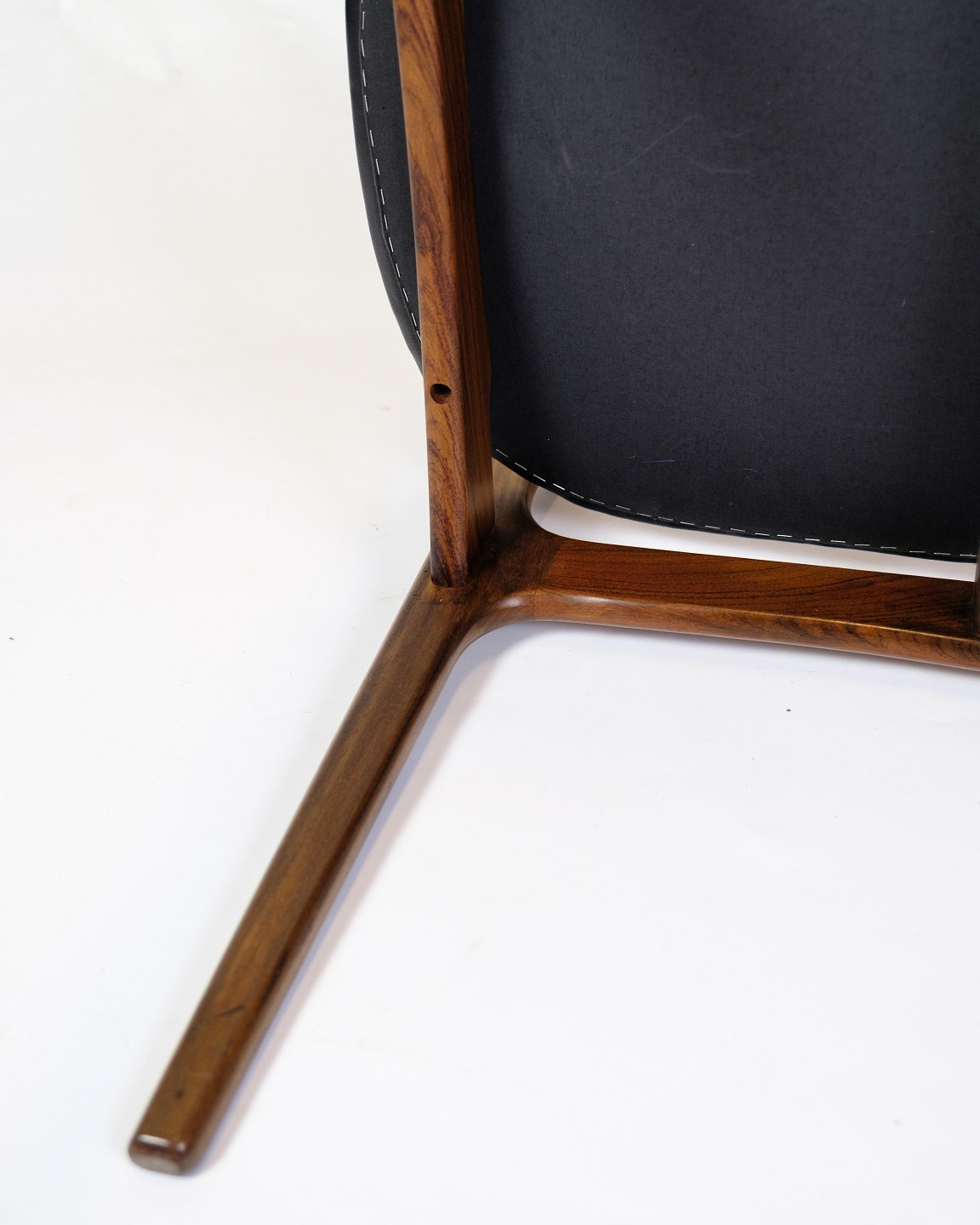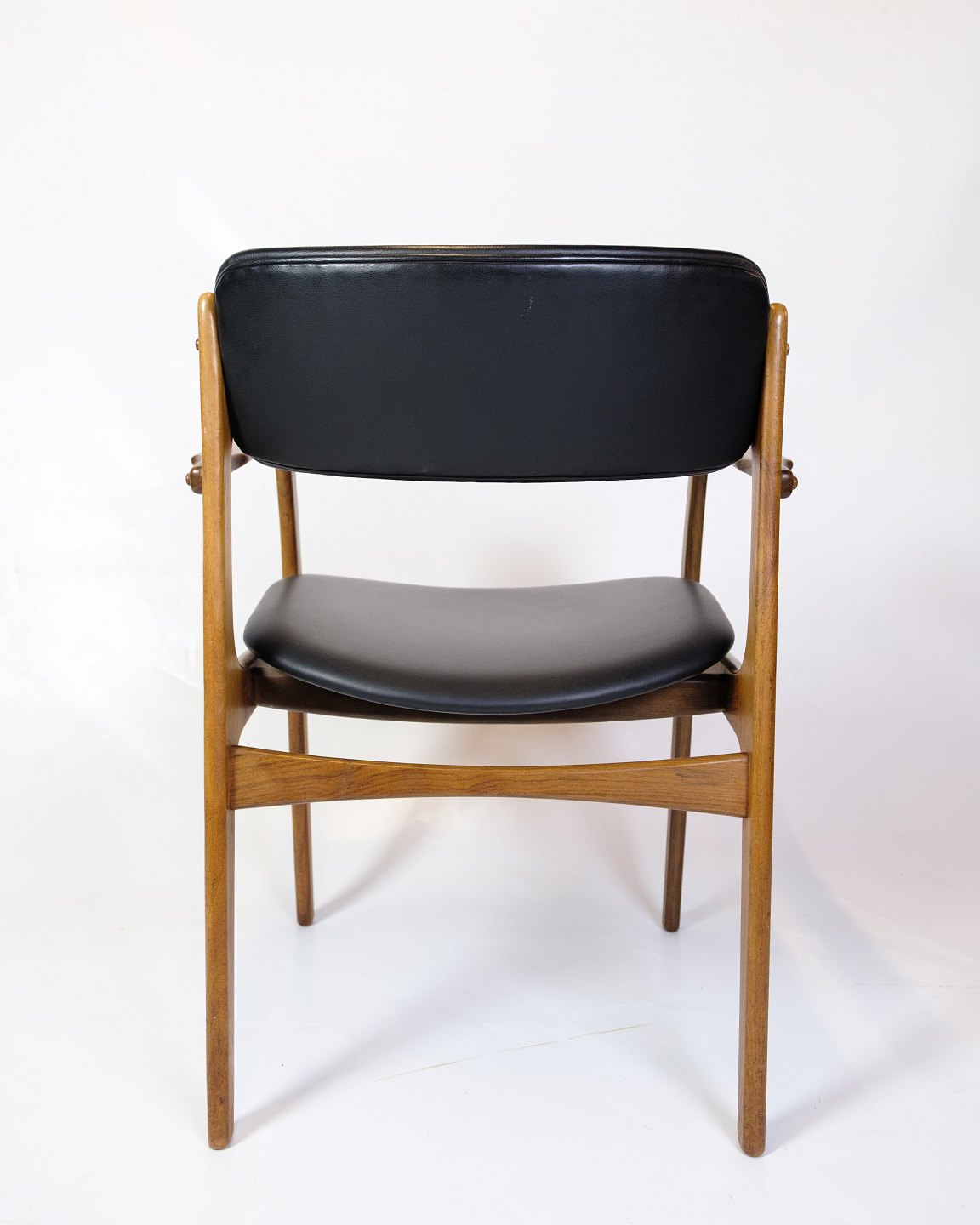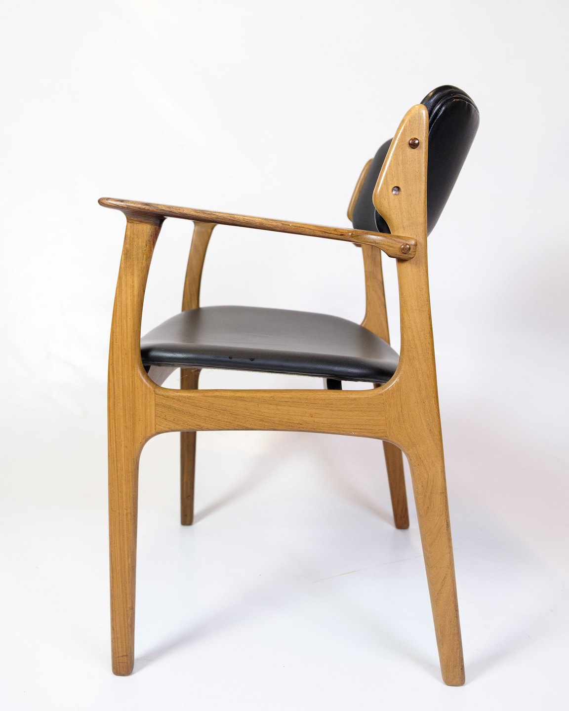 Sæt af to armstole, model OD50, designet af Erik Buch og fremstillet af O.D. Møbler i 1950’erne. Stolene er udført i palisander med sæder i sort læder og har det karakteristiske svævende sæde, som giver både visuel lethed og høj komfort. Erik Buch (1923–1982) var kendt for sit organiske formsprog og funktionelle tilgang til design, og hans møbler er i dag eftertragtede klassikere inden for dansk mid-century modern.