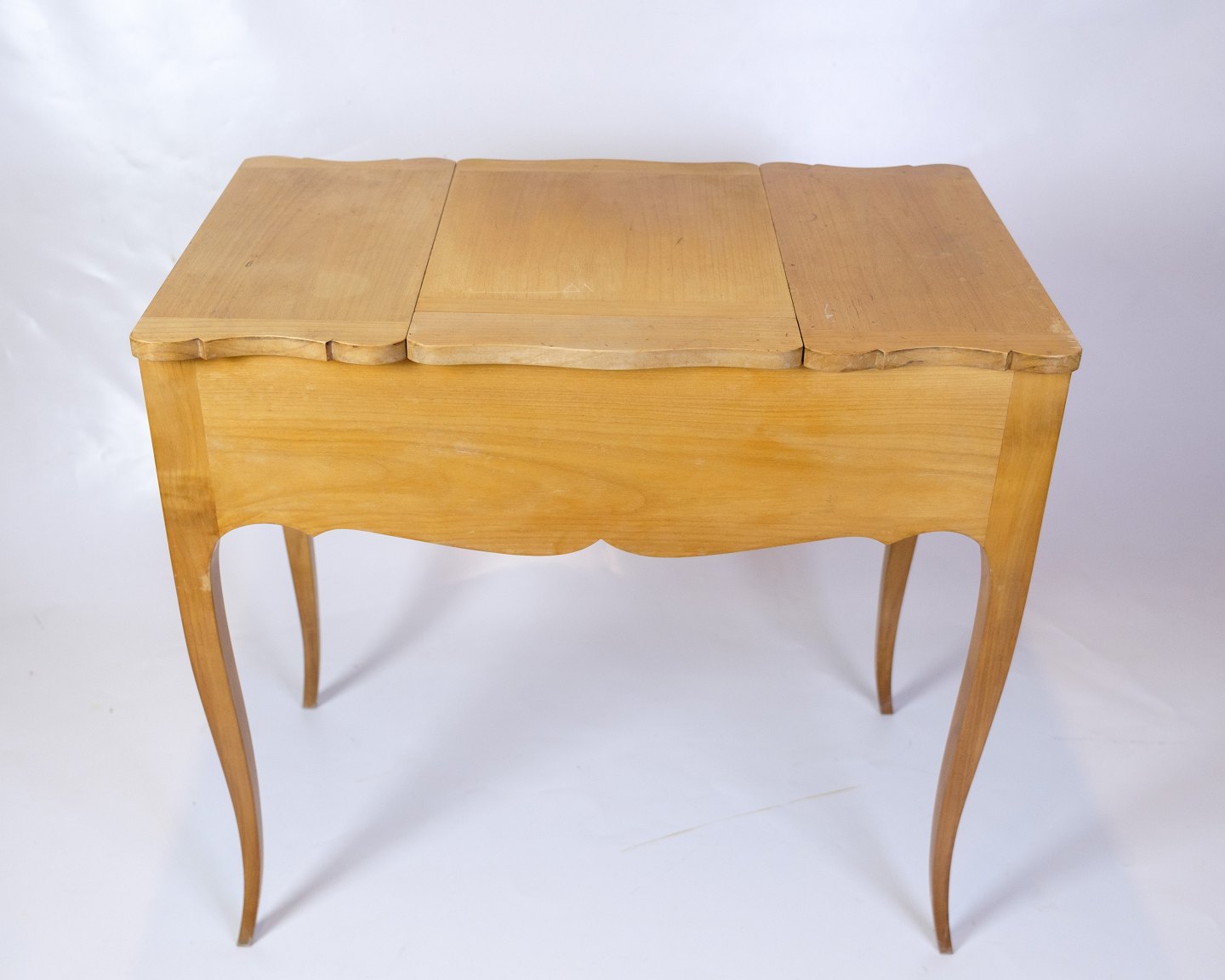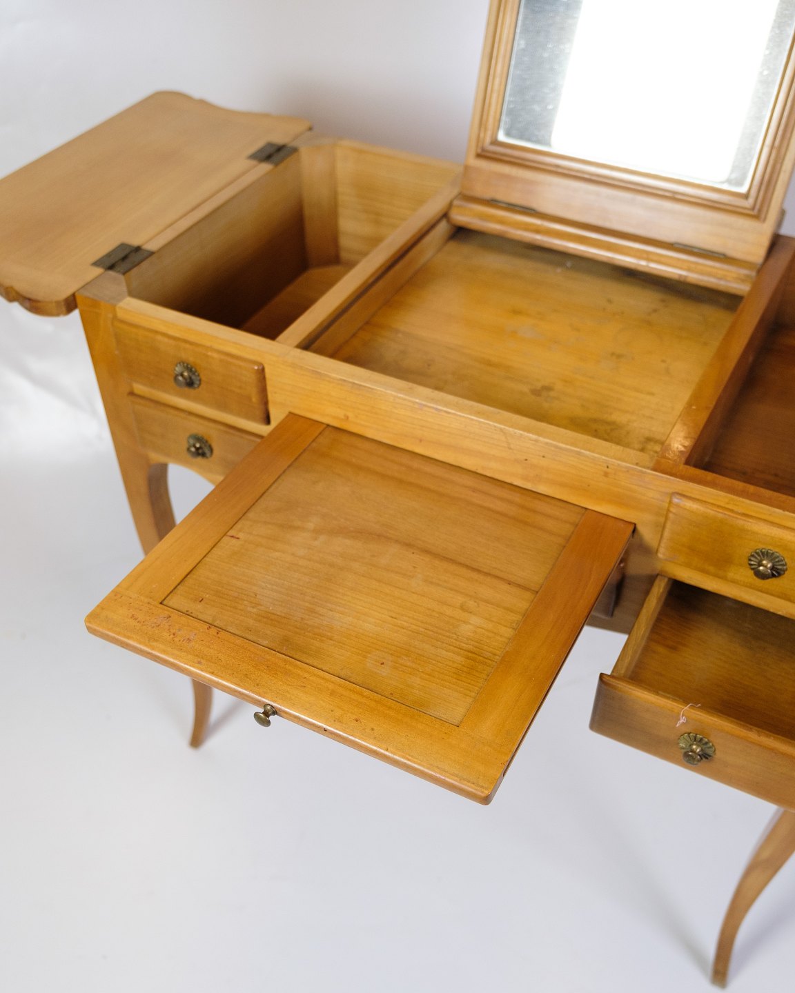 Dressing table with built-in drawers and mirror, made of light mahogany and designed in the Louis XV style from the 1920s. The table has curved legs, decorative carvings and classic details that characterize the period. An elegant and functional dressing table.