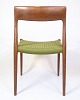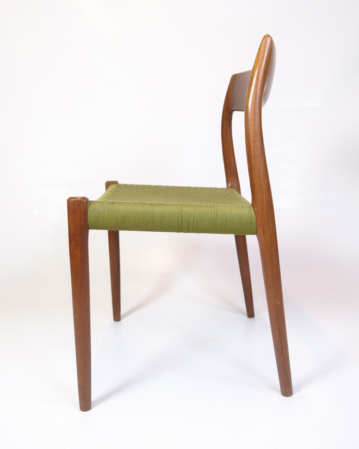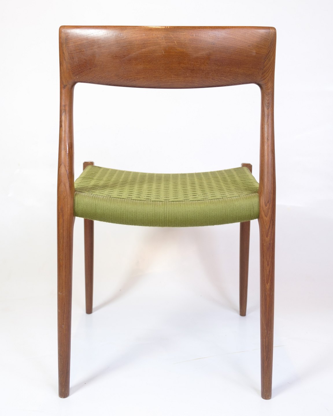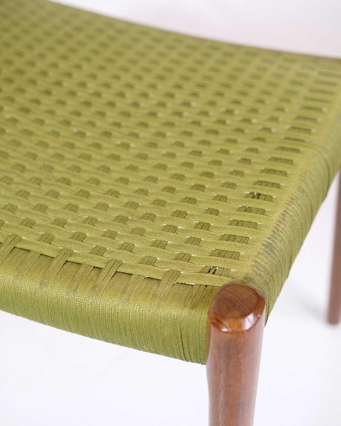 SoldSix dining chairs designed by Niels O. Møller in the 1960s. Model 77 is made of teak with seats in green paper wicker. The chair's simple lines and curved backrest provide good seating comfort and a clear design language that has made Møller's design a permanent part of Danish furniture history. A solid choice for both classic and modern interiors.