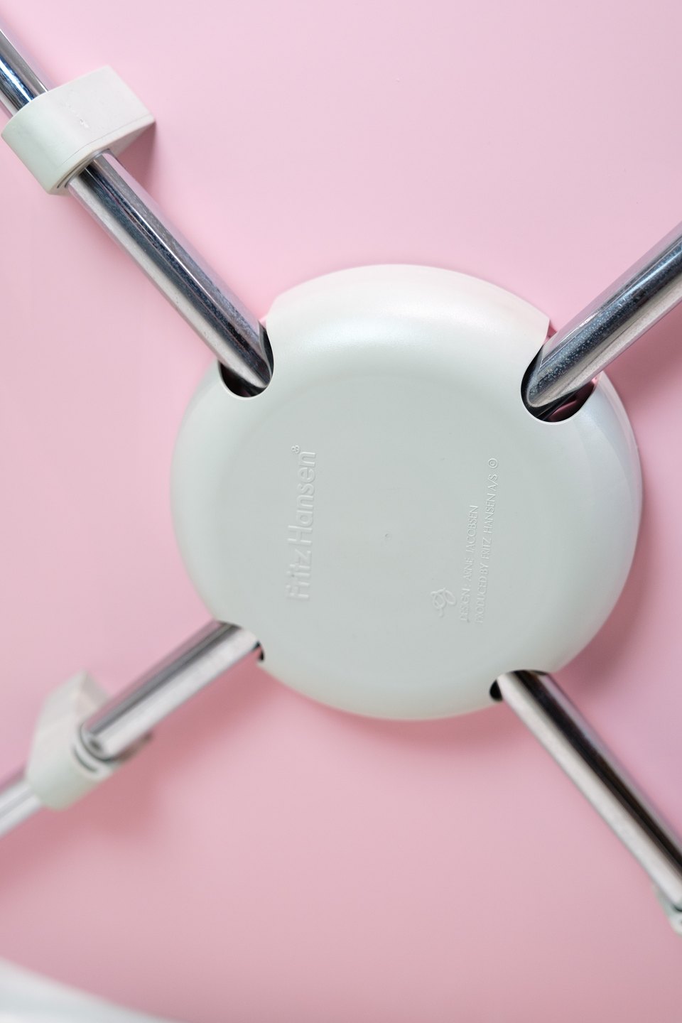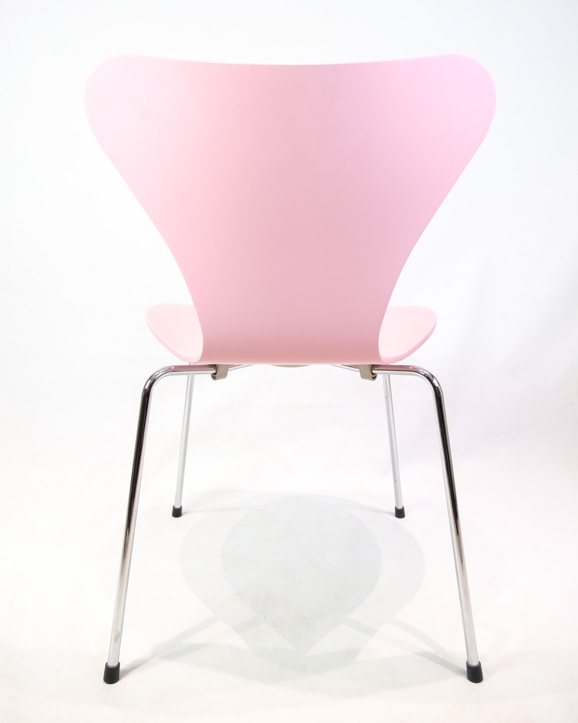 Sæt på 6 Syver-stole model 3107 i en lyserød lakering. Designet af Arne Jacobsen og fremstillet af Fritz Hansen.