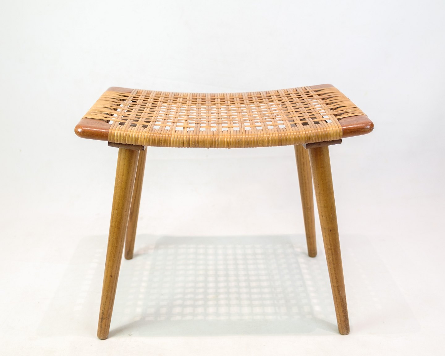 A classic Danish design stool from the 1960s with a frame made of teak and a seat in sage wicker. The stool is in beautiful used condition with original seat.