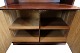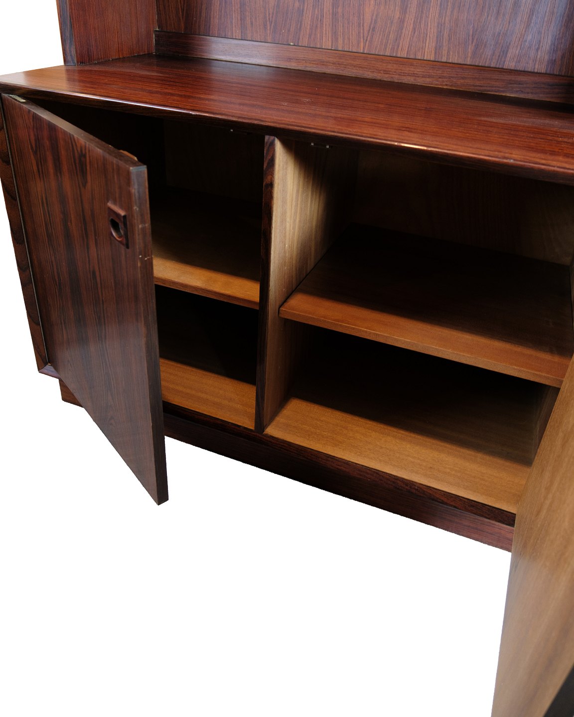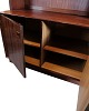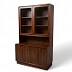 Skabet er udført i palisander med fremtrædende åring. Øverst findes justerbare hylder bag glaslågerne. Nederste del rummer fire rum bag to låger og tilbyder god opbevaringsplads.