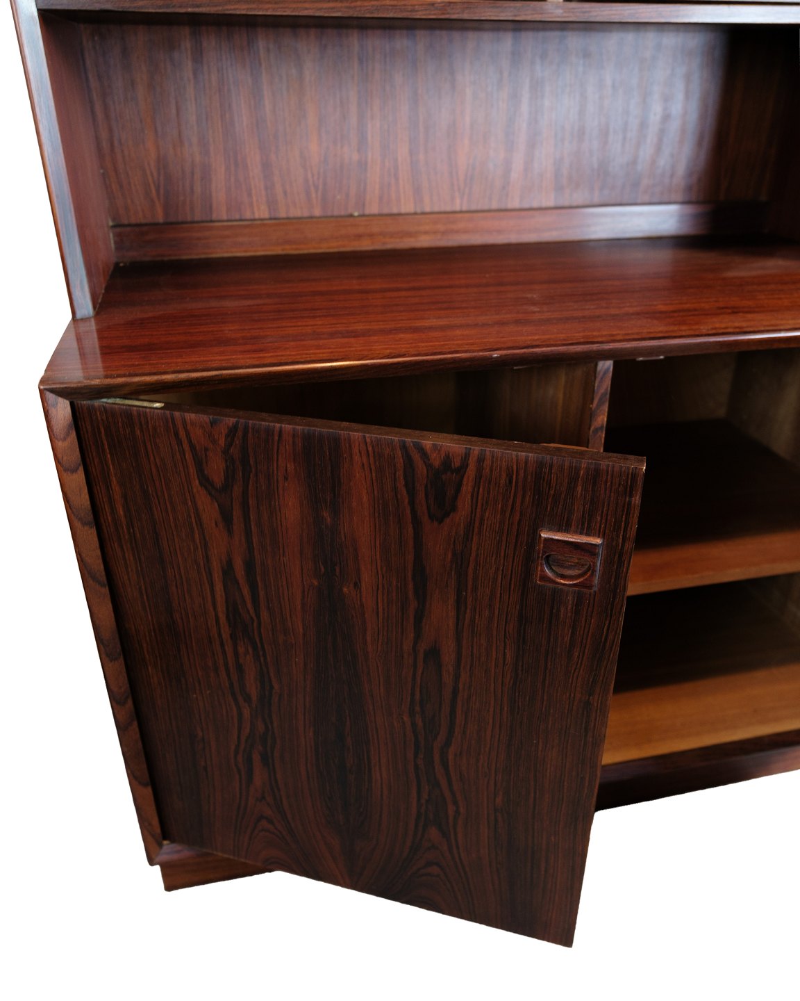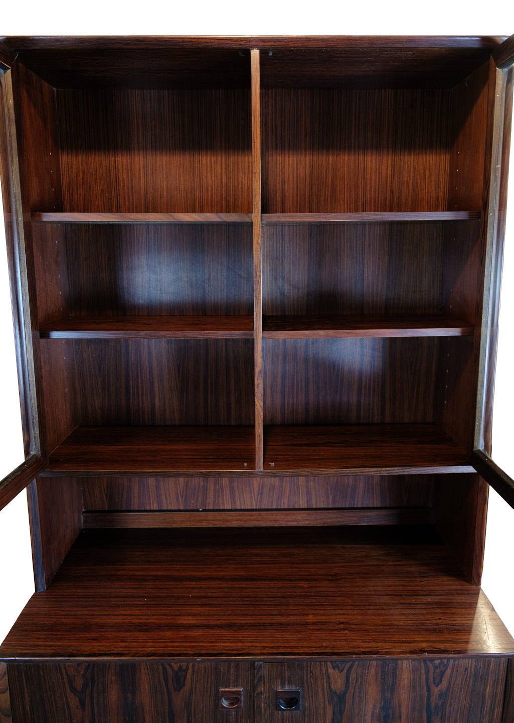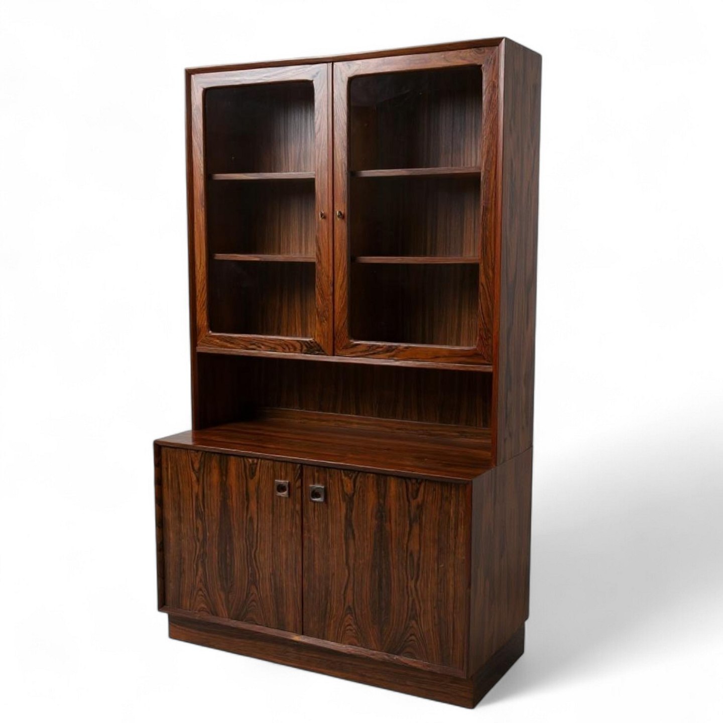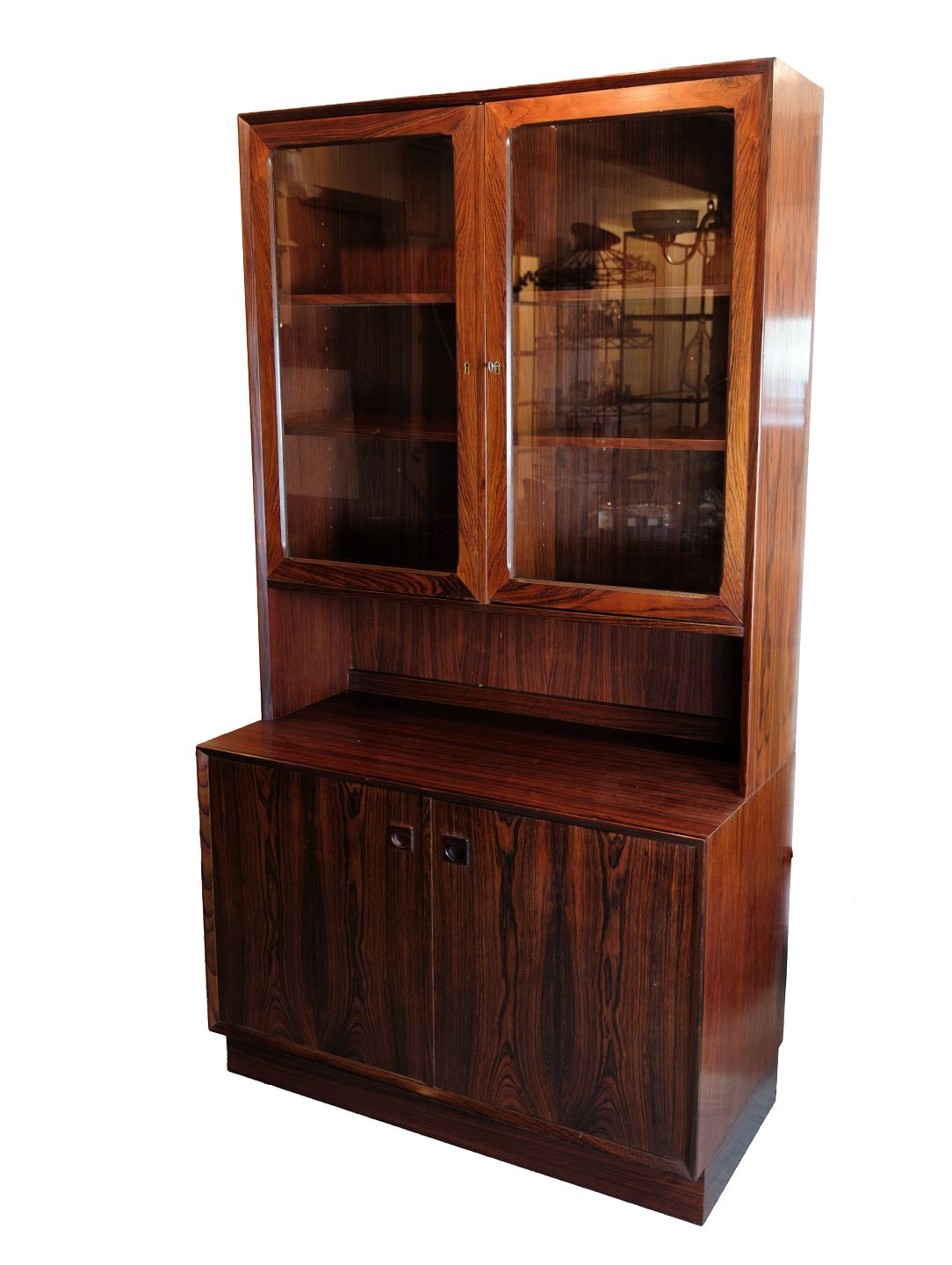 Vitrineskab i palisander designet af Erik Brouer i 1960’erne og fremstillet af Brouer Møbelfabrik. Skabet har overskab med glaslåger og underskab med trædøre.