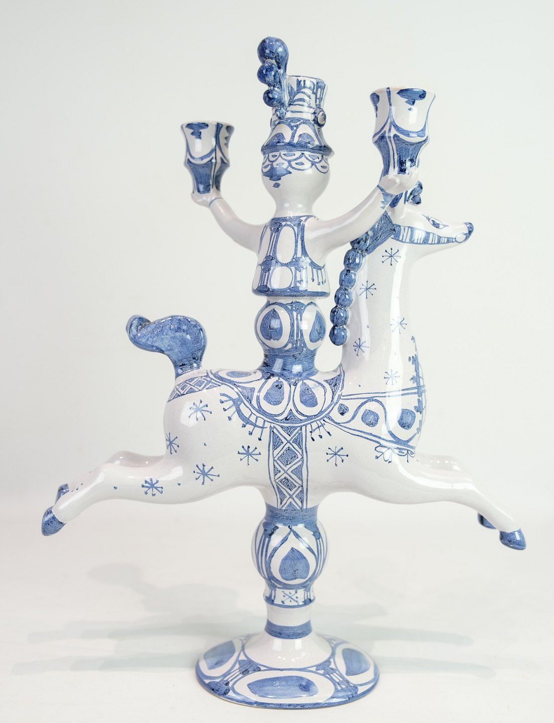 Bjørn Wiinblad equestrian candlestick in glazed earthenware from 1985. Signed, decorated in blue and white. A figurative classic with three candle holders.
