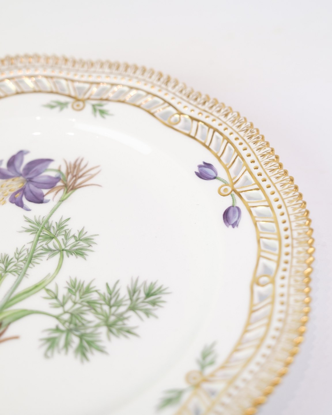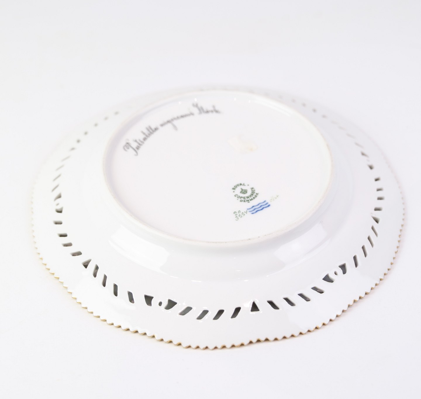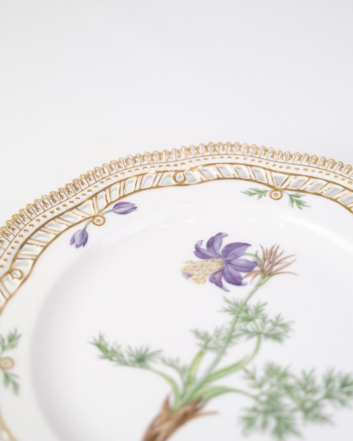 Hand-painted lunch plate from Royal Copenhagen's Flora Danica series, made of porcelain and decorated with a motif. Decoration number. 20/3554. The plate has an openwork lace edge and a gold finish.
