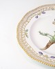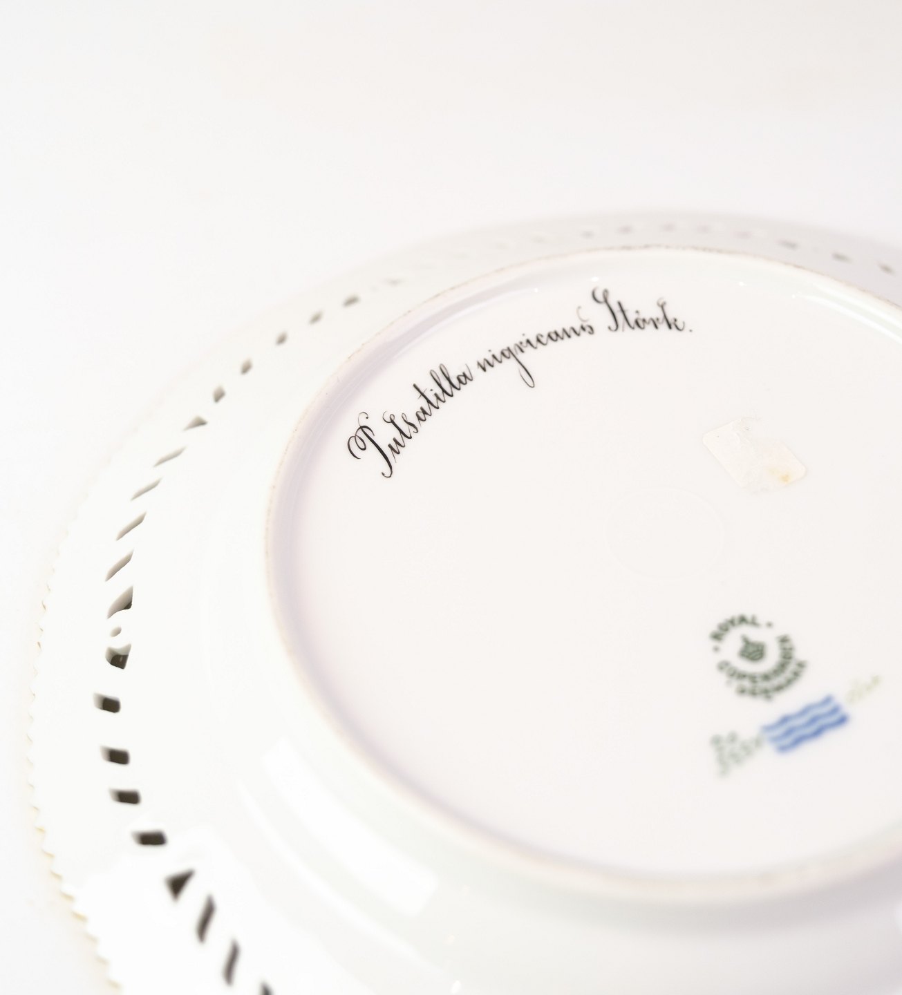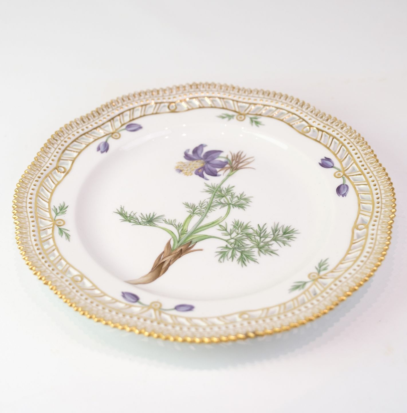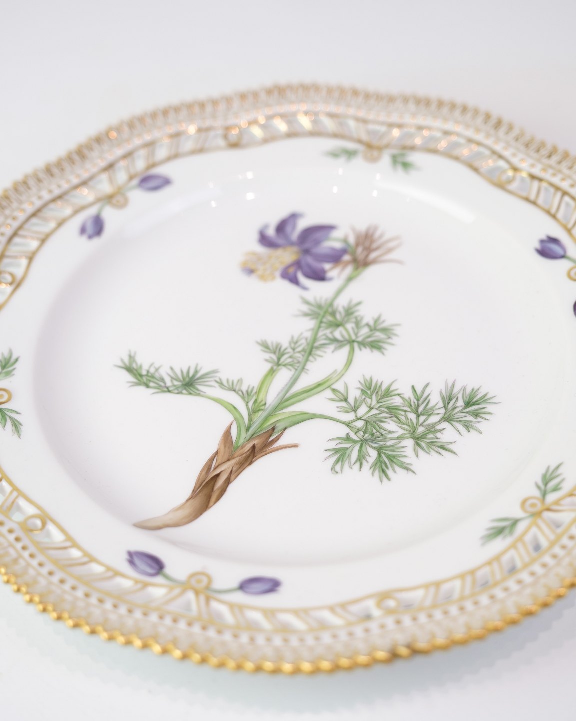 Hand-painted lunch plate from Royal Copenhagen's Flora Danica series, made of porcelain and decorated with a motif. Decoration number. 20/3554. The plate has an openwork lace edge and a gold finish.
